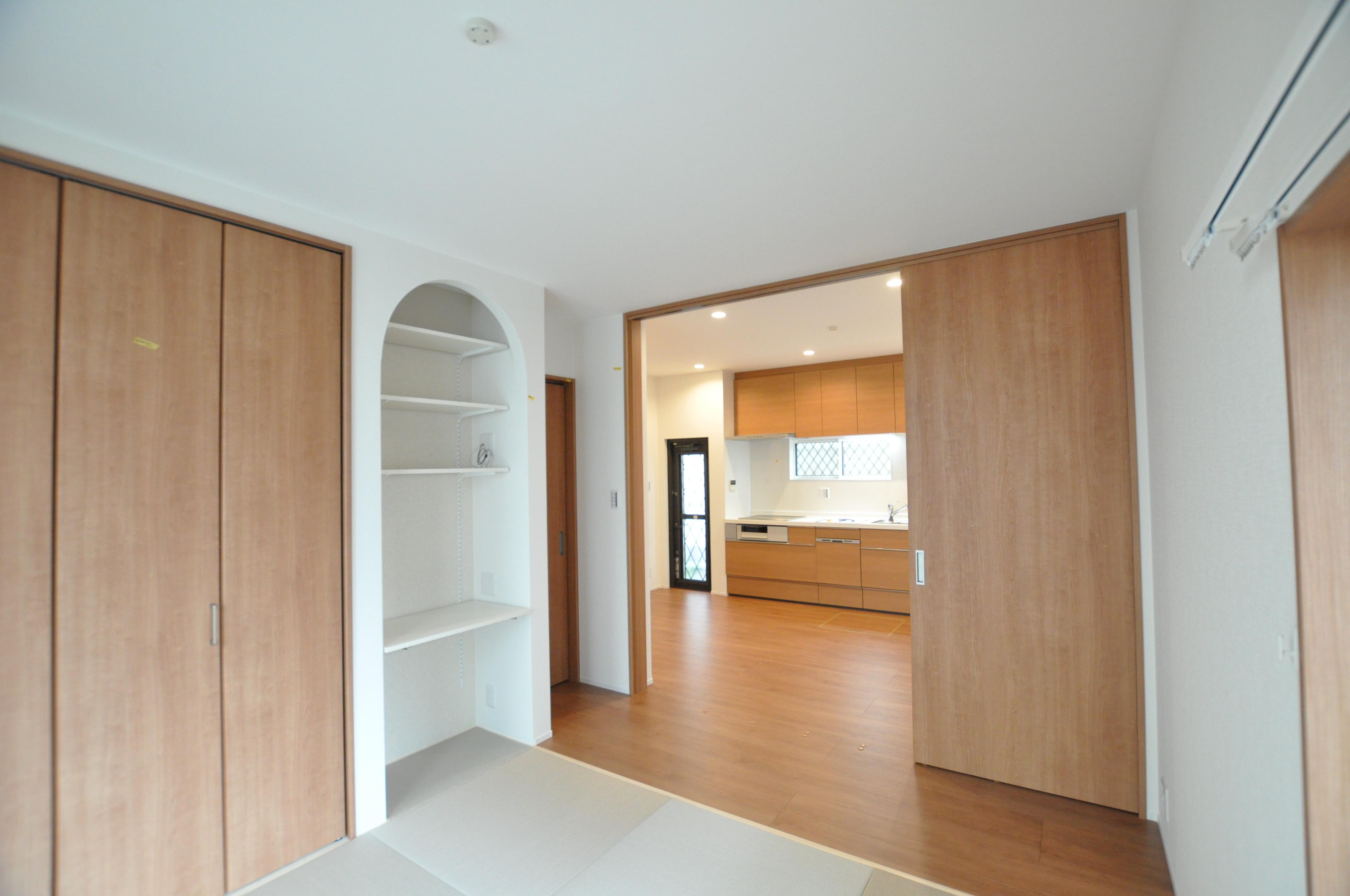 また、DKと和室間の建具の開口幅・高さを共に大きくする事でオープン時には一体感がうまれ広く感じられます。