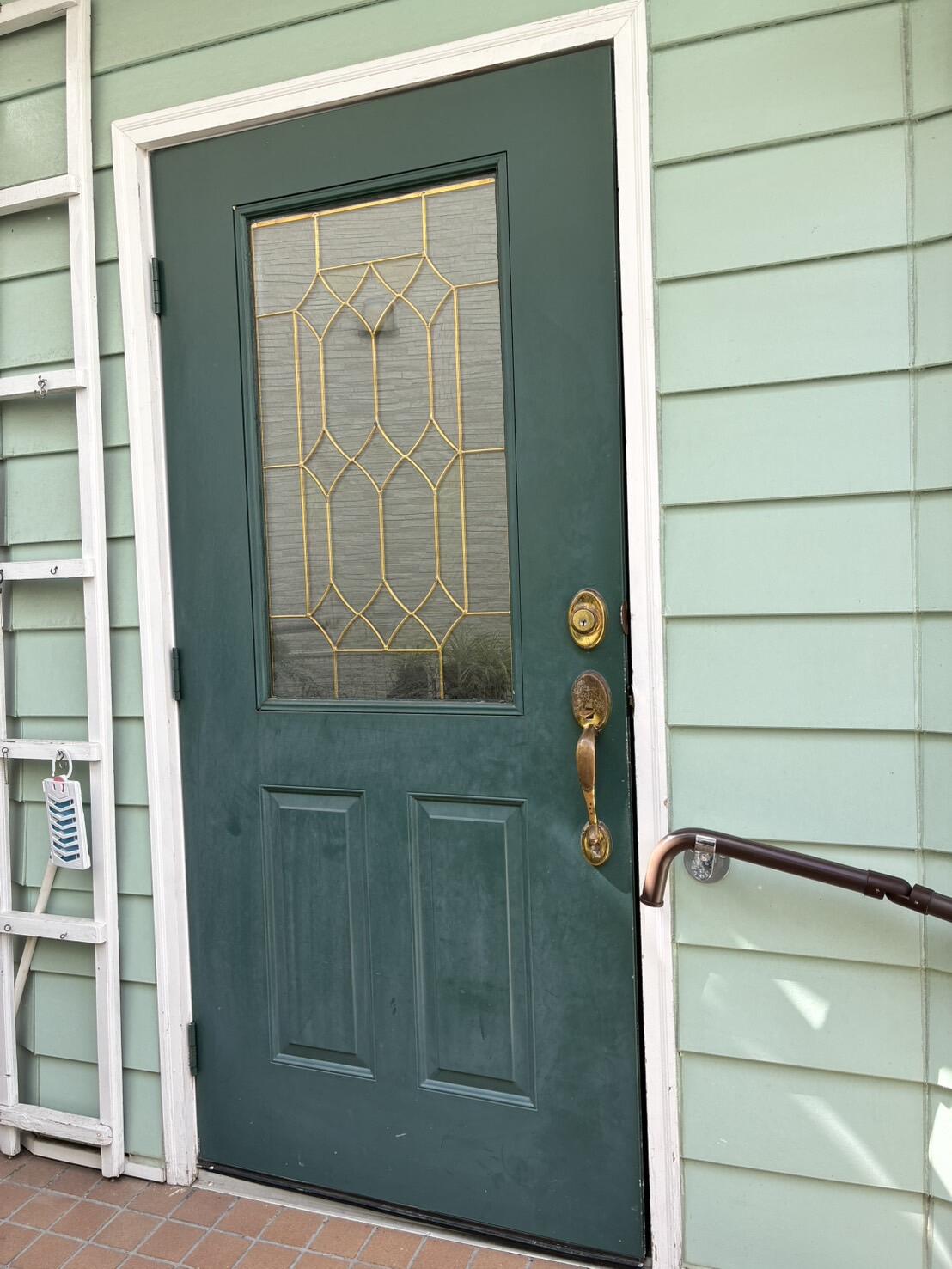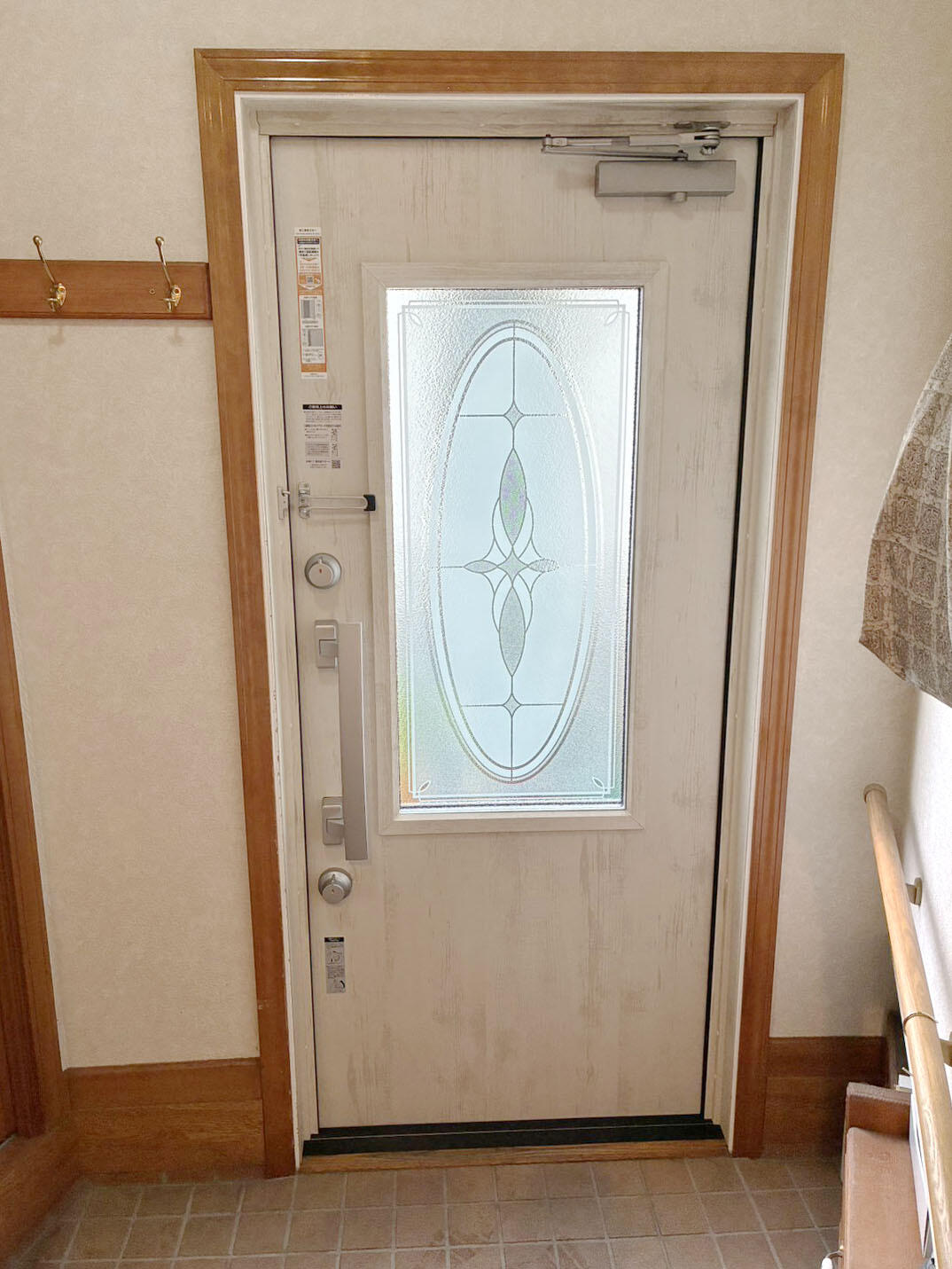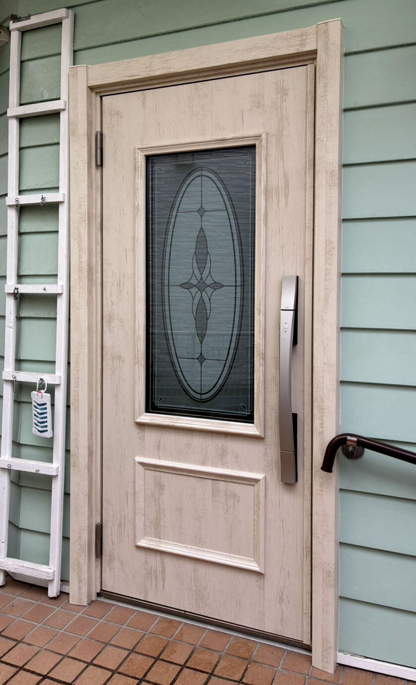玄関ドアは、既存のドア枠を利用してリフォームできる、LIXIL「リシェント」。3時間ほどで取替えが可能です。断熱仕様なので、玄関の寒さが軽減されました。カラーは外壁のグリーンにも調和する「エクリュアイボリー」。