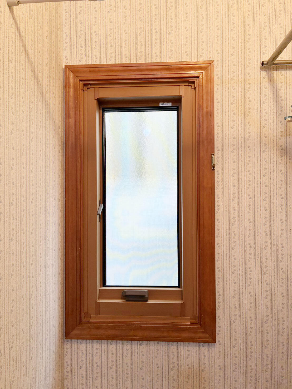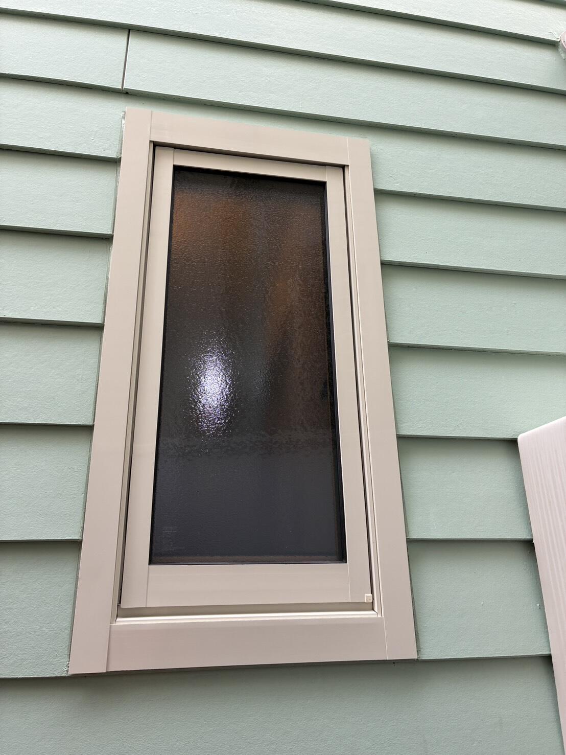 冬の寒さの気になる洗面脱衣室の窓はLIXIL「リプラス」に変更し、寒さを軽減。型ガラスにすることで外からの視線も気にならなくなりました。