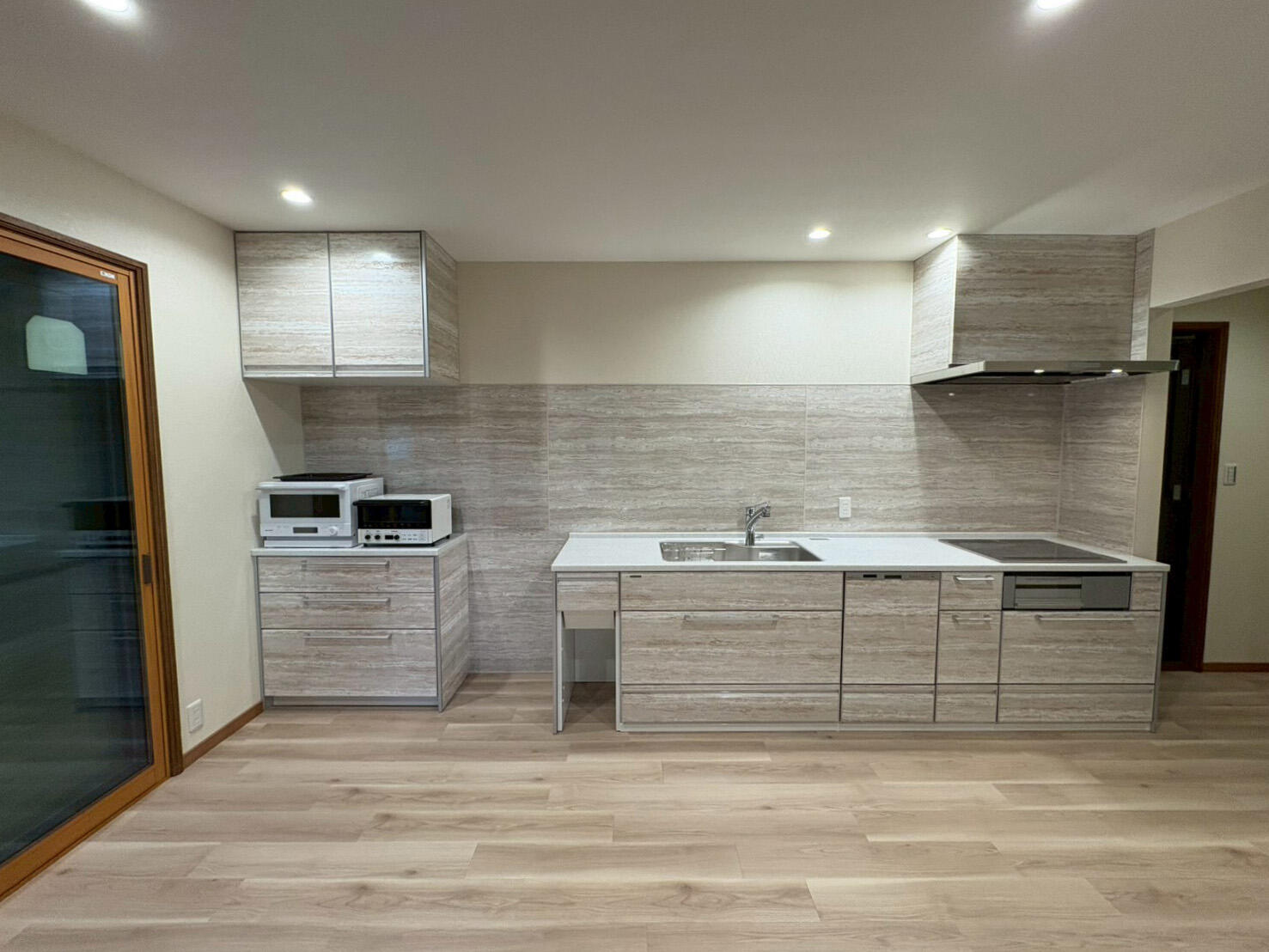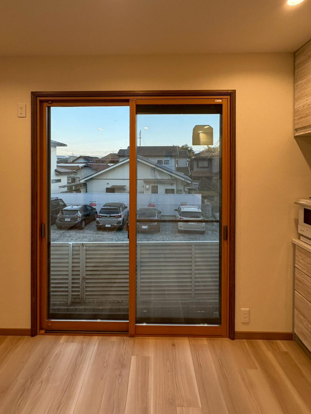 元々はL字型の対面キッチン。吊り戸棚で暗くなってしまうことと、リビング空間が狭くなることが気になっていたため、壁付けにレイアウトを変更。LDK空間が無駄なく広く使えるようになりました。大きな窓には内窓「インプラス」も設置。 照明も、ダウンライトとライティングレールに変更し、よりすっきりとした空間に。