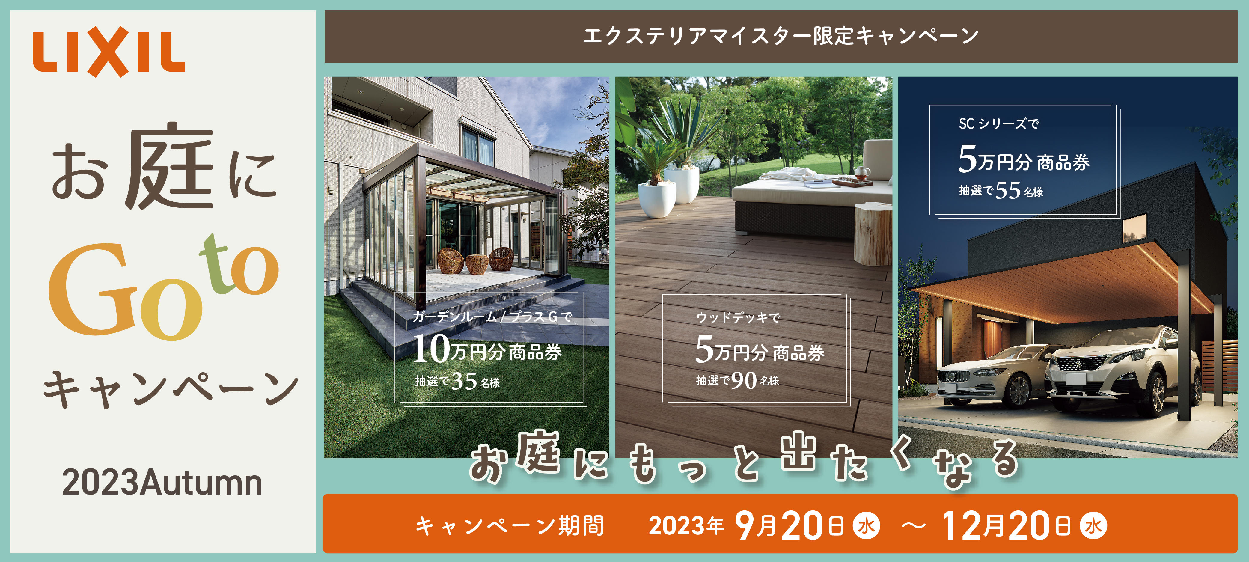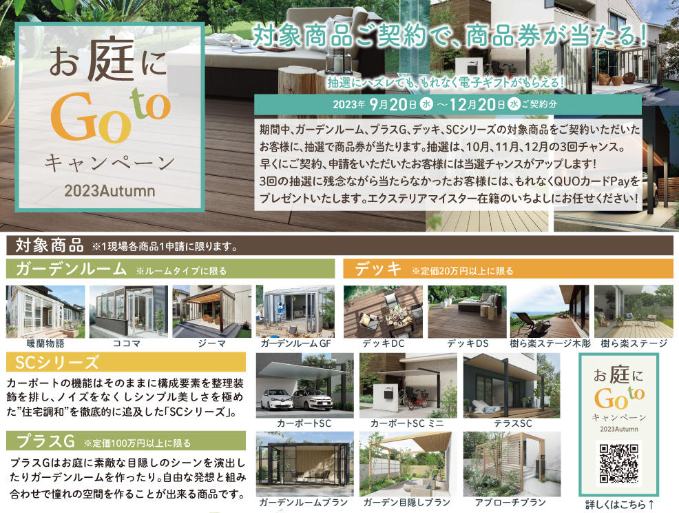 期間中、ガーデンルーム、プラスG、デッキ、SCシリーズの対象商品をご契約いただいたお客様に、抽選で商品券が当たります。抽選は、10月、11月、12月の3回チャンス。