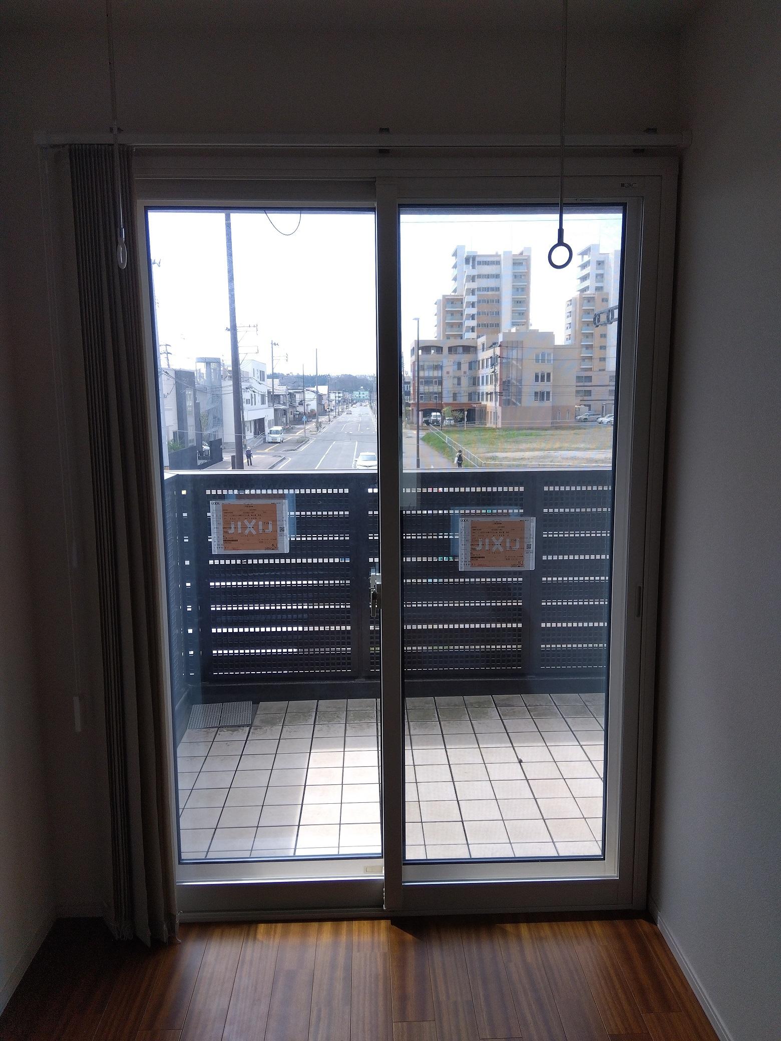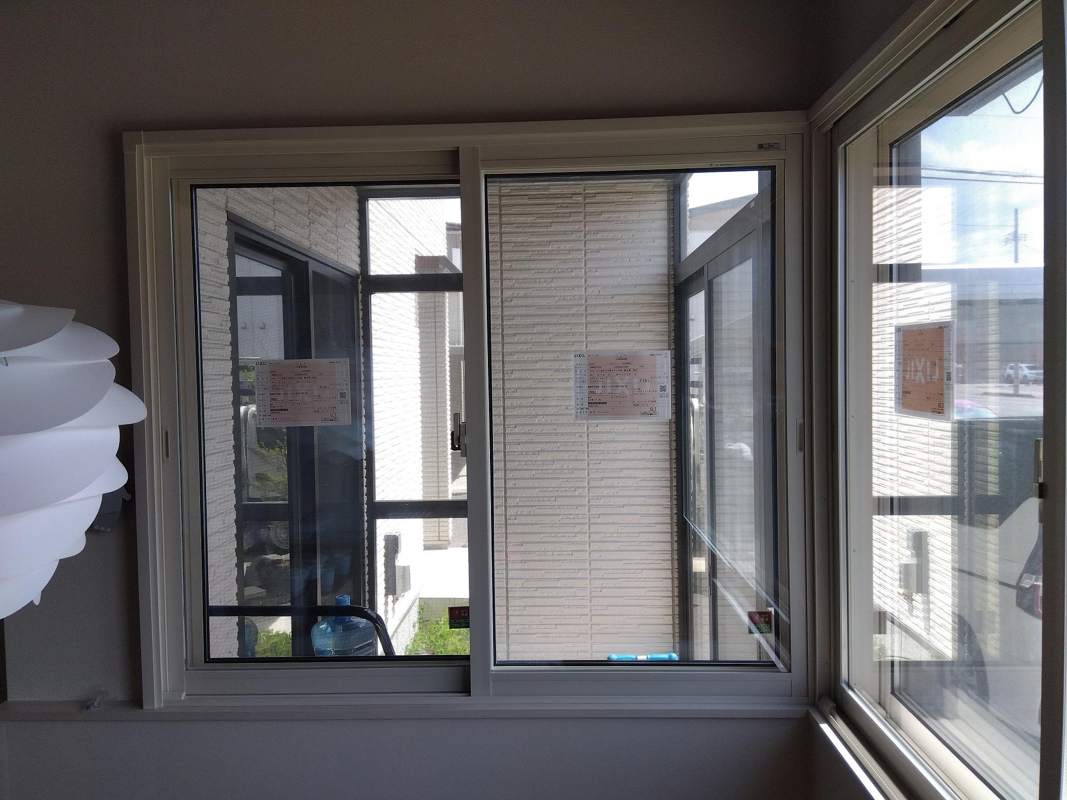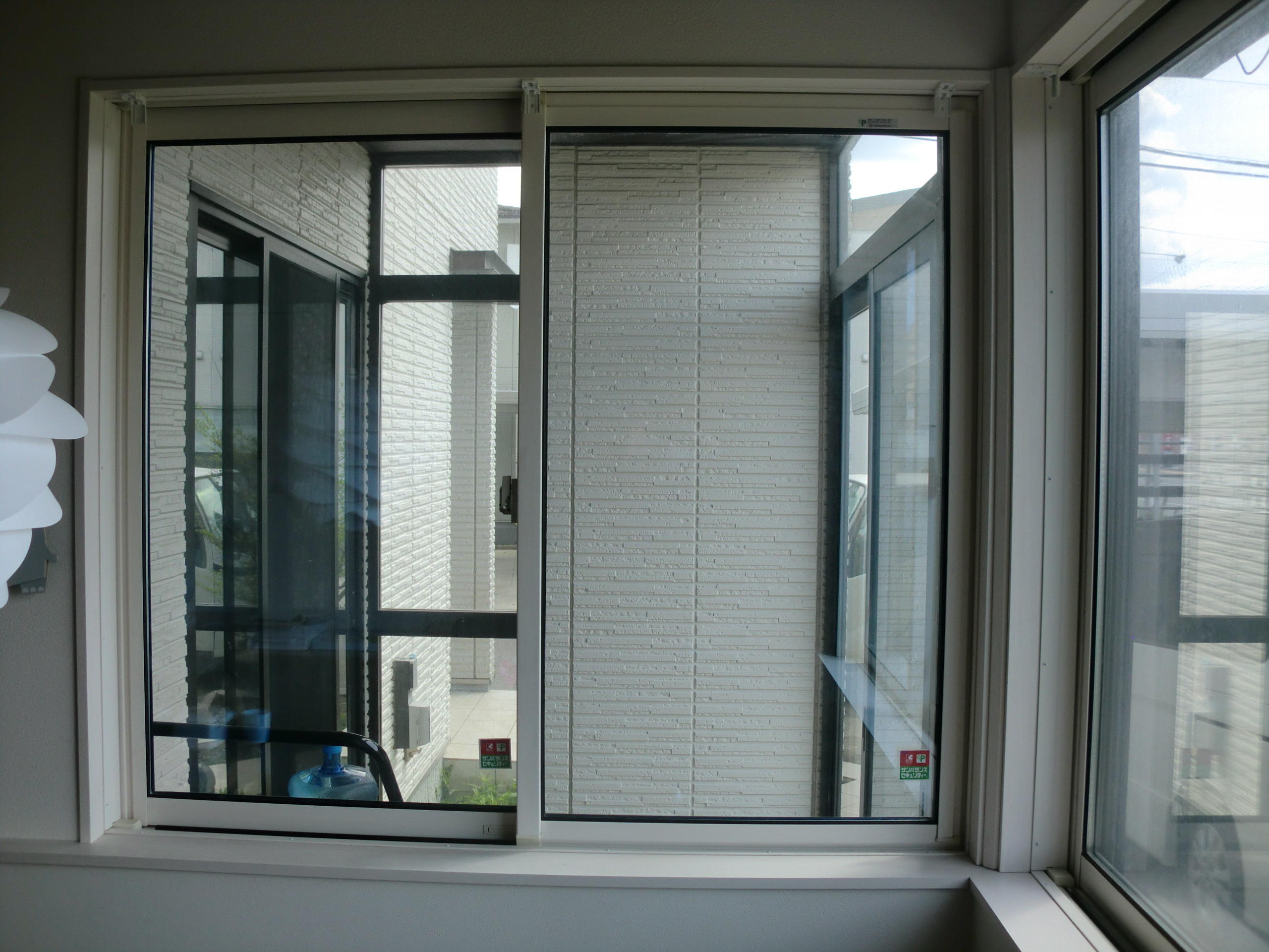 内窓(インプラス)を4ヶ所設置させていただきました。 引違窓のL型コーナー連窓と掃き出しテラス窓2ヶ所。 窓枠の見込みが少ないため、ふかし枠を取付けました。