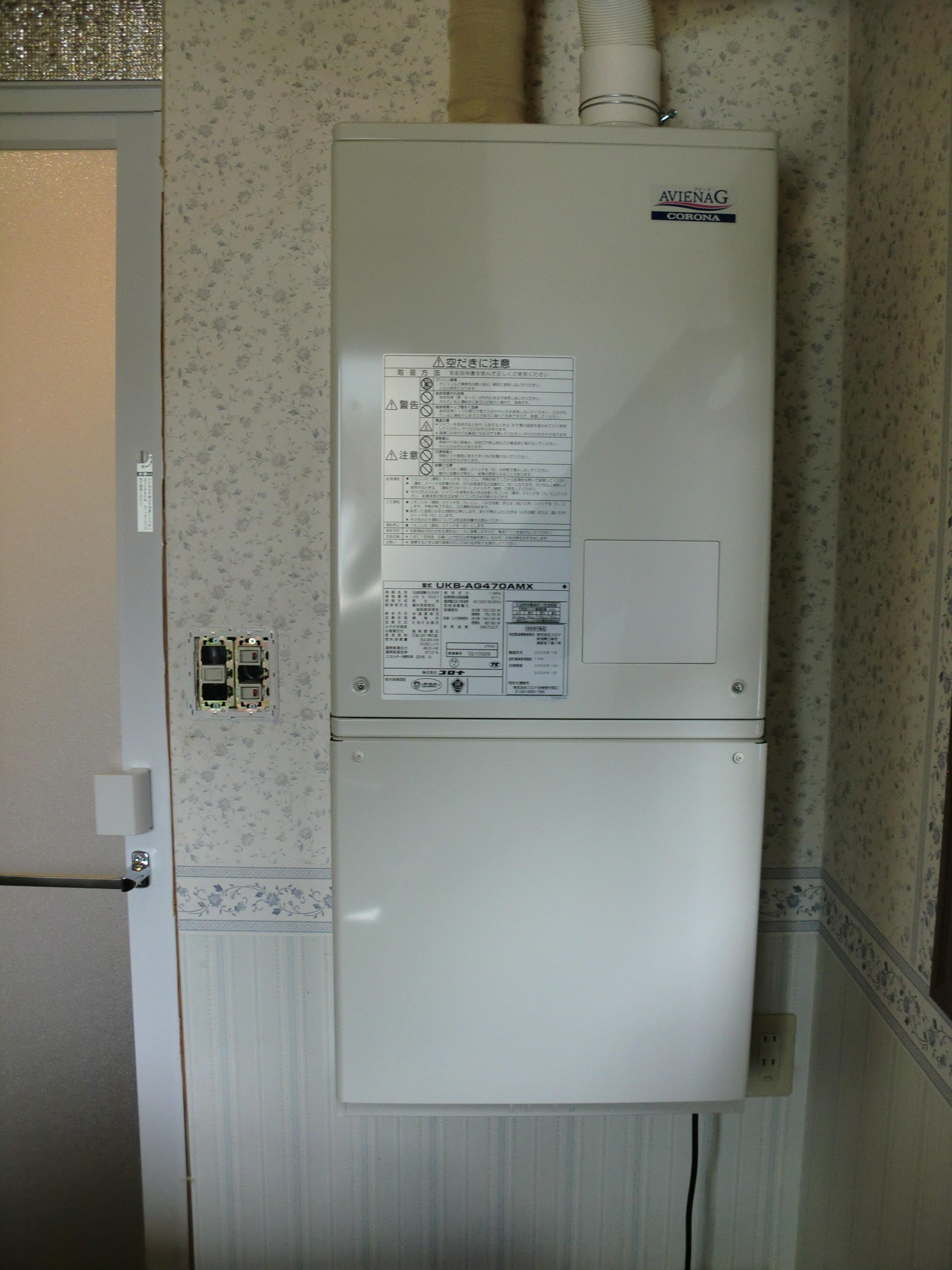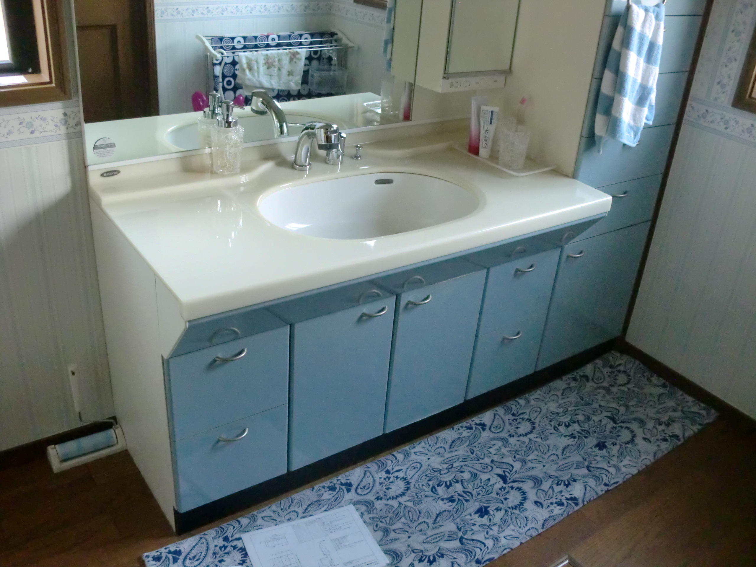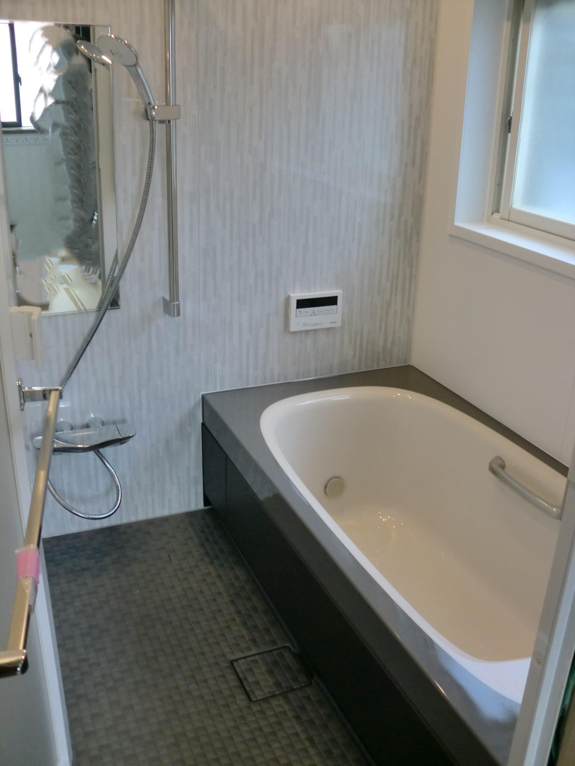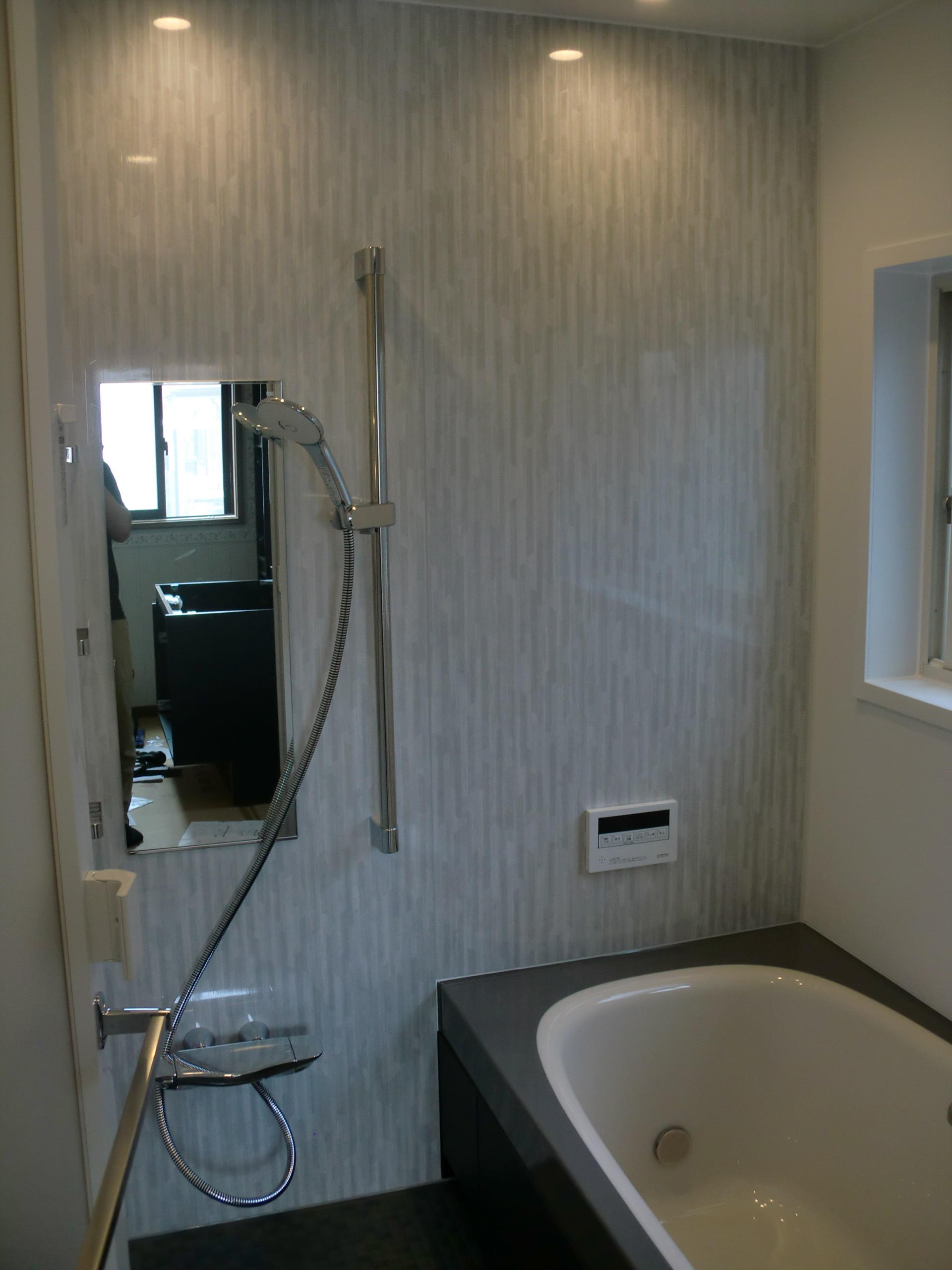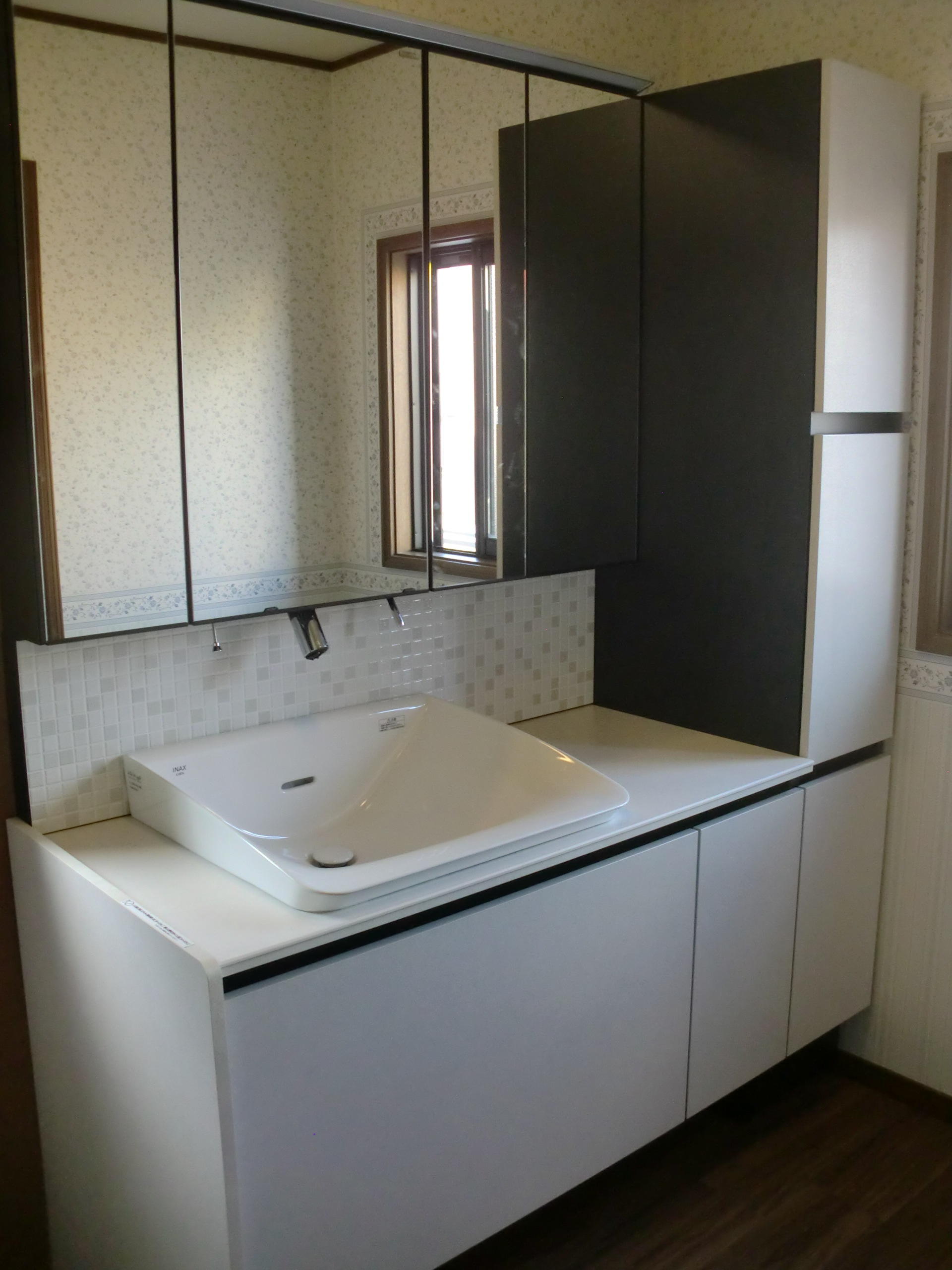 浴室ユニットバスはスパージュBXタイプ、洗面化粧台はルミシスのハイバックベッセルタイプに取替え、 ボイラーも取替え、洗面所の壁一部にエコカラットを施工しました。