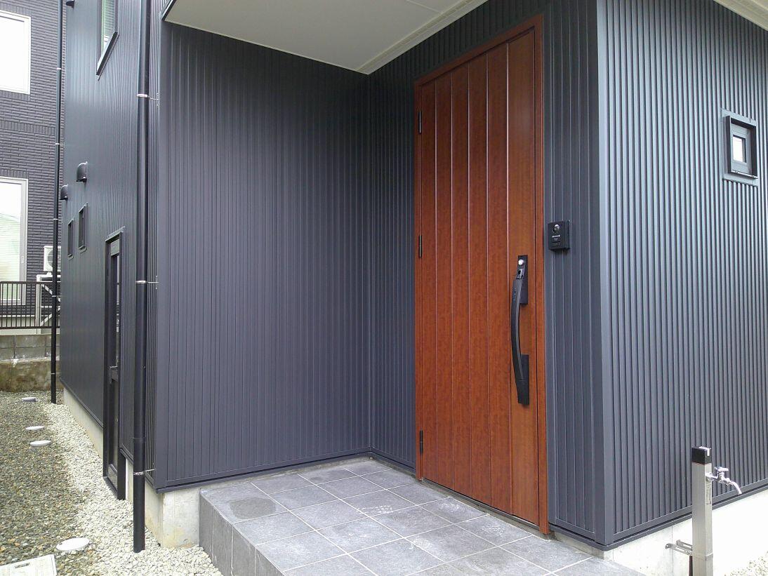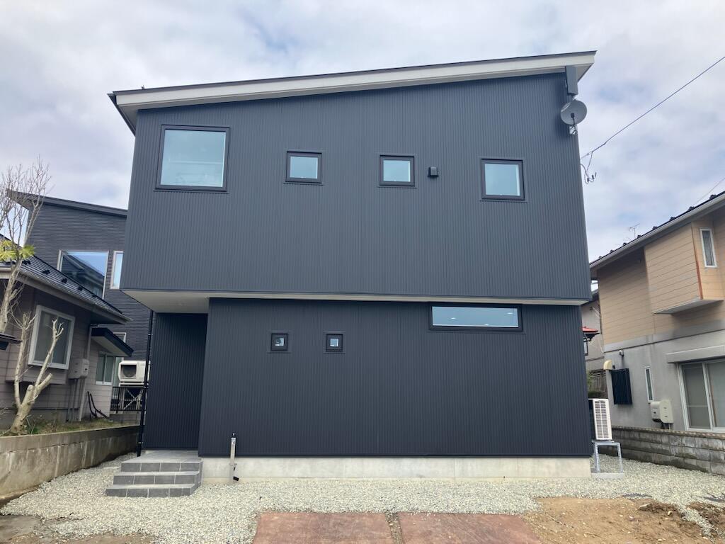 木造2階建ての新築住宅です。 外構工事が時期的に難しいため、後工事になりました。 外装は金属サイディングで継目無しの特注長さにしています。