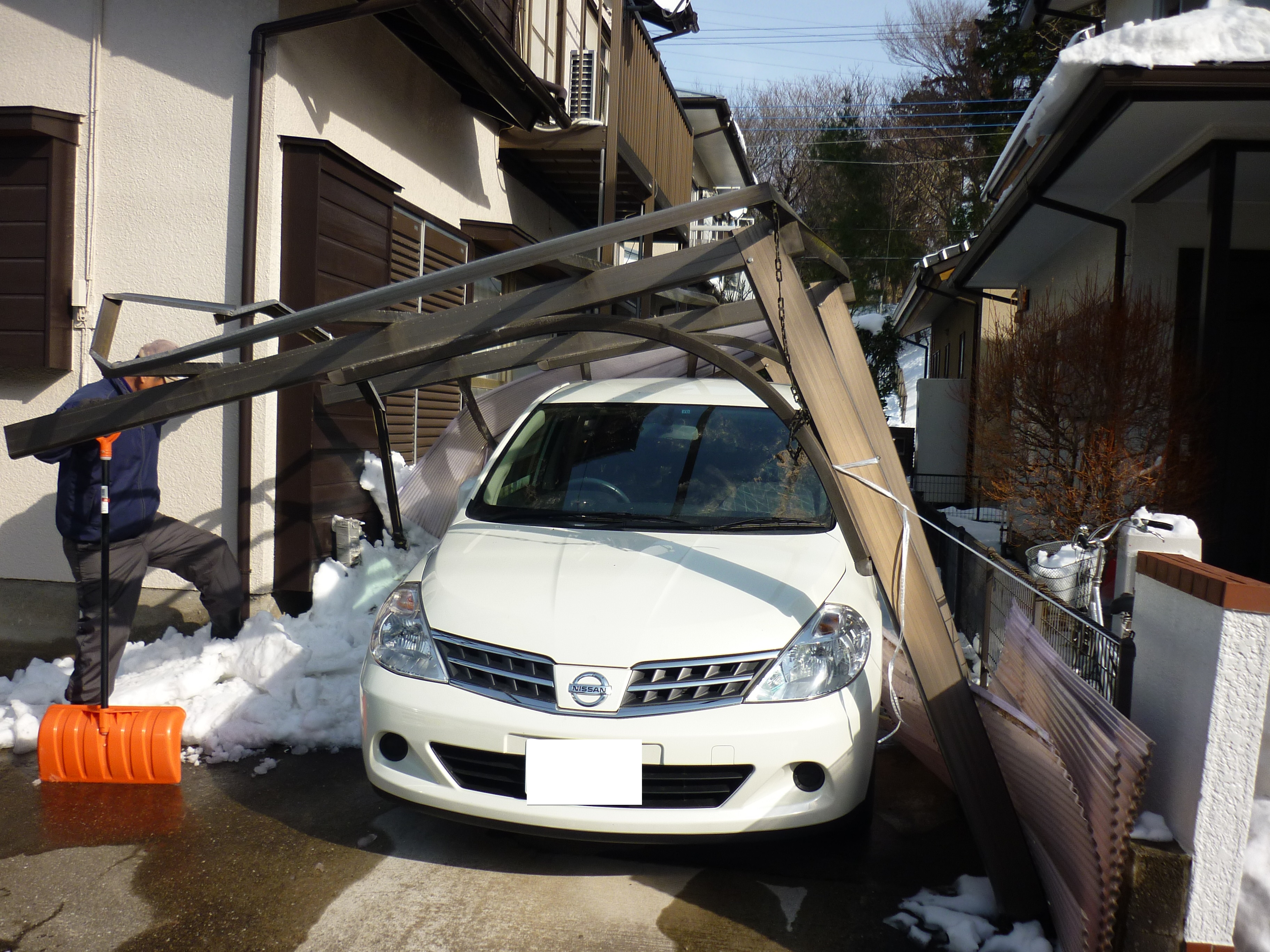 大雪の被害を受けた物件です。 やはりこちらのお宅でも、車が出せない状態でした。