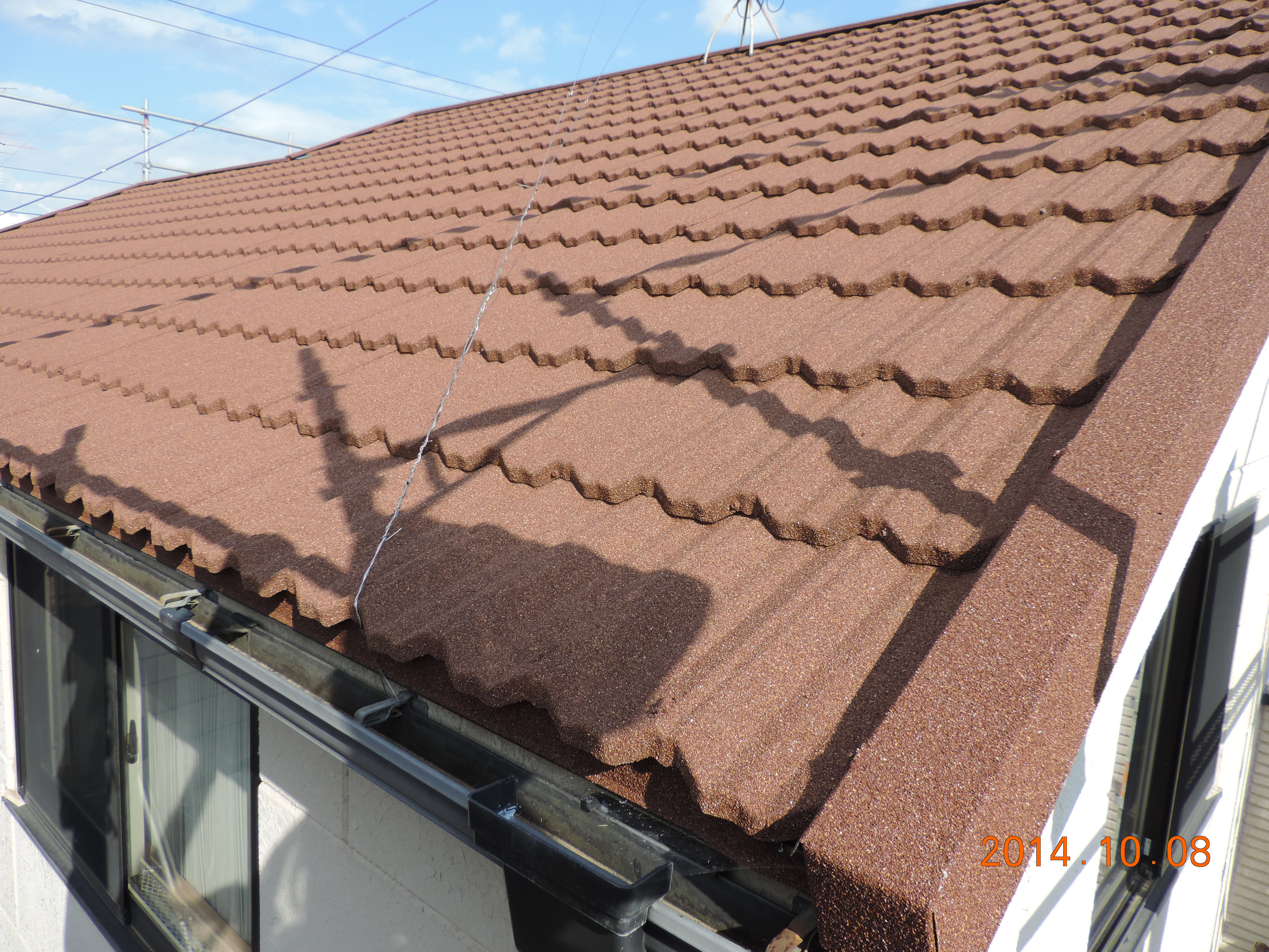 屋根張替工事の現場です。 LIXILのT-ルーフに張替えました。 T-ルーフは、軽くて丈夫なガルバニウム屋根材です。天然石チップは自然の色合いで 長期間塗り替えの必要がないので大変お勧めです。