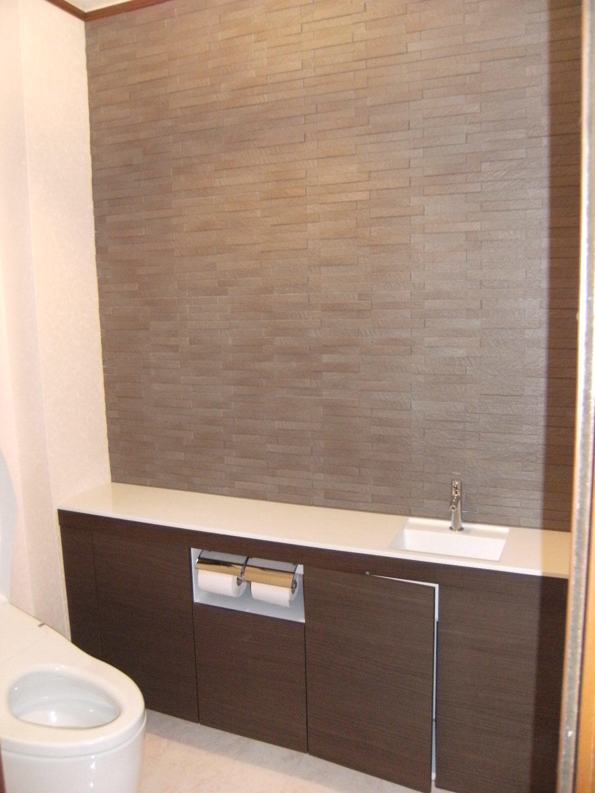 広いトイレ空間にしたいとのご要望により、小便器の撤去、手洗カウンターの設置、便器の向きを変えました。壁面にはエコカラットを施工しトイレの臭いもスッキリ、ちょうどいい湿度を保ってくれます。