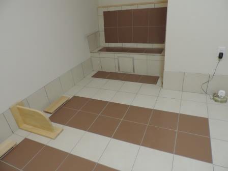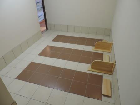 陶板浴室の新設工事が終了しました。 もともとは和室だった部屋に床に3床とベンチ式の陶板浴を1つ作りました。