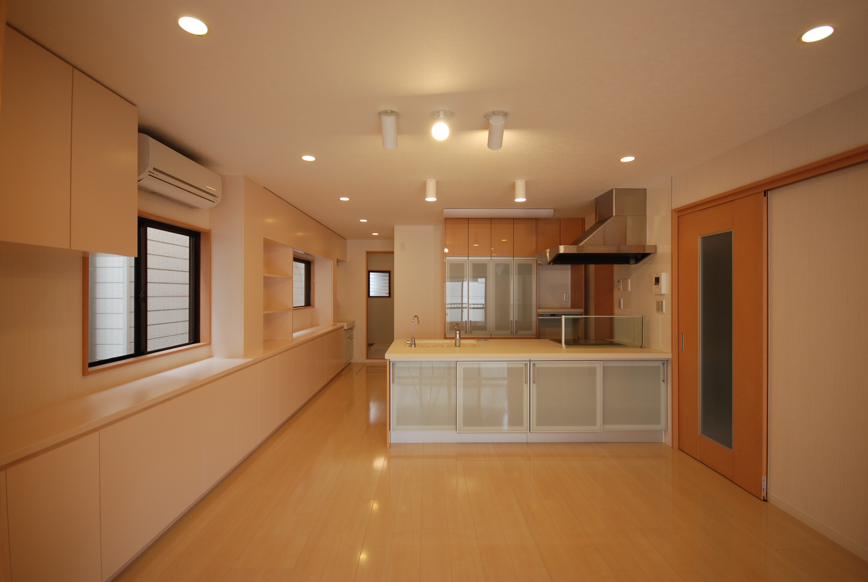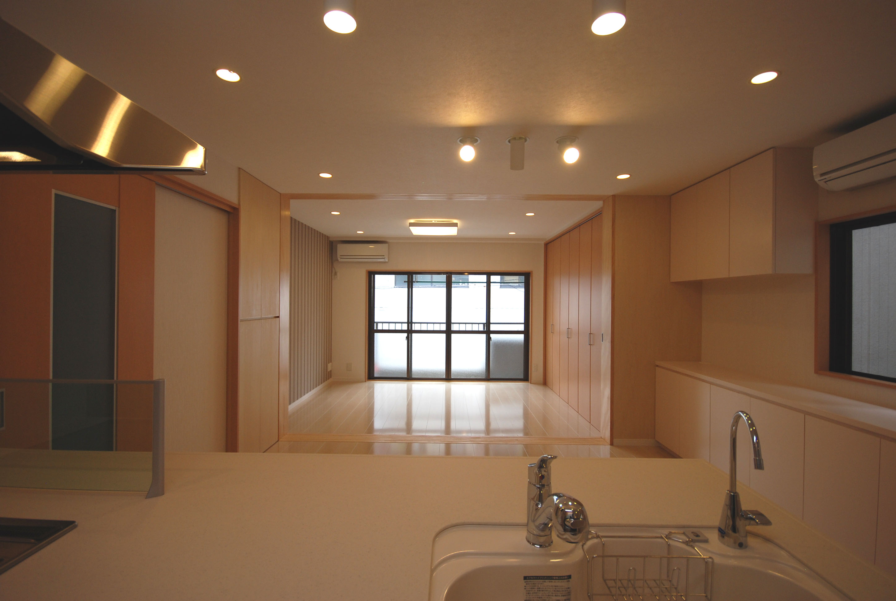 設備の老朽化に伴い、貸事務所併用住宅(鉄骨3階建て)の2階部分(2部屋残し)のスケルトンリフォームを行いました。一番の要望である「収納」を確保するため、今まで分かれていた和室、DKを一つのLDKにしました。壁面収納を既存サッシと調和させるためカウンター型にすることにより、フルフラット型の対面キッチンと相まって一体的かつ開放的なLDK空間の創出を試みました。床材、壁クロス、家具収納を明るめの白色調でまとめることで南側からの大開口からの光を反射させ部屋全体に柔らかい光が包み込む温かい空間になりました。