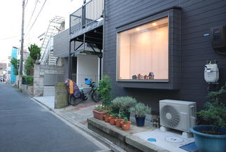 奥様の仕事を発信したり、雑貨をディスプレイする窓。 日中は障子を介して柔らかく採光し、夜は通りに室内の灯りをおとします。 室内側の板戸を閉めて遮光もできます。