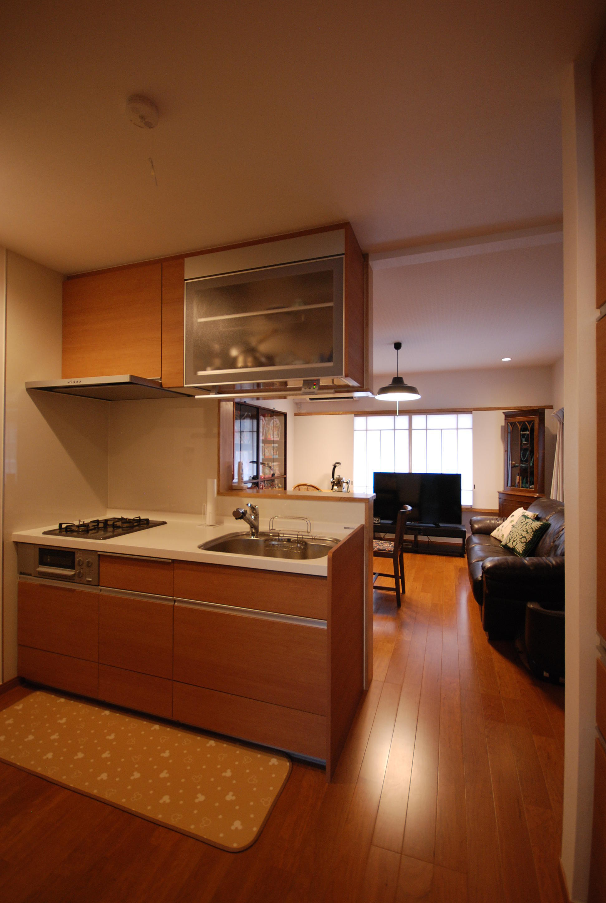 台所と居間の2室に分かれていた既存の間取りを1室につなげました。キッチン正面は壁になっていましたが、耐震診断により構造壁を整理することで解放することができました。
