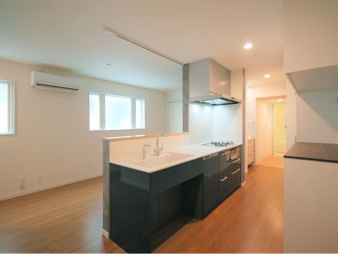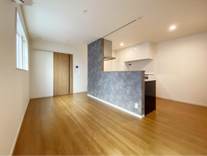 和室と物置をつぶし、ご家族一緒の時間を過ごせるLDKを設けました。壁付け型キッチンを、お子様と話をしながら料理ができる対面キッチンに変更。
