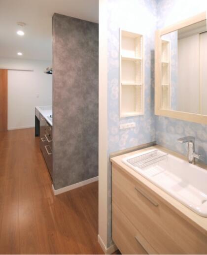 キッチンから洗面室、脱衣所に一直線につながる動線。料理をしながら洗濯もできる、家事をしやすい動線に。