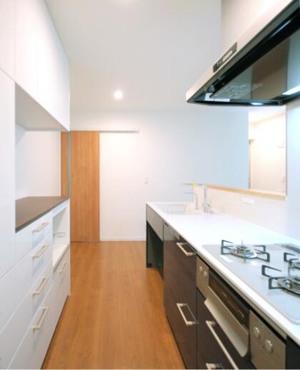 キッチン背面に、電子レンジや炊飯器など調理家電がおけるキッチン収納を設置。収納力も豊富。