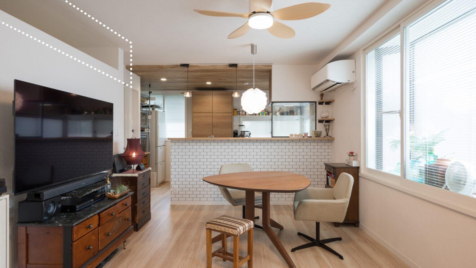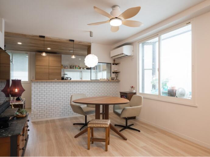 「プライベート空間を心地よく」がLDKの設計方針。壁の上部に設けた隙間と大きな出窓によって、実際よりも広さを感じる開放的な空間を演出。床には床暖房を設置。出窓とキッチン窓は内窓を設置し断熱性もアップ。居心地のよいLDKを実現しました。
