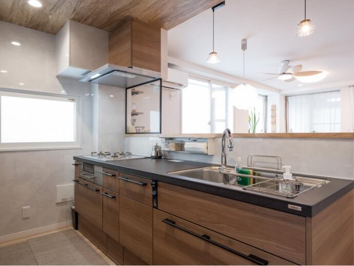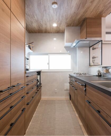 キッチンとキッチン収納のデザインを統一。天井も木目調に。