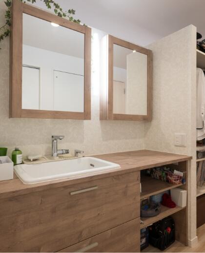 通常は脱衣所にあることが多い洗面台ですが、廊下に配置。洗面台の利用の際に脱衣室(プライベート部分)を来客に見せないように配慮しました。暗くなりがちな廊下にリビングからの光を取り入れるために洗面台の上部を開放。天井に隙間があることで、隣室のリビングからは見えませんが、洗面台を使用している気配は感じられるのでお客さんと鉢合わせすることもありません。