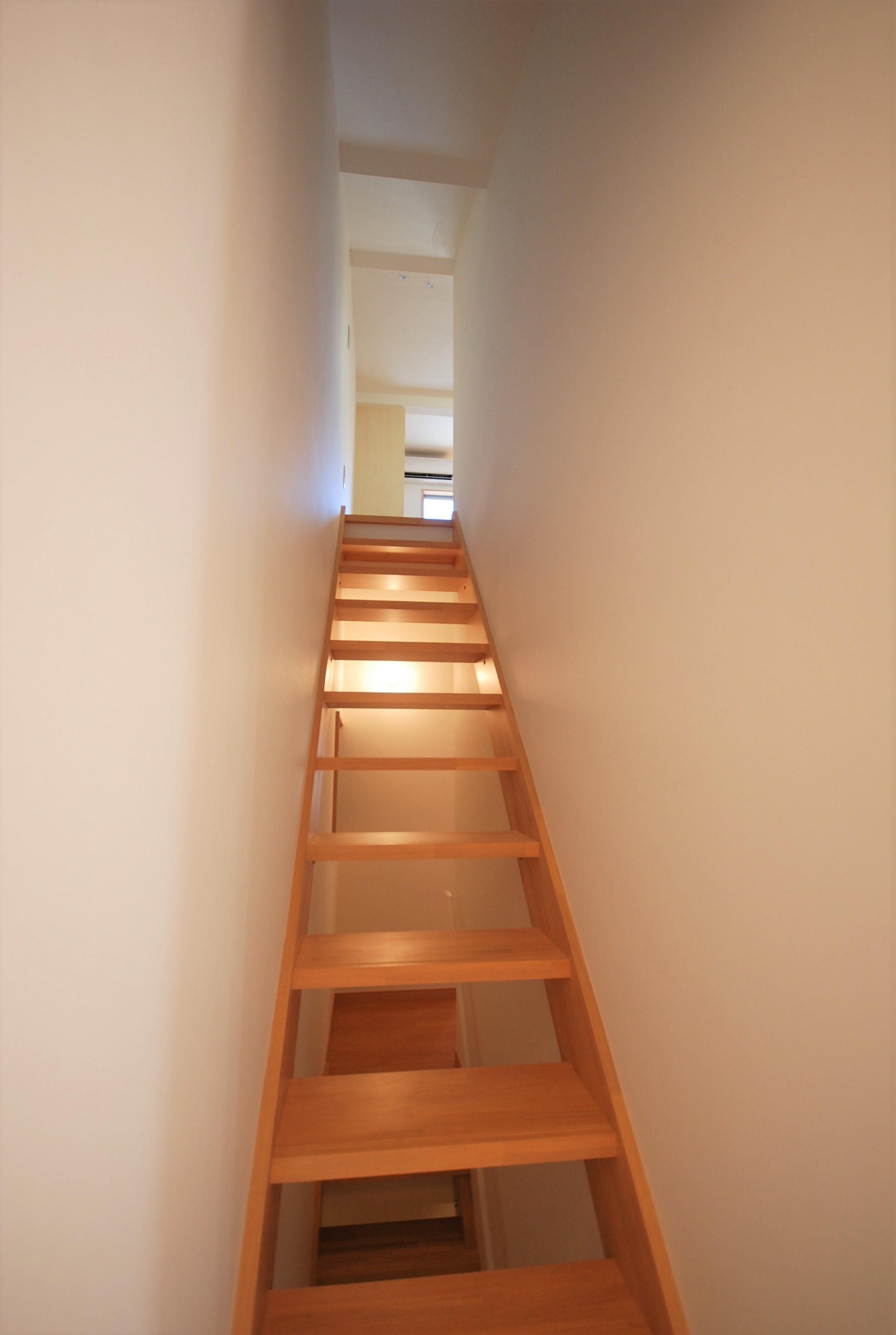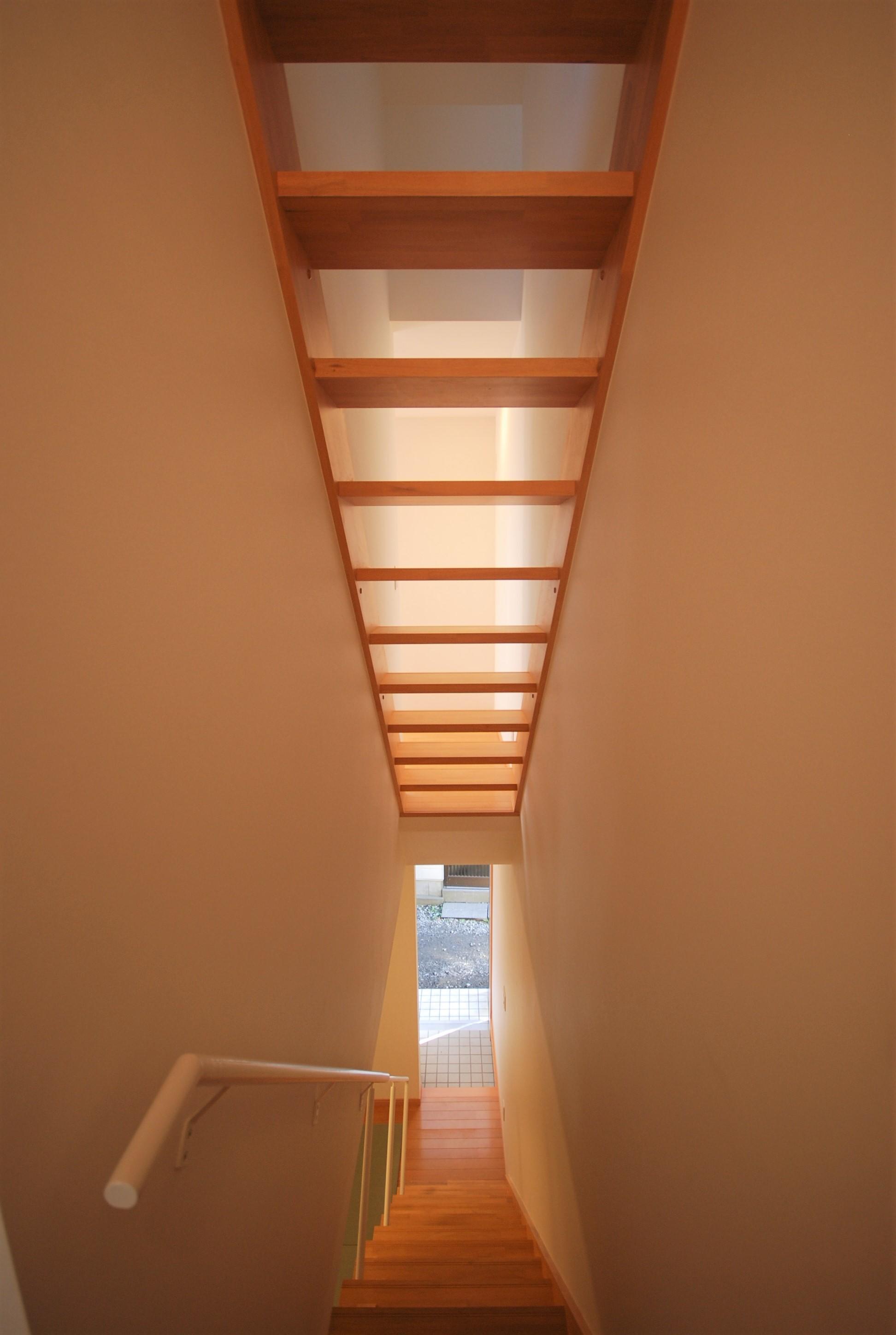 一階に必要とされる機能を全て満たすには、床面積不足でとても窮屈な空間になってしまいます。そこで、居間と階段室の壁を取り払い、階段を一階の居間に取り込むことを考えました。さらに、階段をストリップ階段とし、二階の窓から差し込んだ自然光を、一階の居間へ、明るい壁で反射させながら導くこととしました。