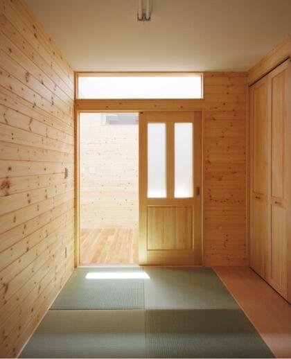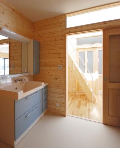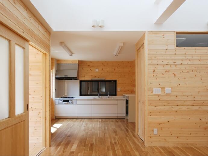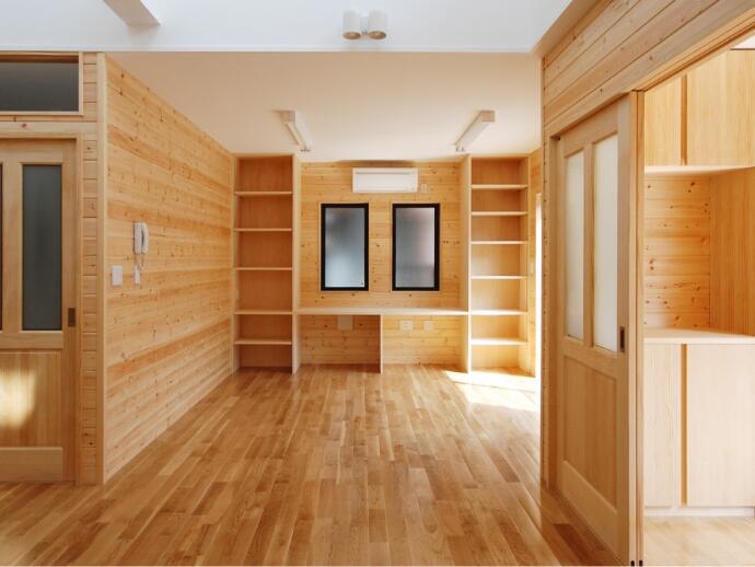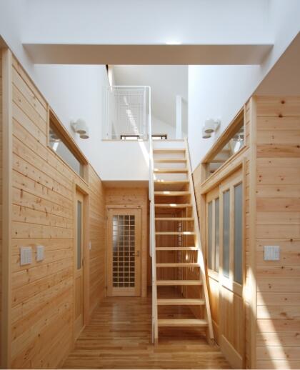 「山小屋のような家に住みたい」というご要望にお応えするため、建具などに天然木を多用。壁面には杉の羽目板を使用。