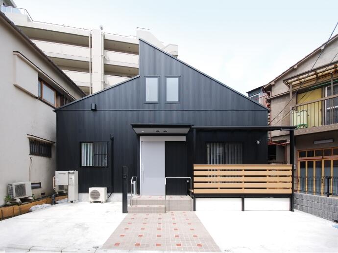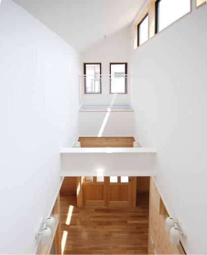 施主様のご要望は「日当たりのよい平屋」。屋根面に設置された天窓には「漏水のリスクや窓拭き等メンテナンスのしにくさ」といった問題があるため、とんがり屋根の平屋とし、壁面の高い位置に光を取り込むための横長の窓を設置。窓のメンテナンスを楽にできるよう、屋根裏部屋から屋根に出られるようになっています。家の中央には吹き抜け廊下を設け、明るく風通しのよい住まいを実現。低くなった建物の採光&通風問題を解決しました。