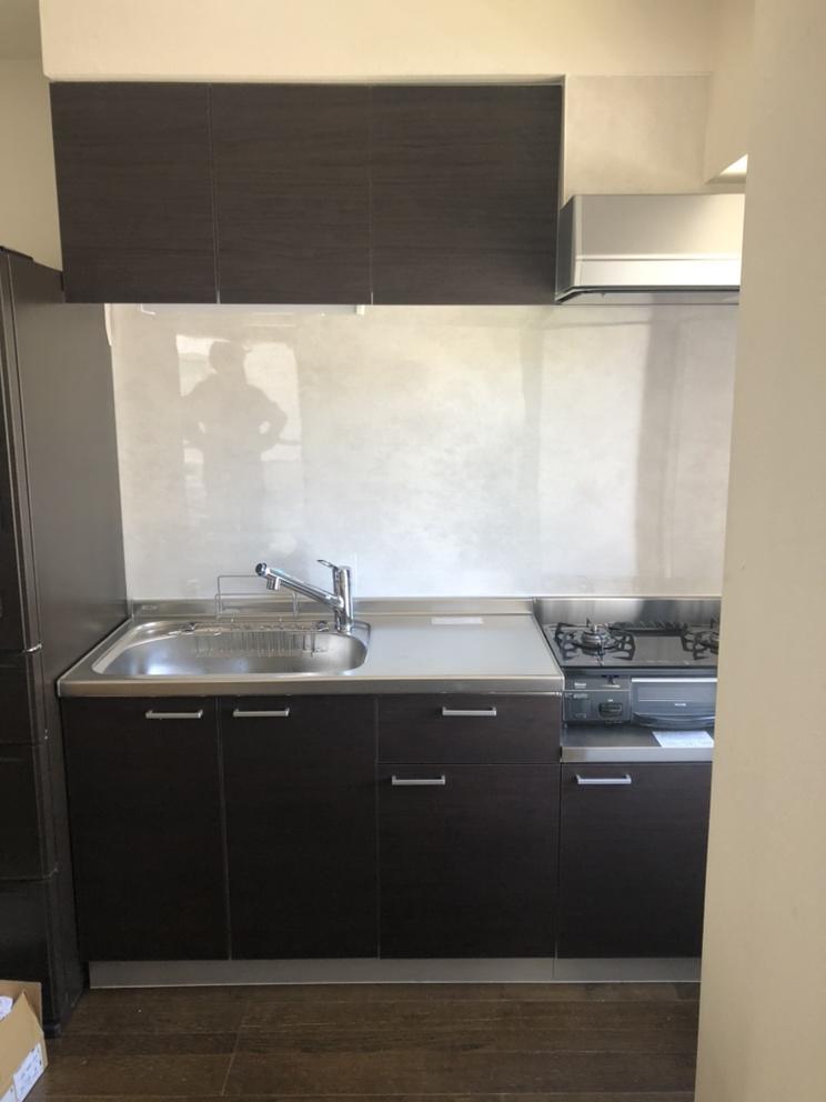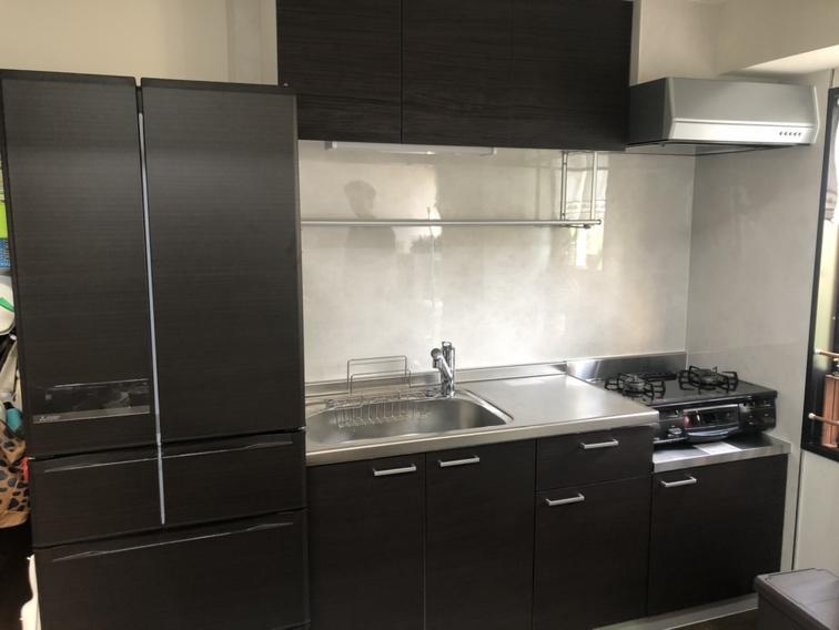 古くなったブロックキッチンの交換を希望されていたK様。 床や棚等色んな茶色が部屋にある中、 かっこいいダークブラウンの冷蔵庫にキッチンの色を合わせてコーディネートしました。 シックな落ち着いた空間になりました。
