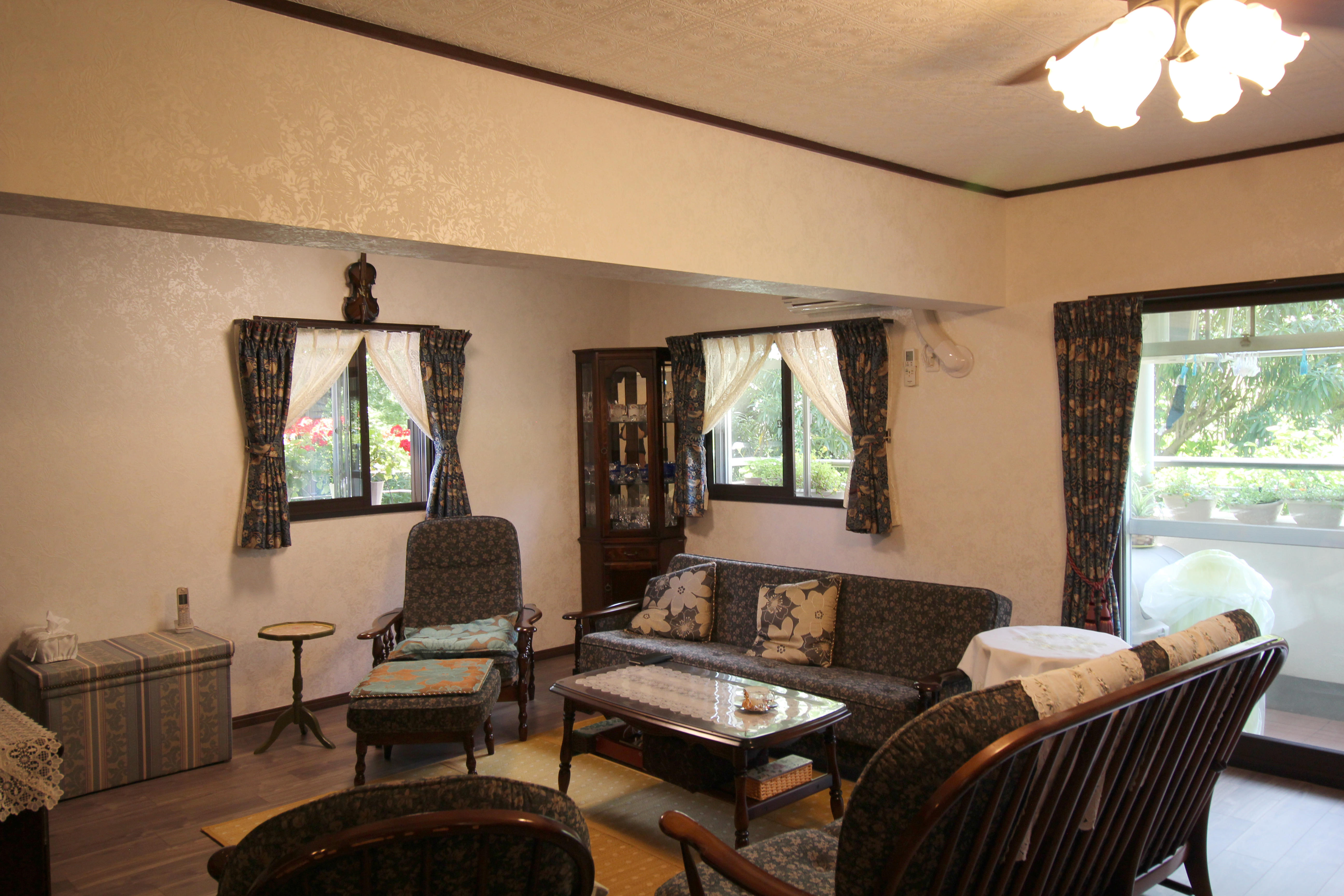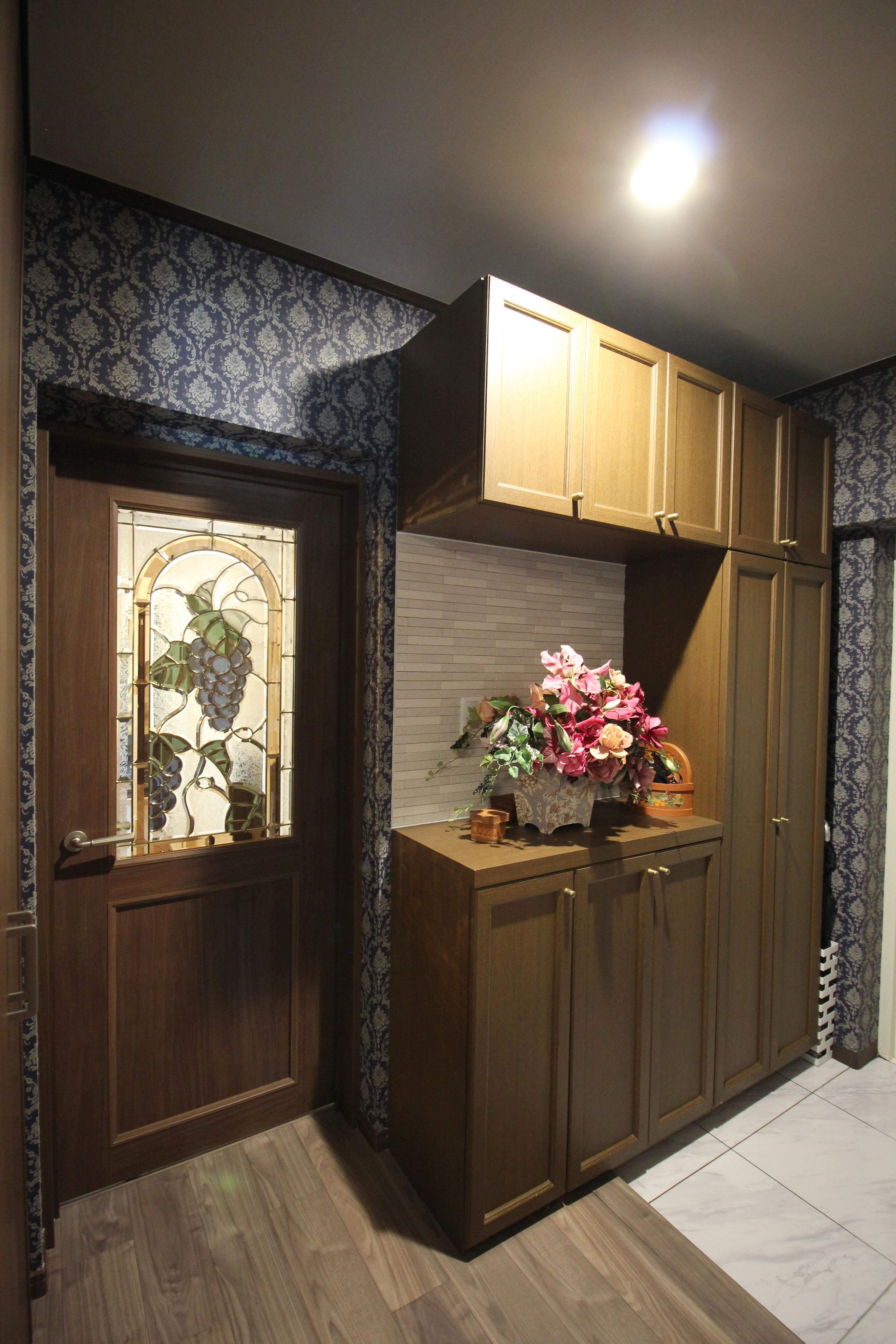 玄関からリビングに入るドアは、奥様のご希望で、ハンドメイドの葡萄のステンドガラスの入った特注のドアです。玄関の採光はもちろんですが、朝の光が入ると色々な光となりとても綺麗です。玄関靴箱の上にはエコカラットプラスで、紺色のクロスと対象にしました。お花屋や絵など飾れます。玄関は大理石柄のタイルです。タイルとタイルの目地にはシルバーのデザイン目地棒が入っており、高級感が出ています。ライトは人感センサーですので、両手に荷物を持って帰っても、パットついてくれとても便利です。エコカラットプラス:グラナスルドラ 玄関タイル:TAJIMA