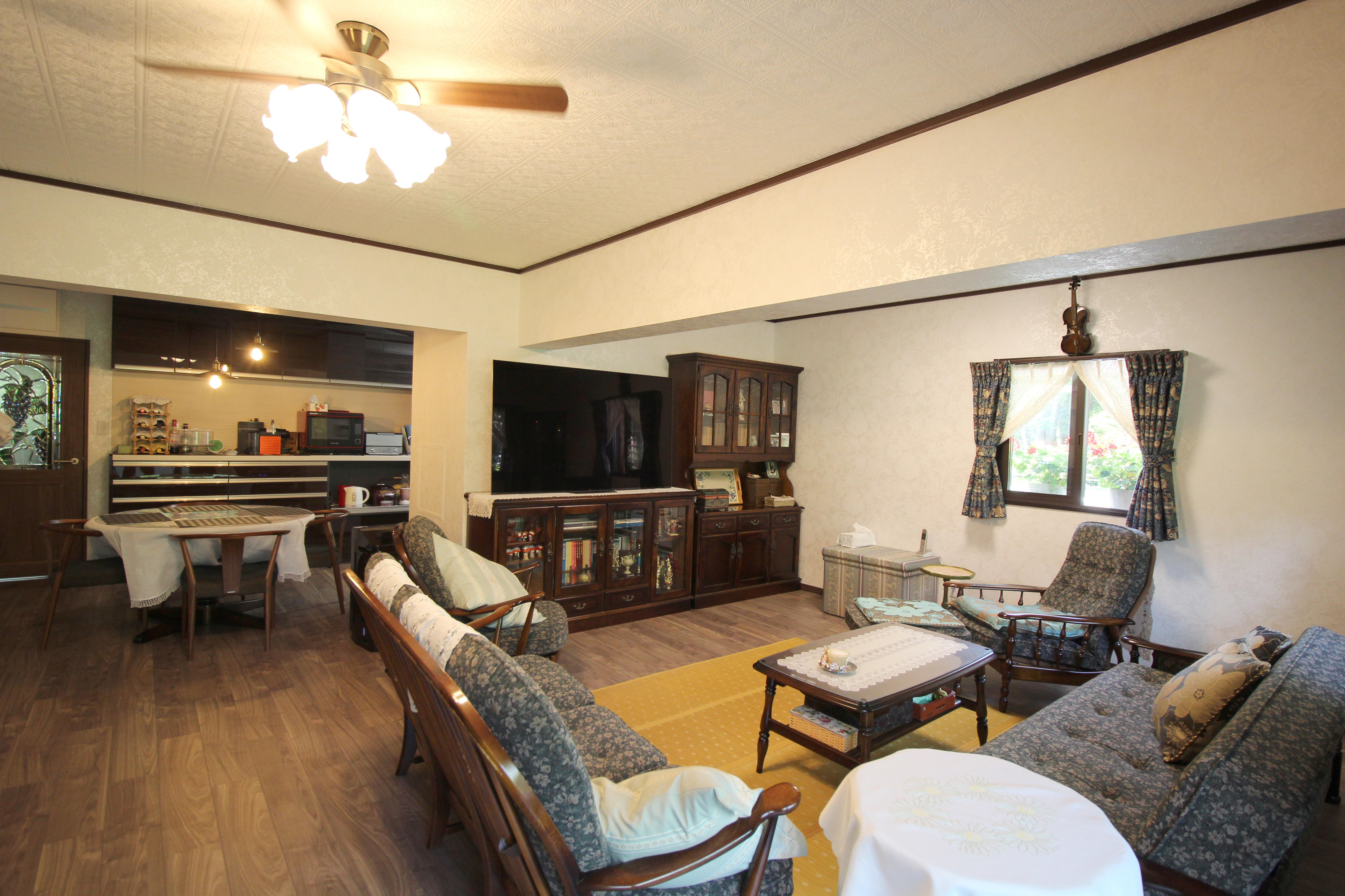 2メーター50センチの広い背面収納には、食器や家電が効率よく収納され、キッチンからも動線が良くスムーズです。また、カリモク家具やオーダーのステンドグラスのドアに合う、LIXILのリシェントのダークレオはインテリアにも同化し家具の一部のようです。キッチン背面収納:LIXIL リシェント