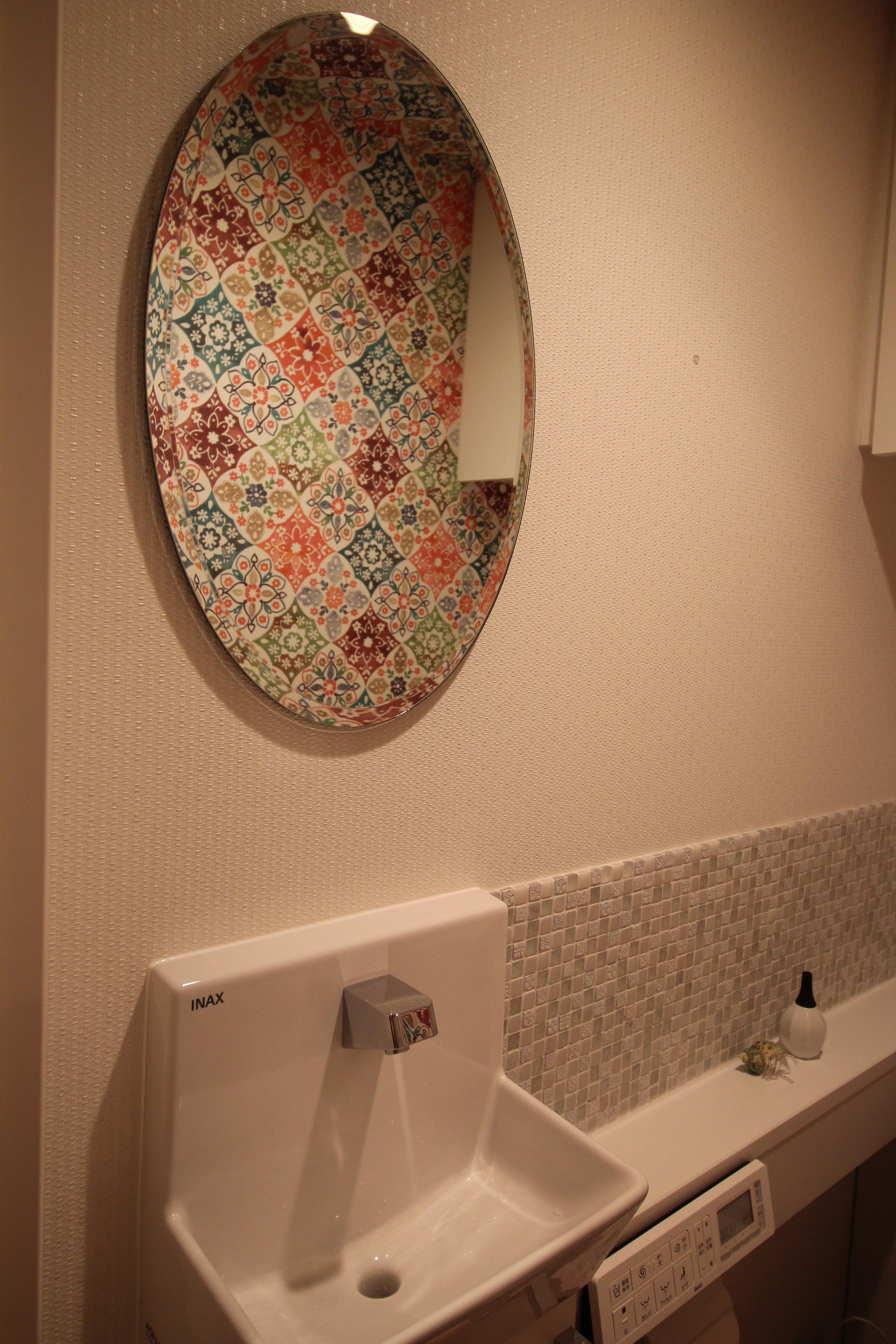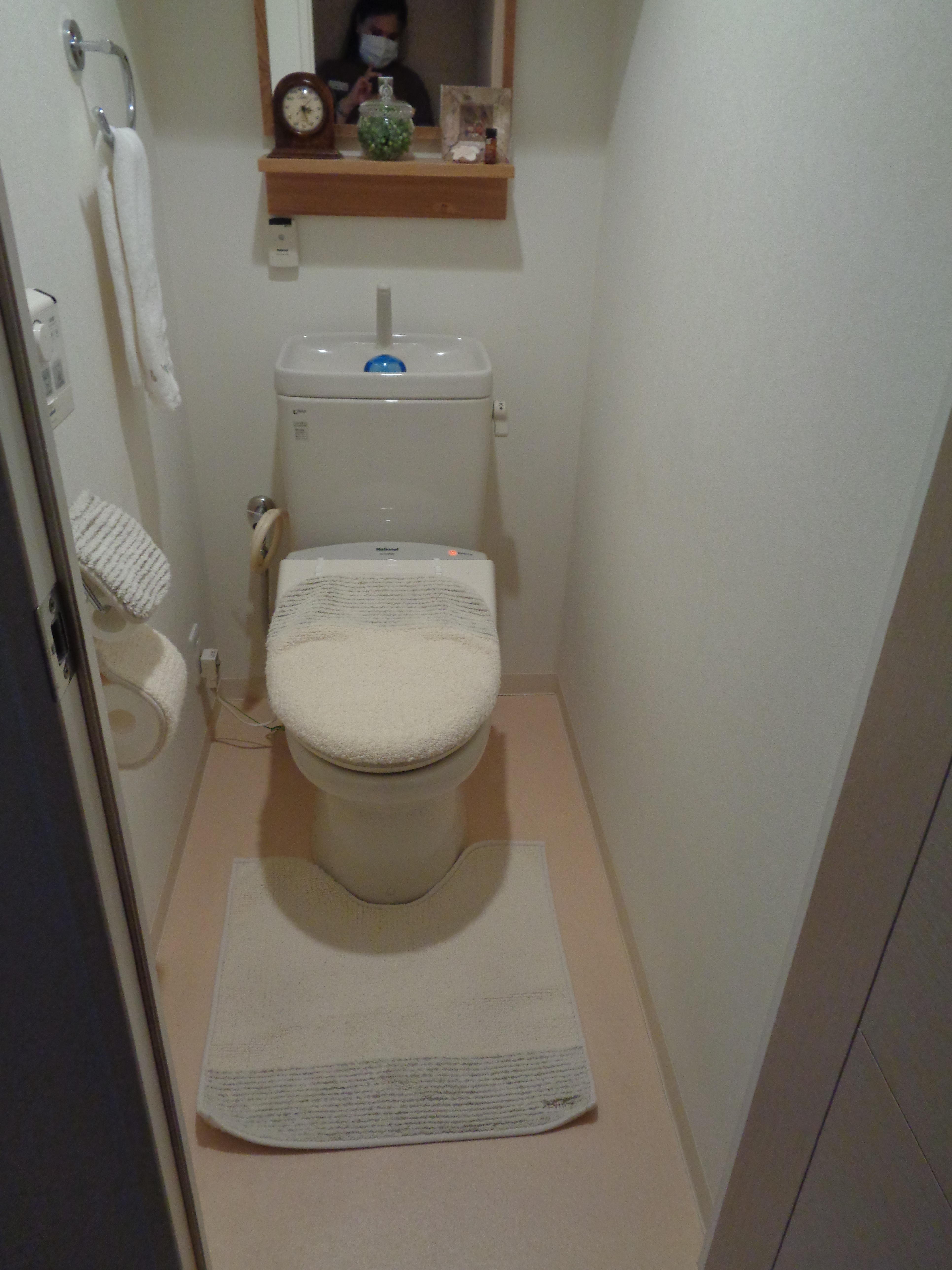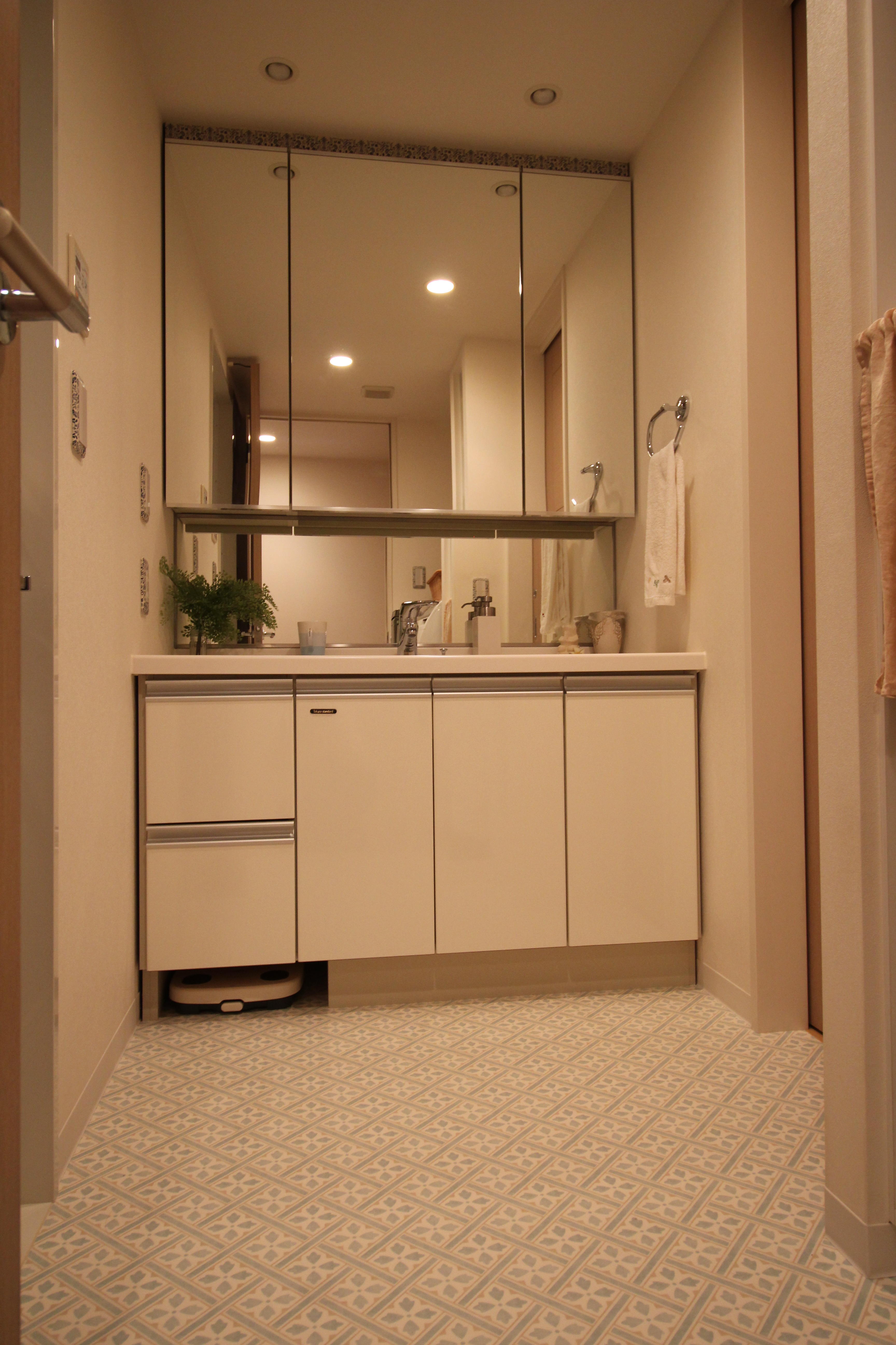A様のインテリア感覚はとても勉強になります。 メイン写真のトイレの柄のクロスは、テレビで紹介されたサンゲツのもの。 以前は一色の統一感のある内装でしたが、貼り分けをすることで、全く違う雰囲気になりました。 向かい側の鏡に、素敵な柄が映し出され面白味も増しています。 トイレもゆったり楽しめるスペースだと感じます。