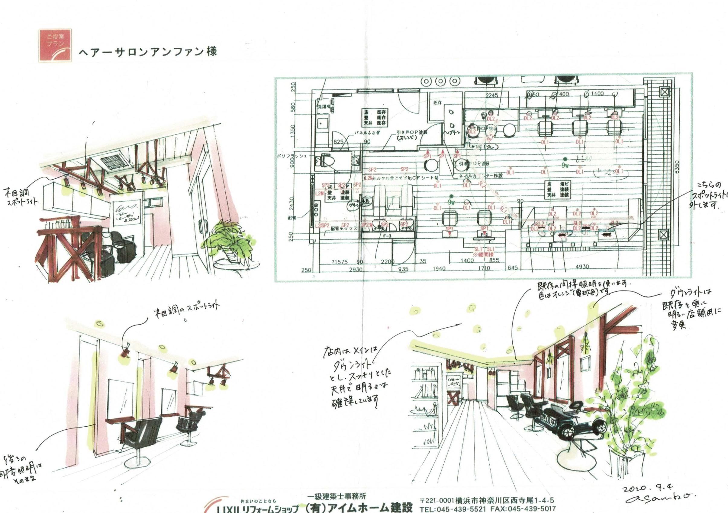 当初のラフ図から打ち合わせを何度も重ね、お客様と一緒につくりました。 美容関係ということで、やりたいイメージ、デザインがお客様の中ではっきりしていたので 意匠的なことよりも、カットする際の明るさやお客様が眩しくないかなど、使用する際の照度計画に力を入れました。