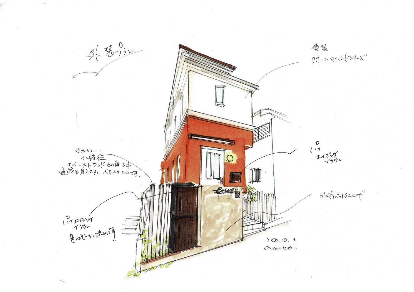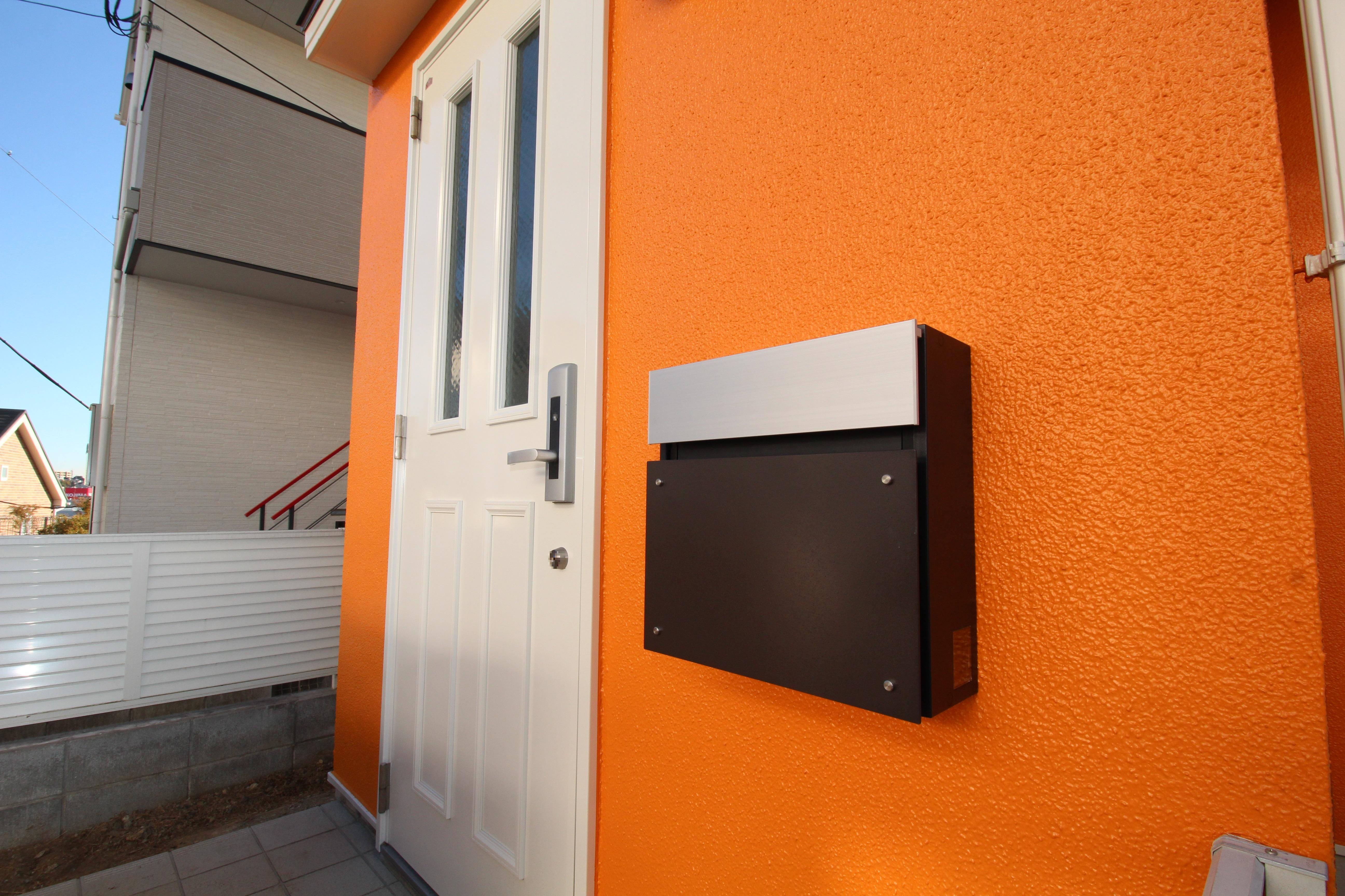 鮮やかなオレンジにチョコレートのようなポストがベストマッチ!大きめの書類が入るポストにしたいというご希望があり、玄関横に設置しました。のぞき窓が左右両側面にあり、取り出し口蓋を開けずに中を確認できるのが便利です。ポスト:パナソニック サインポスト フェイサス色:エイジングブラウン