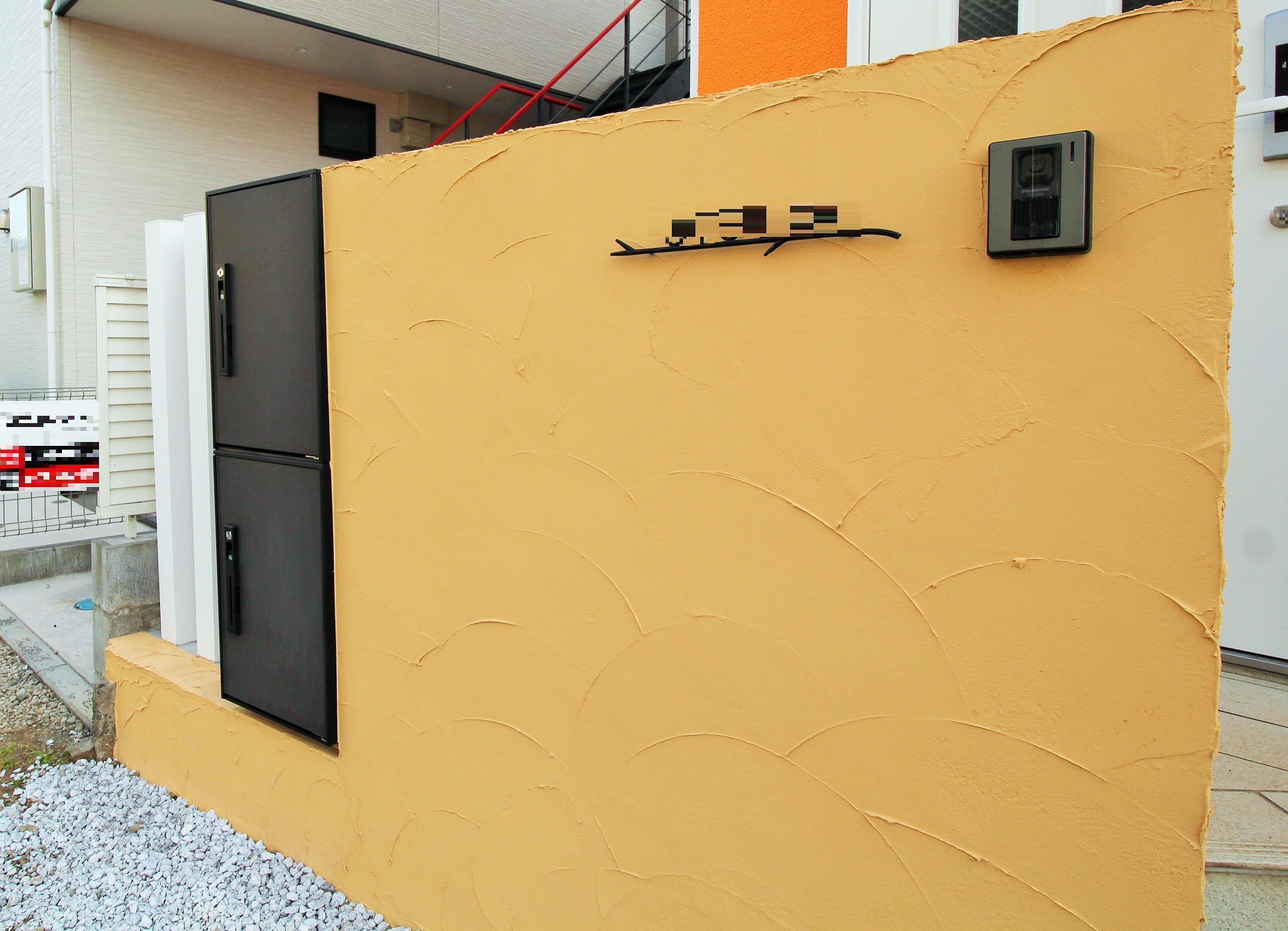 門まわりを一新!アイアンの表札が、アクセサリーのようで一気にオシャレ感UP!アイアンや宅配ボックスはダーク系の色合いでシックなものを使用していますが連波仕上げのジョリパット外壁と合わさることで、柔らかい印象になっていますね。表札福彫 ニューブラスアイアン・黒塗装仕上げ