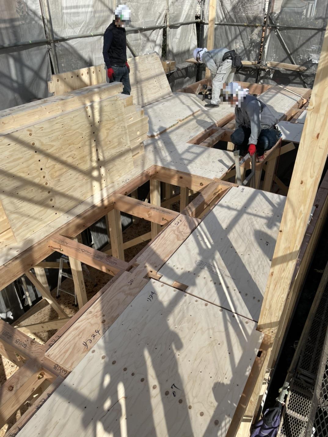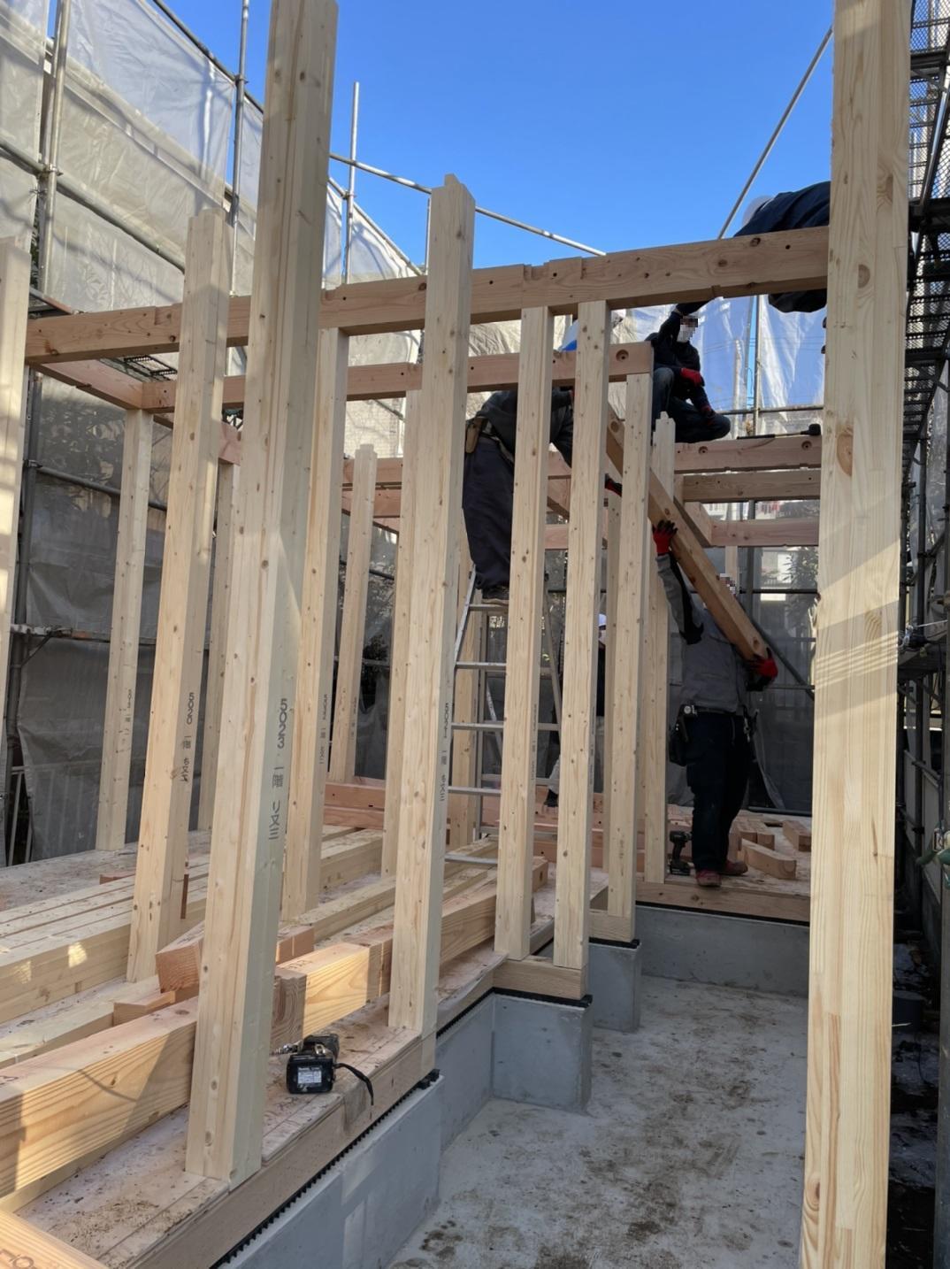 年明けに足場を組み、土台が完成し、13日に上棟しました。 一日でここまで進み、家の形が見えてきました。 ワクワクがとまりません!