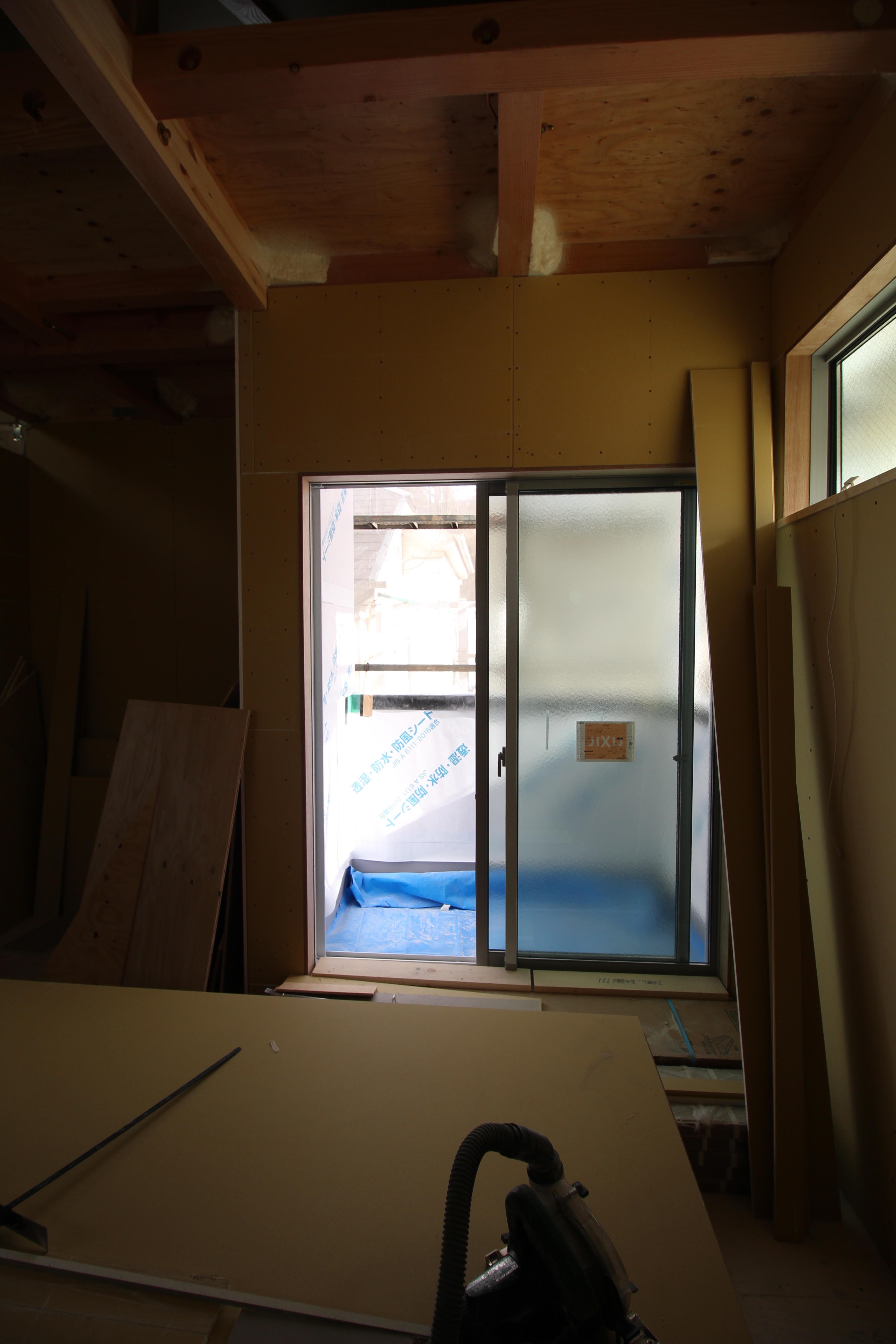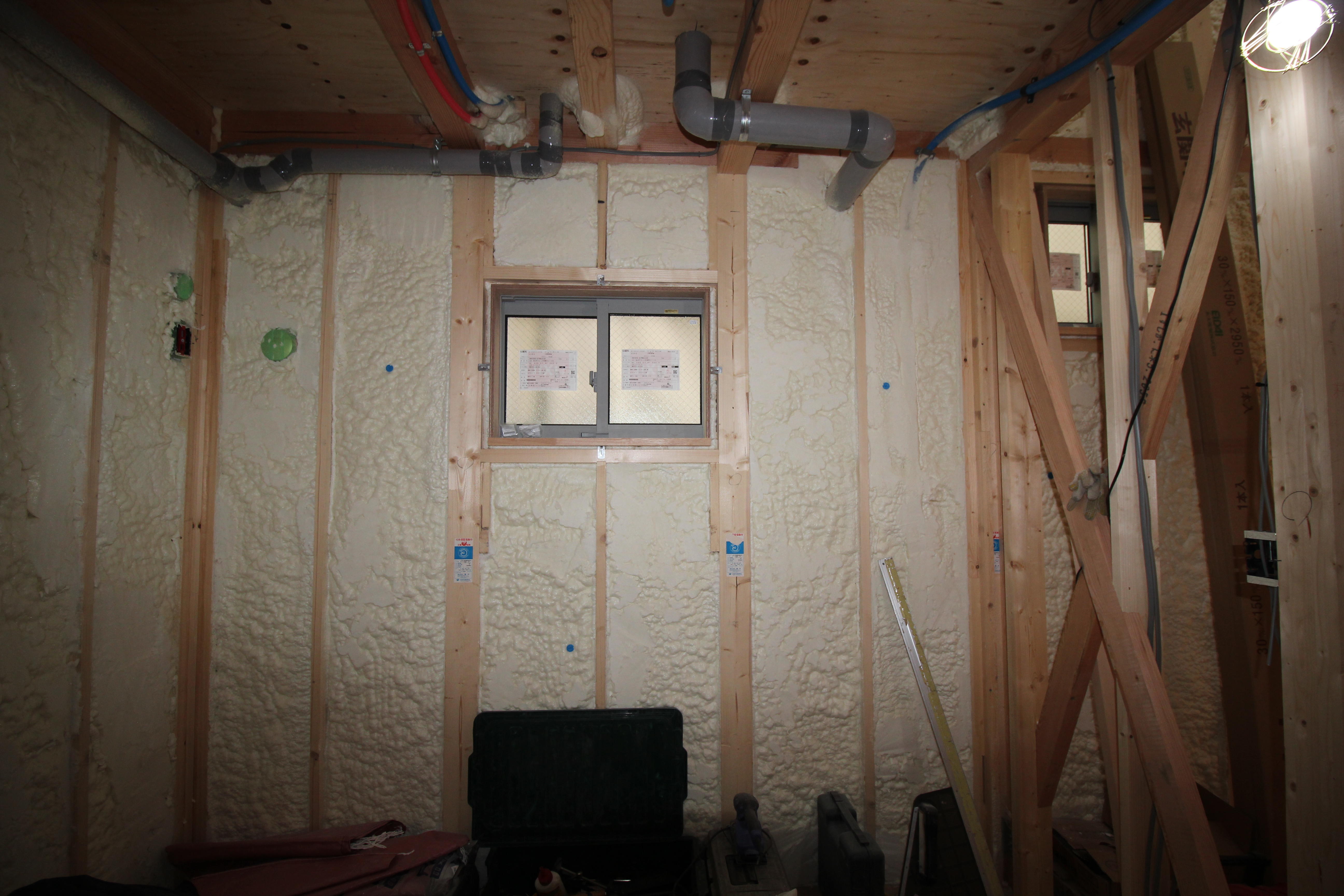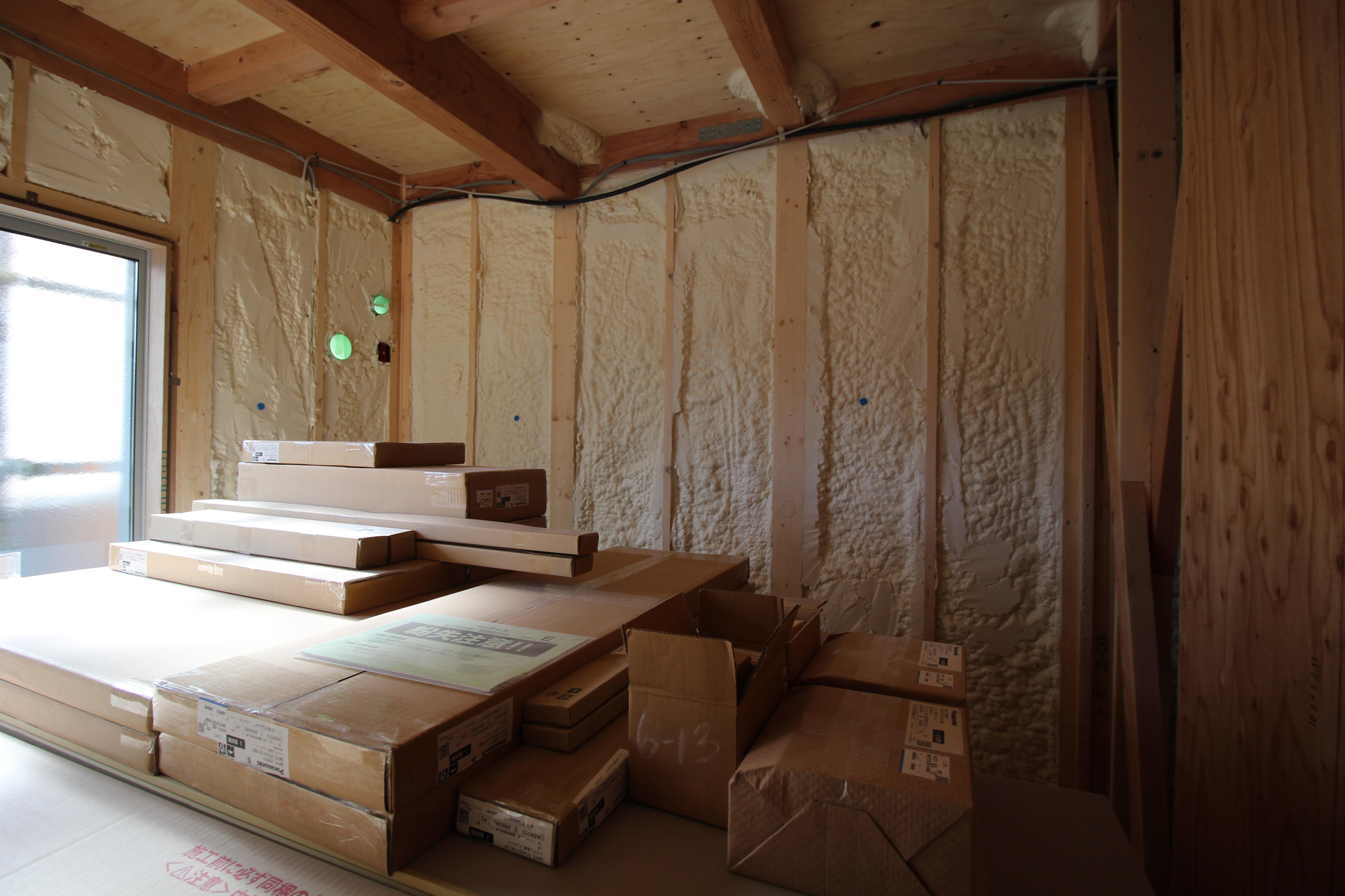配線・配管、サッシの取り付け、吹付け断熱が終わり、 現在は石膏ボード貼りを行っています。