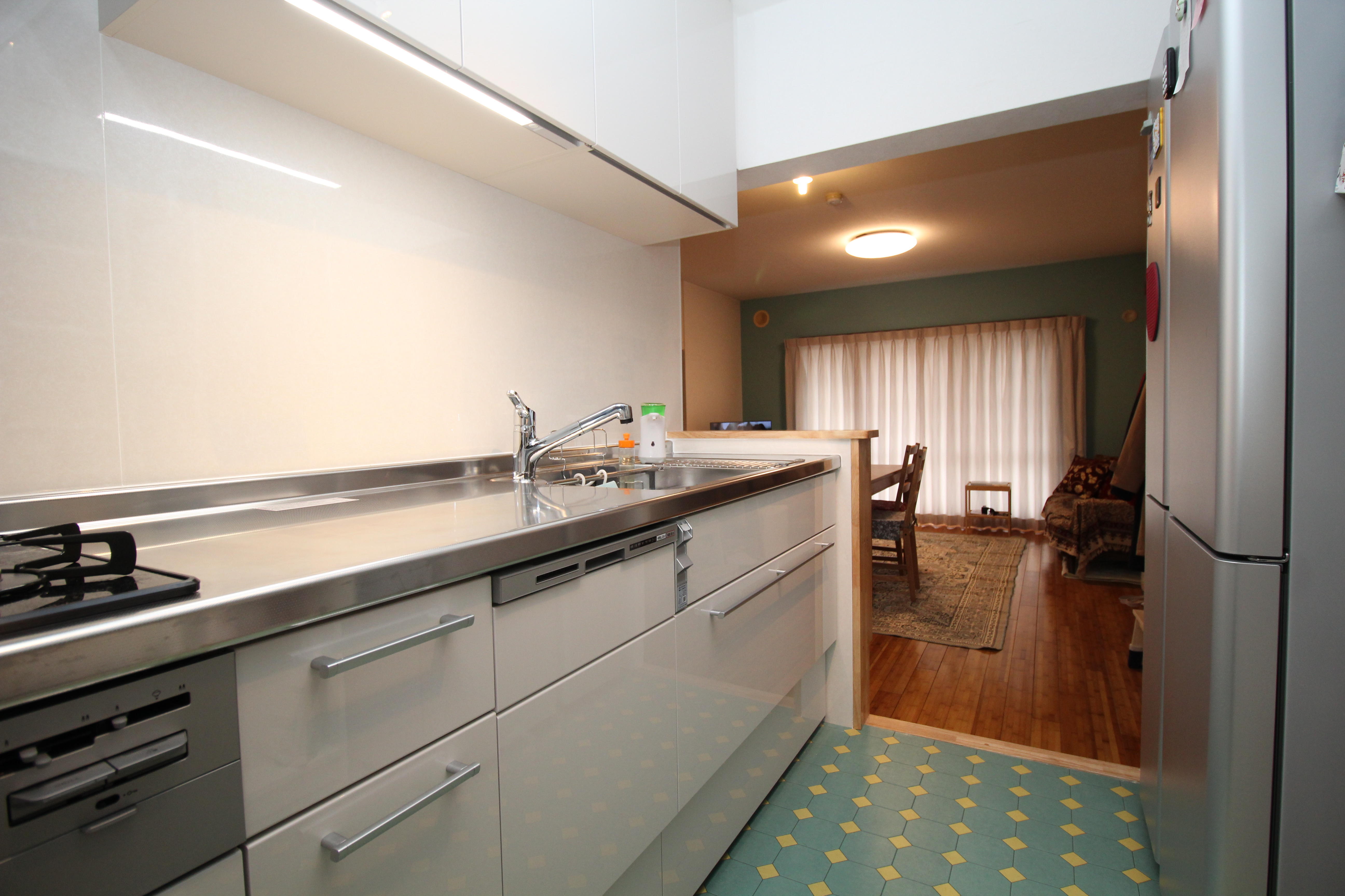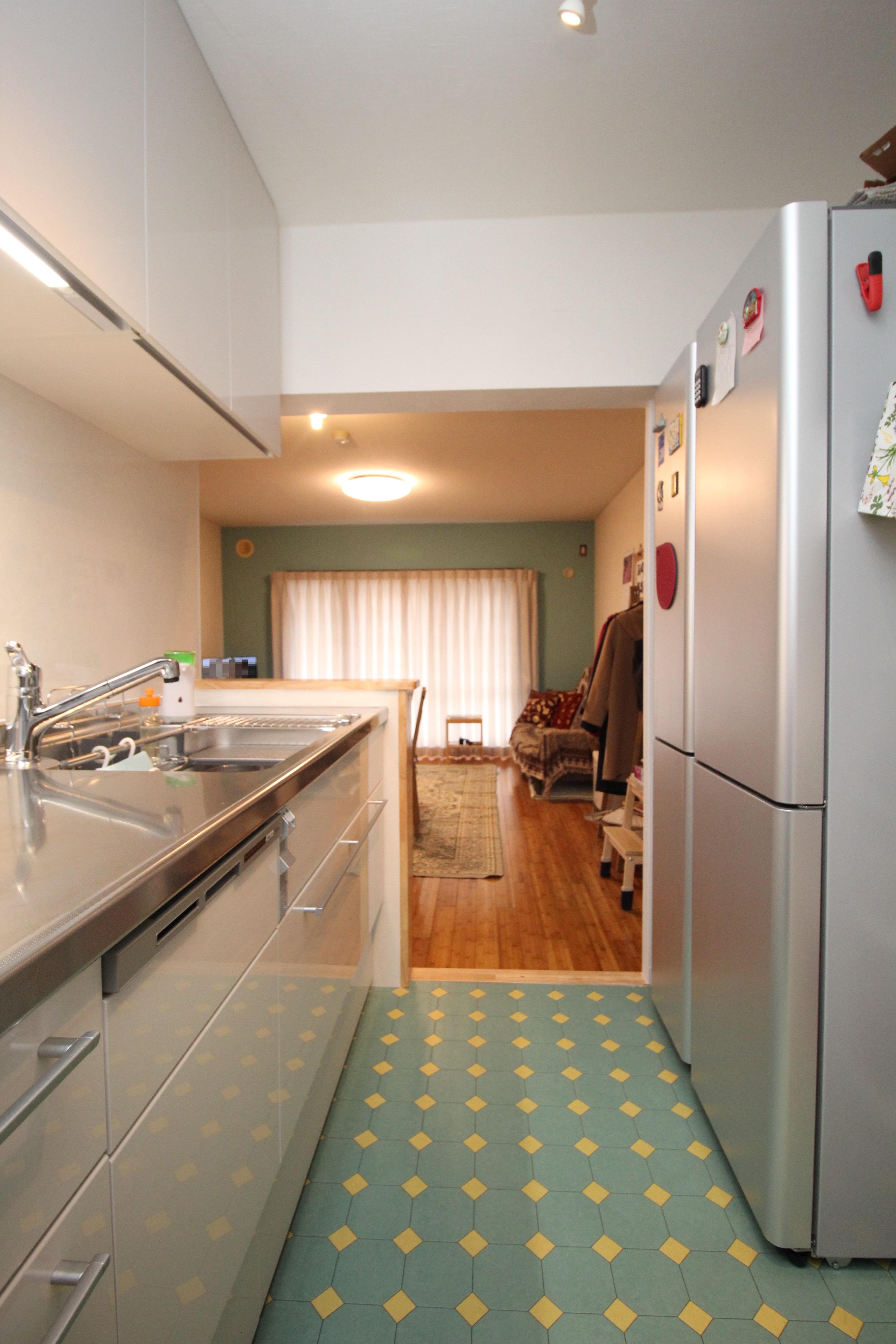 旅行好きなご夫婦がヨーロッパに訪れた際に目にしたキッチンからインスピレーションを受けたタイル調のキッチンフロア。