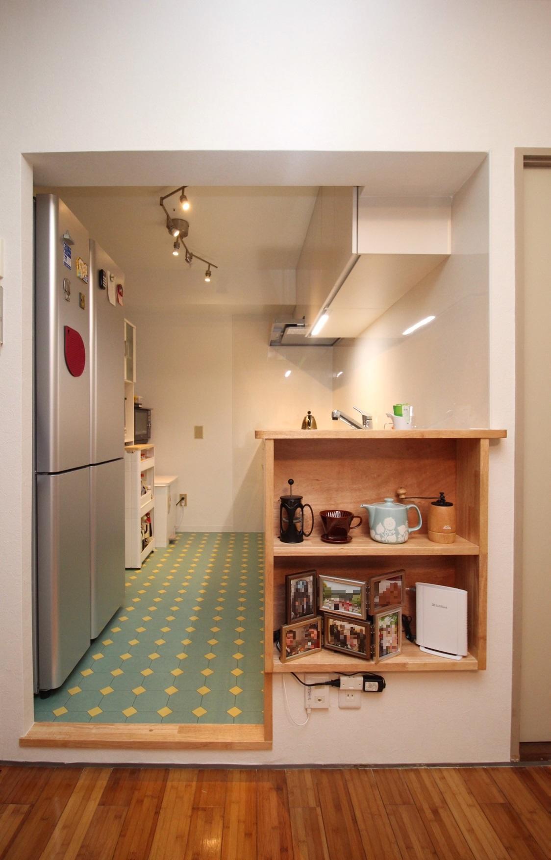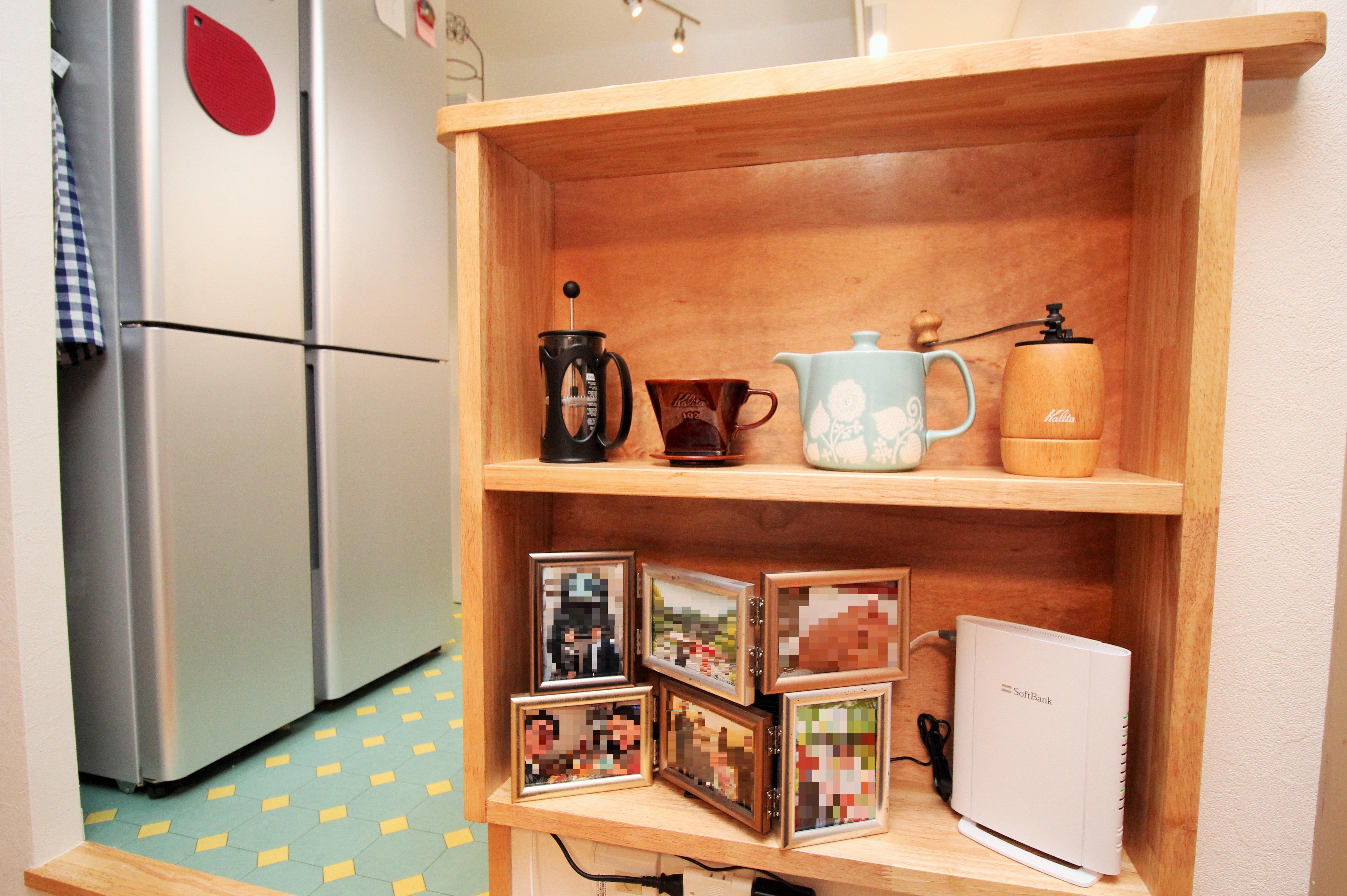 新しい家族が増えるという事で、M様のご要望は、「料理をしながら子供が何をしているか、見えるようにしたい。」でした。 そこで、キッチン取替えの機会に開口部をできるだけ広くし、明るくオープンな空間となりました。 また、普通の壁だった所をちょっとした飾り収納棚を大工さんに作ってもらいました。珈琲の道具や家族写真が並べれ、楽しい時間がこれからも流れていくんだなぁと、こちらも出来上がりにほっこりいたしました。 独立キッチンは、お料理を作るのに集中できると言われており、オープンキッチンと比べますと臭いの心配が少ない・居室からキッチン内が見えない為、突然の来客時など、安心というメリットがございます。デメリットは、料理中はリビングの様子が分かりにくく、ご家族との一体感が少ないという所です。M様のキッチンは独立型・オープン型の両方良い所をとったオリジナルキッチンとなったのではないでしょうか。