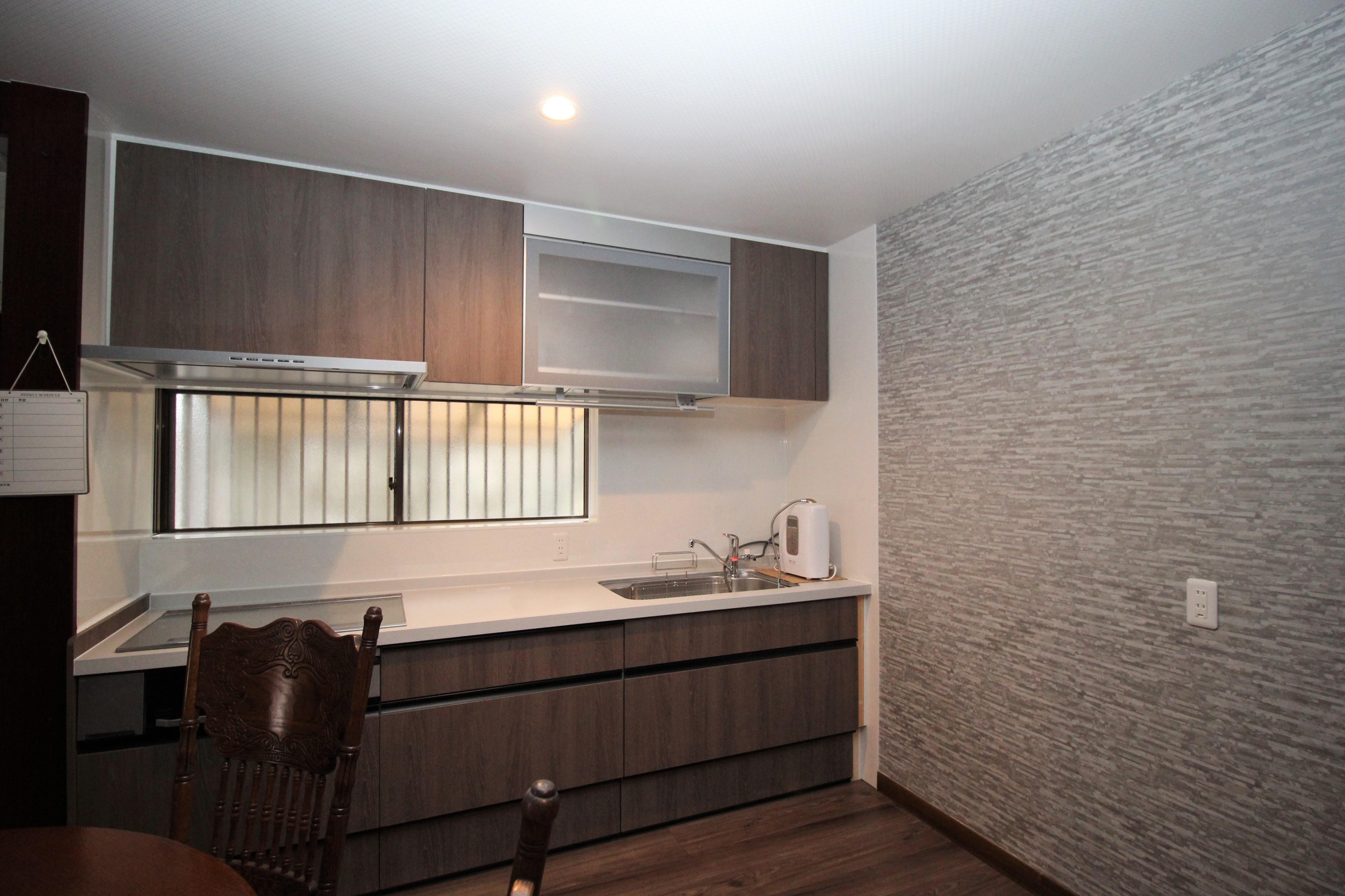 シンク下は立体構造の引き出し。収納力を高めるとともに、道具の取り出しやすさも向上です。レンジフードもフラットなデザインでお手入れ楽々。日々の使いやすさ、お手入れのしやすさを重視したシステムキッチンで、日々の家事をサポートしてくれます。扉はブラウン、取っ手はブラックとシックな色をお選びになりました。クロスとフロアーの色に合う色合いで、素敵なトータルコーディネートになりました。システムキッチン:リクシル アレスタ壁:サンゲツ RE51026天井:サンゲツ RE51265床:永大 スクスムTフロアーシートタイプ ボールドチークTRN-BOT