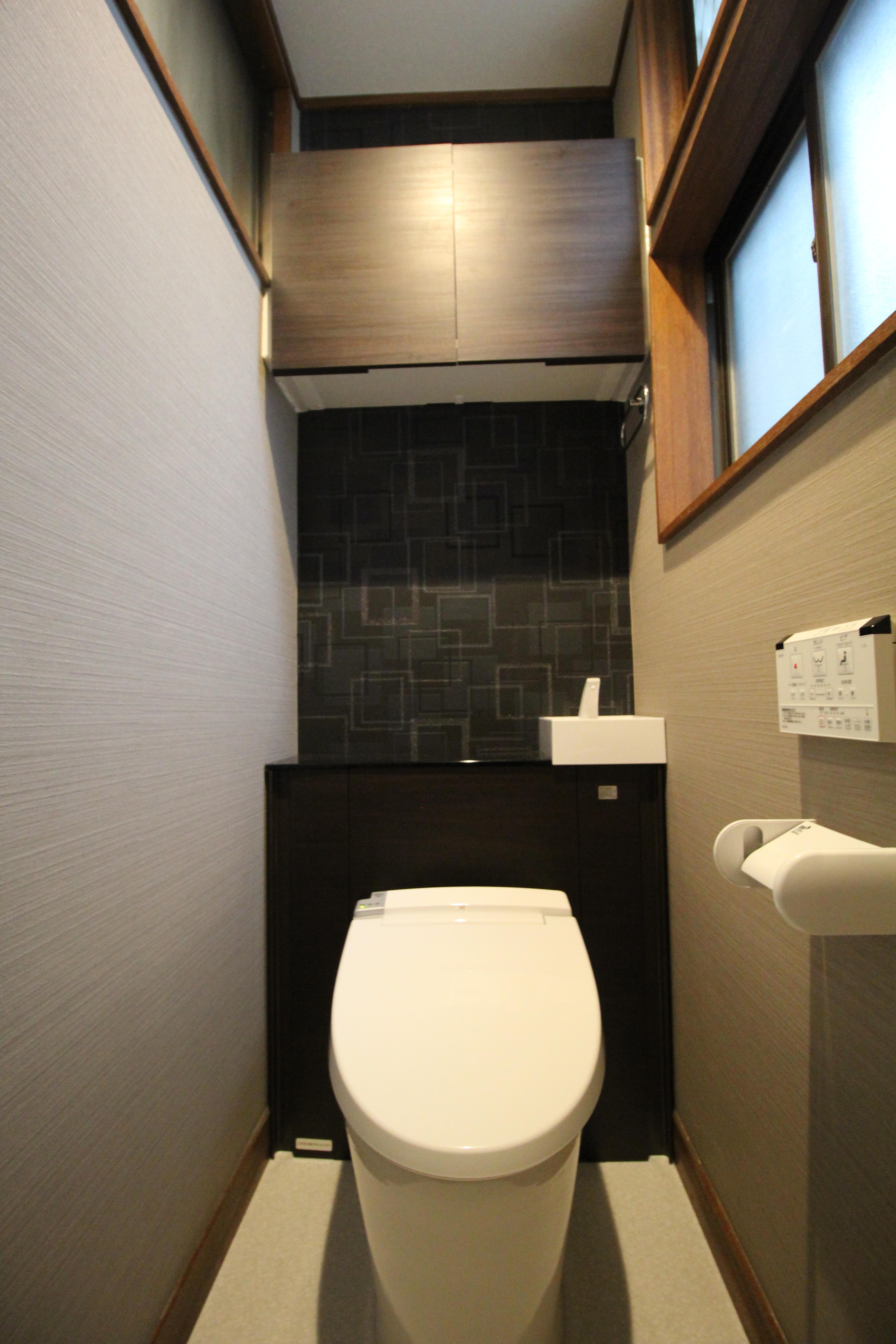 4つ行ったトイレリフォームのうちの1つ。全てのトイレでタンクレスのリフォレをお選びになりました。同じリフォレでもクロスとフロアーのデザインで印象が変わります。こちらのトイレはシックな印象です。トイレ:リクシル リフォレ壁:サンゲツ RE51374/RE51751天井:シンコール RJ6793床:サンゲツ HM10157