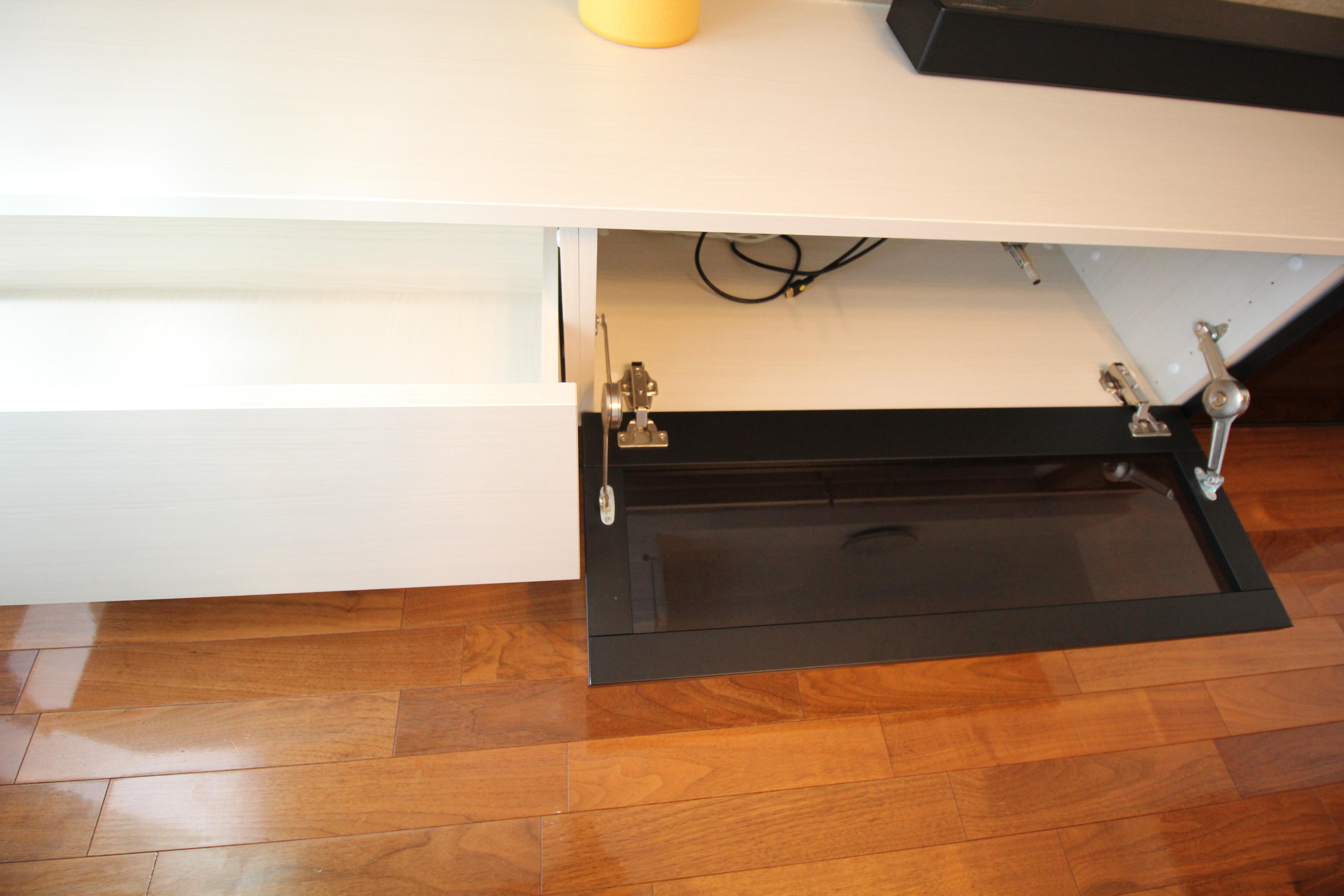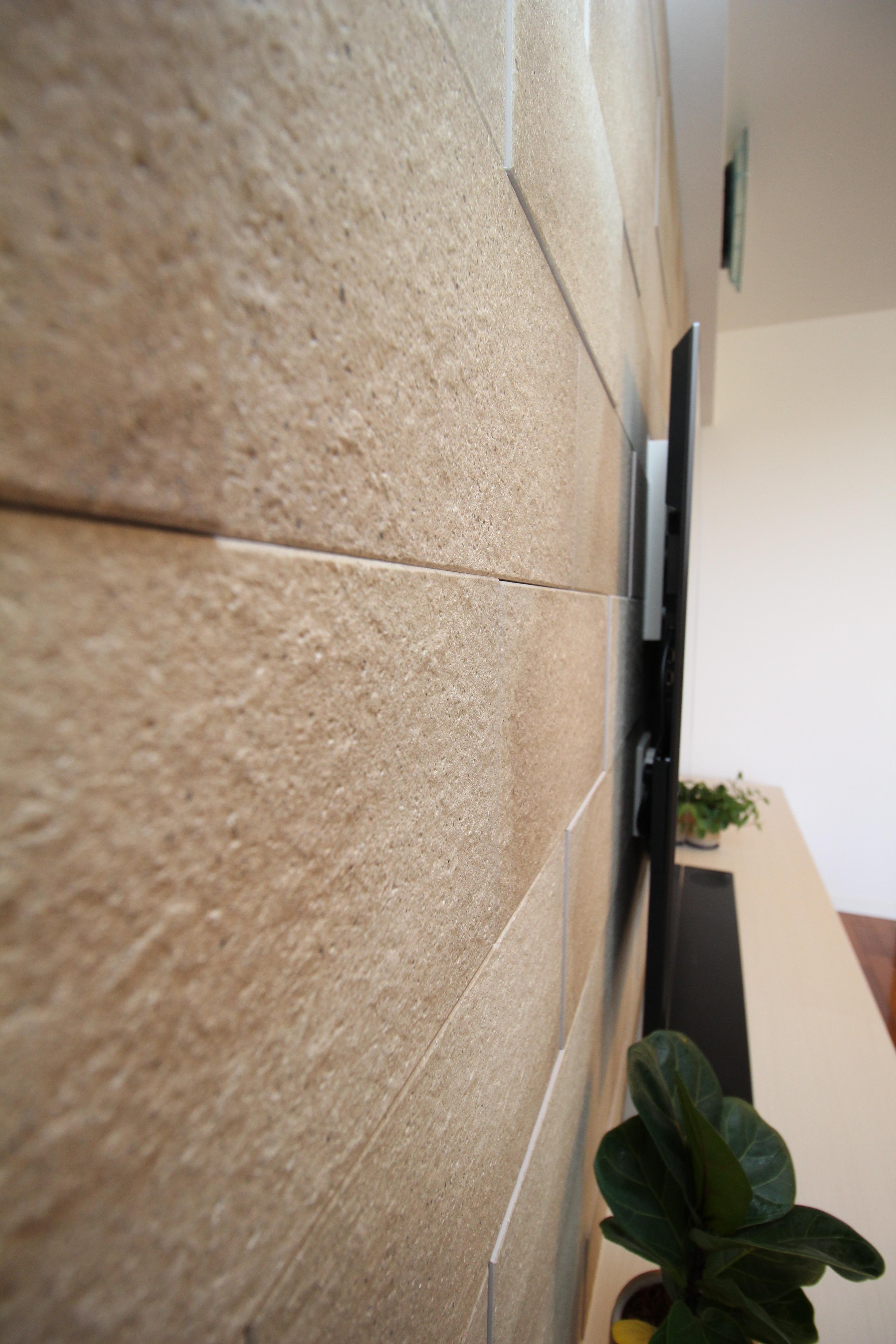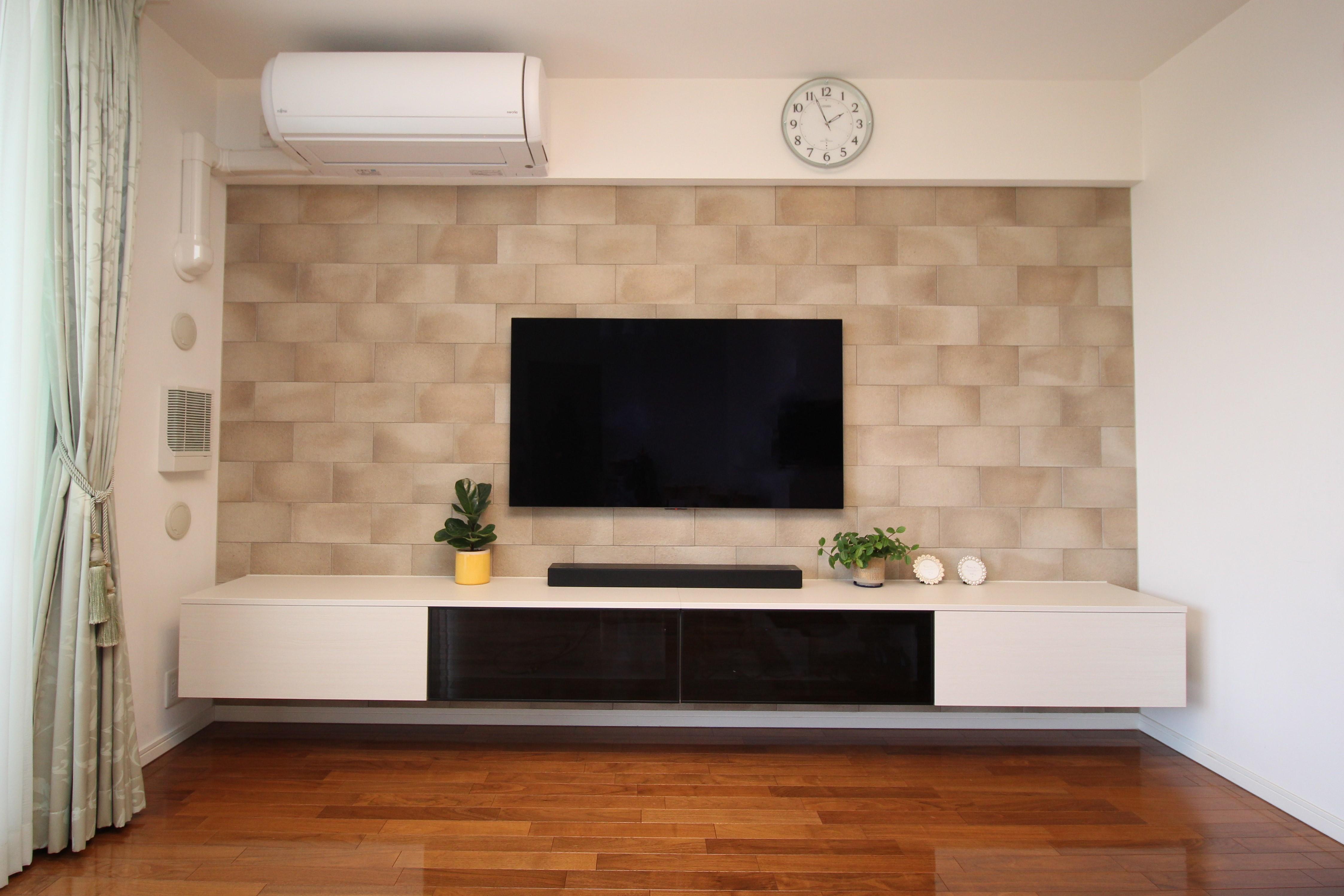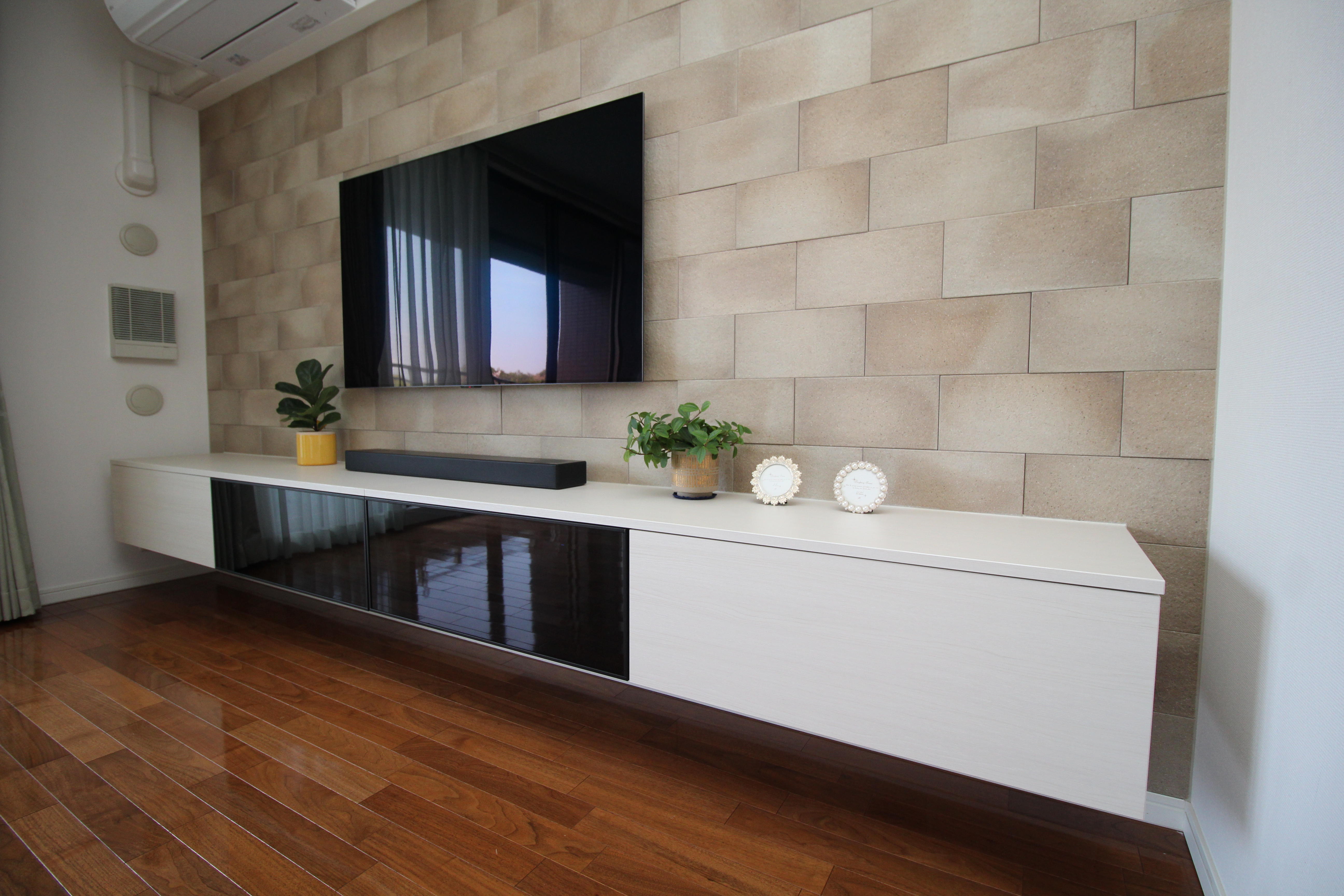 一面を飾るエコカラットは新作の「つちのは」! エコカラットに合わせて、TVボードの木目柄は横木目にしました。 フロータイプのTVボードなので、下も掃除が楽々です。