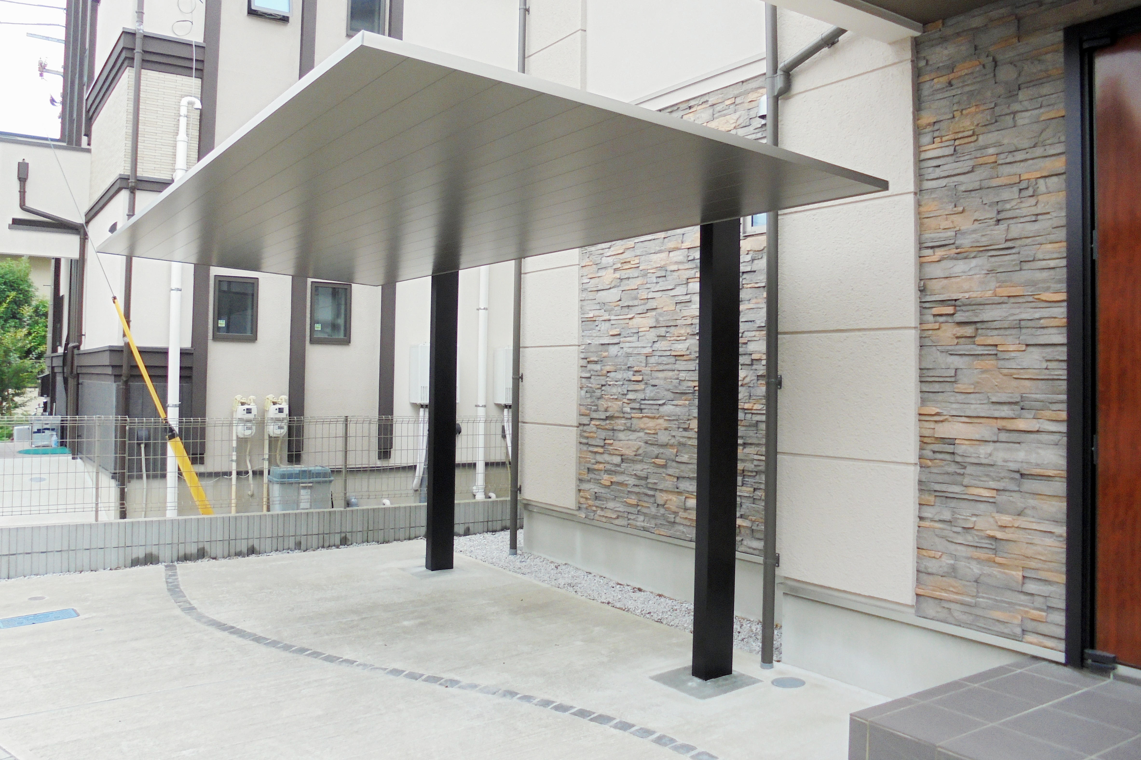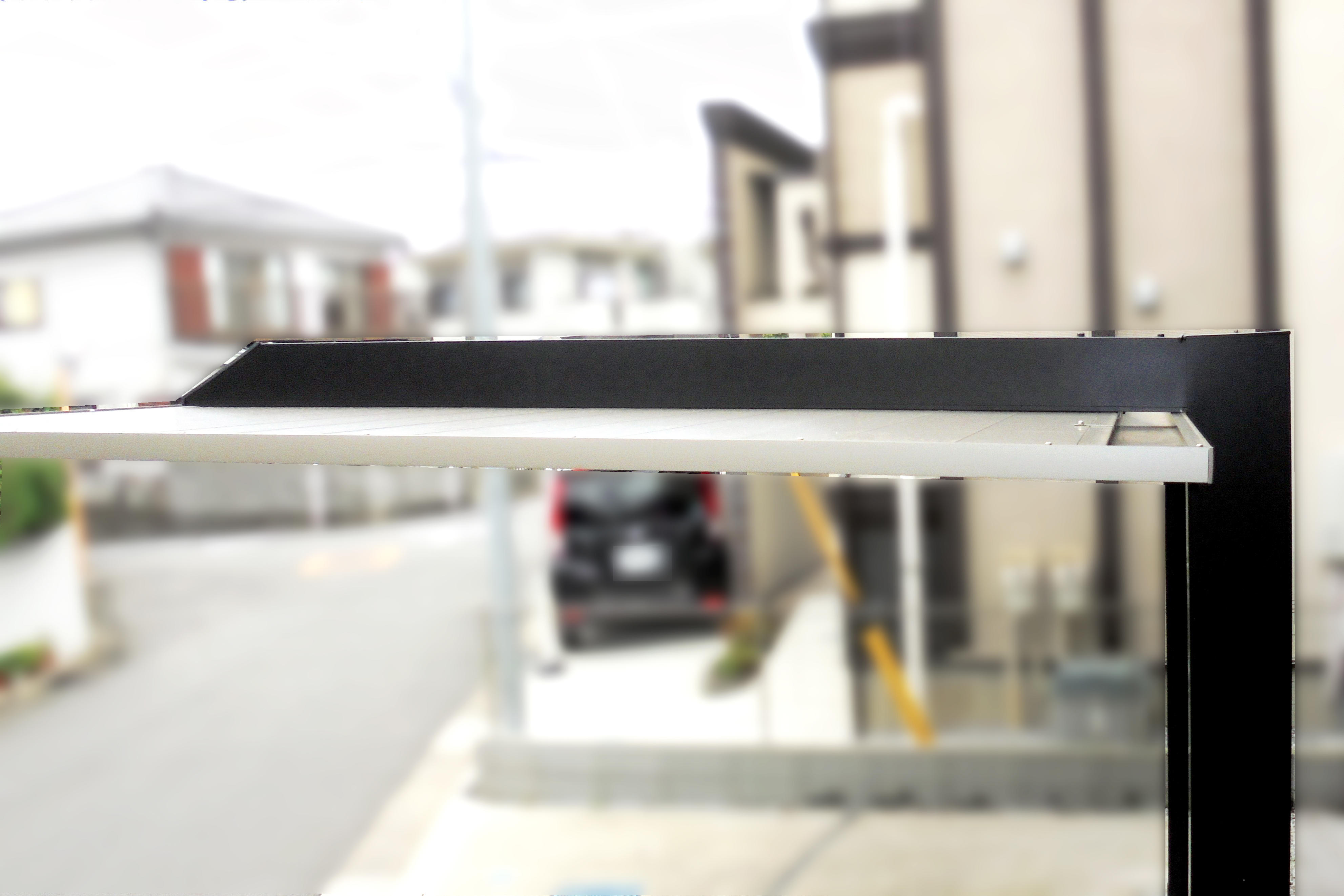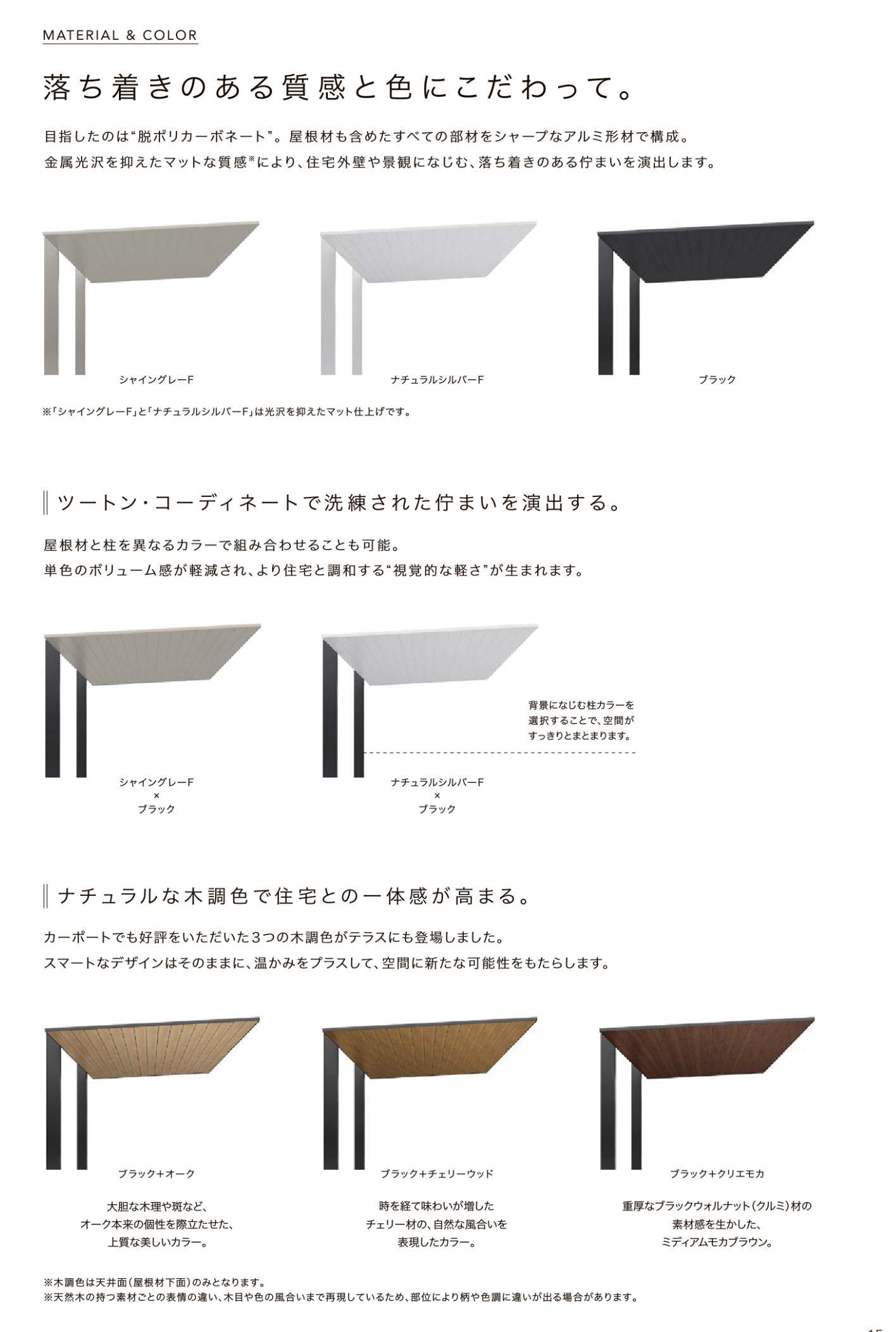 今回選択したカラーは真ん中に右の「ナチュラルシルバーF+ブラック」屋根部分は金属光沢を抑えたマットな質感のシルバーで、柱はブラック。柱は背景に馴染むカラーを選択すると空間にまとまりがでます。玄関ドア枠のブラックとの統一感があり、住宅に馴染んでいます。