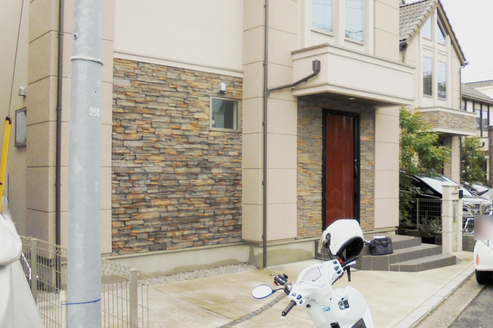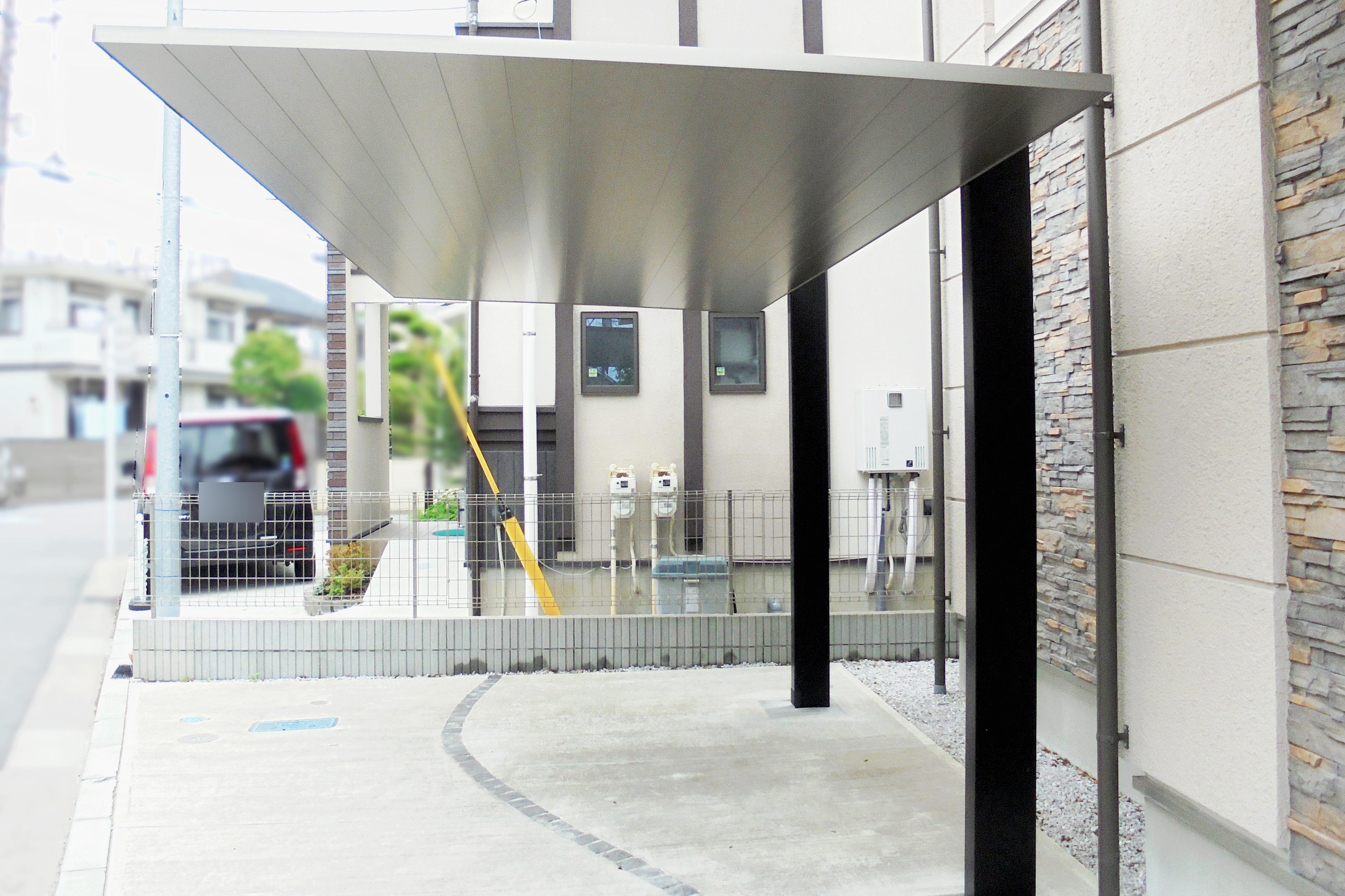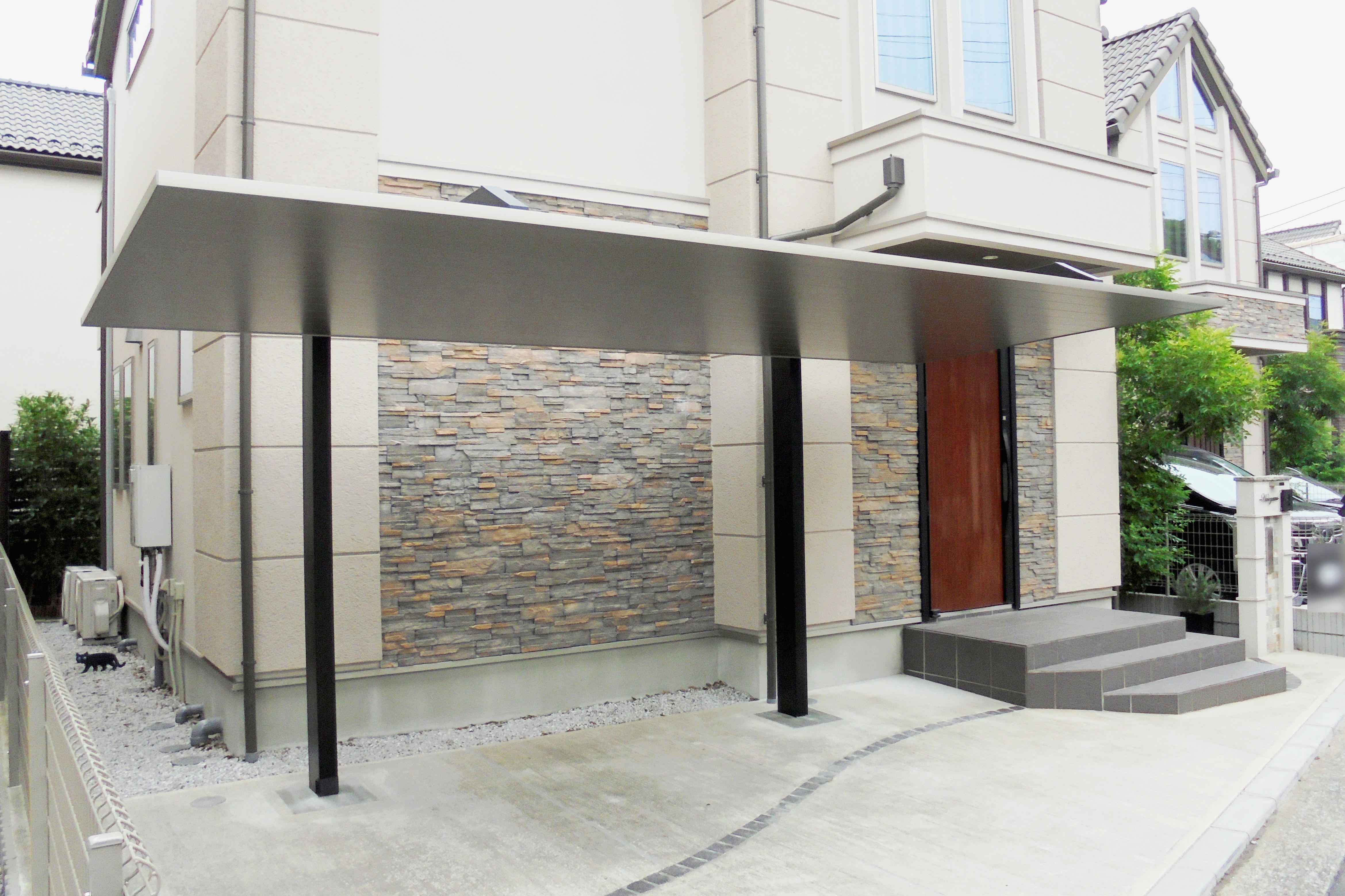 今回選択したカラーは真ん中に右の「ナチュラルシルバーF+ブラック」屋根部分は金属光沢を抑えたマットな質感のシルバーで、柱はブラック。柱は背景に馴染むカラーを選択すると空間にまとまりがでます。玄関ドア枠のブラックとの統一感があり、住宅に馴染んでいます。