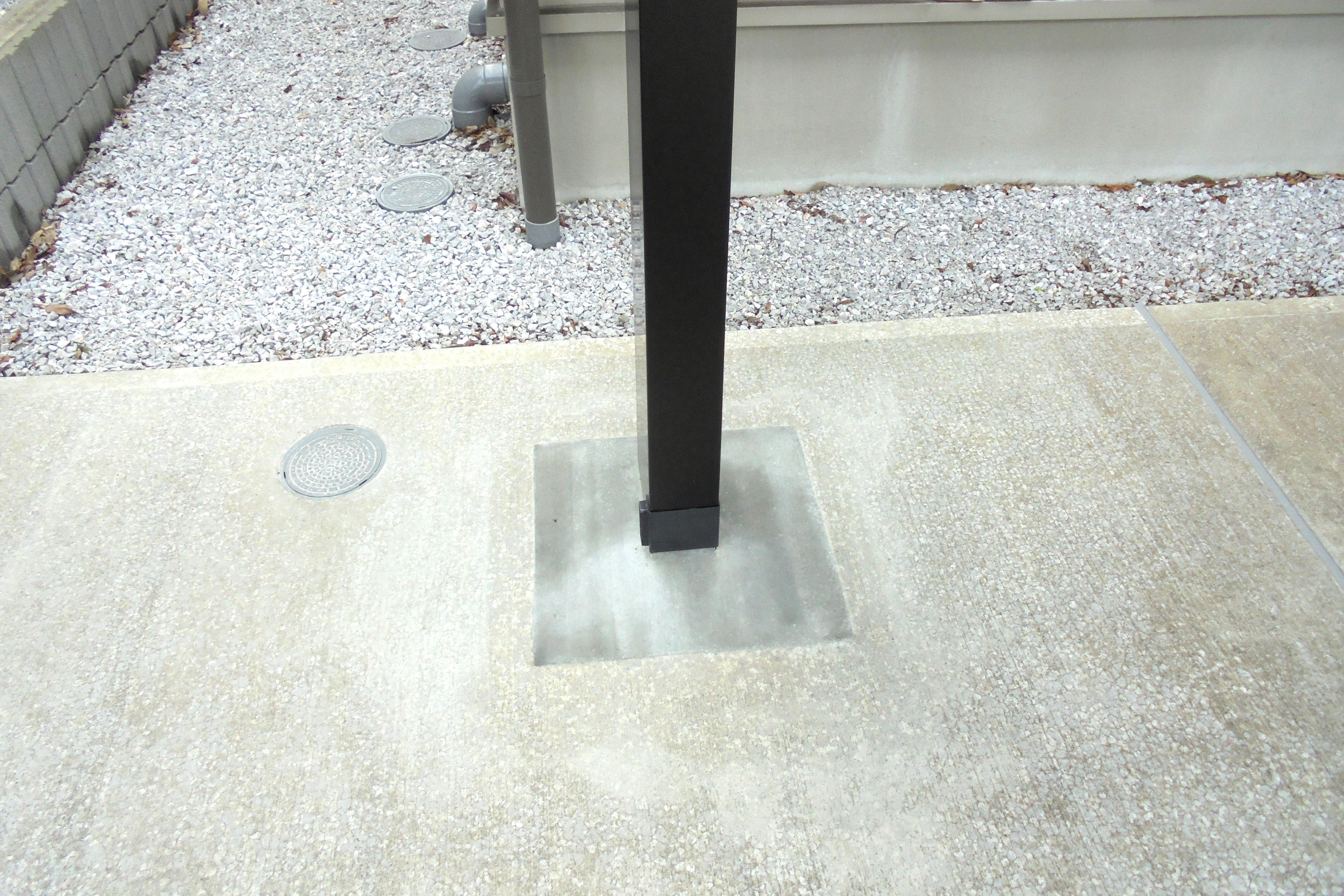既存のコンクリートを支柱を立てる部分だけカッターを入れてから、55㎝の深さまで斫りとります。しっかりと深さを設け、基礎を埋め込んでいます。斫る=コンクリートを削る、穴を開ける、切る、壊すといった作業のこと