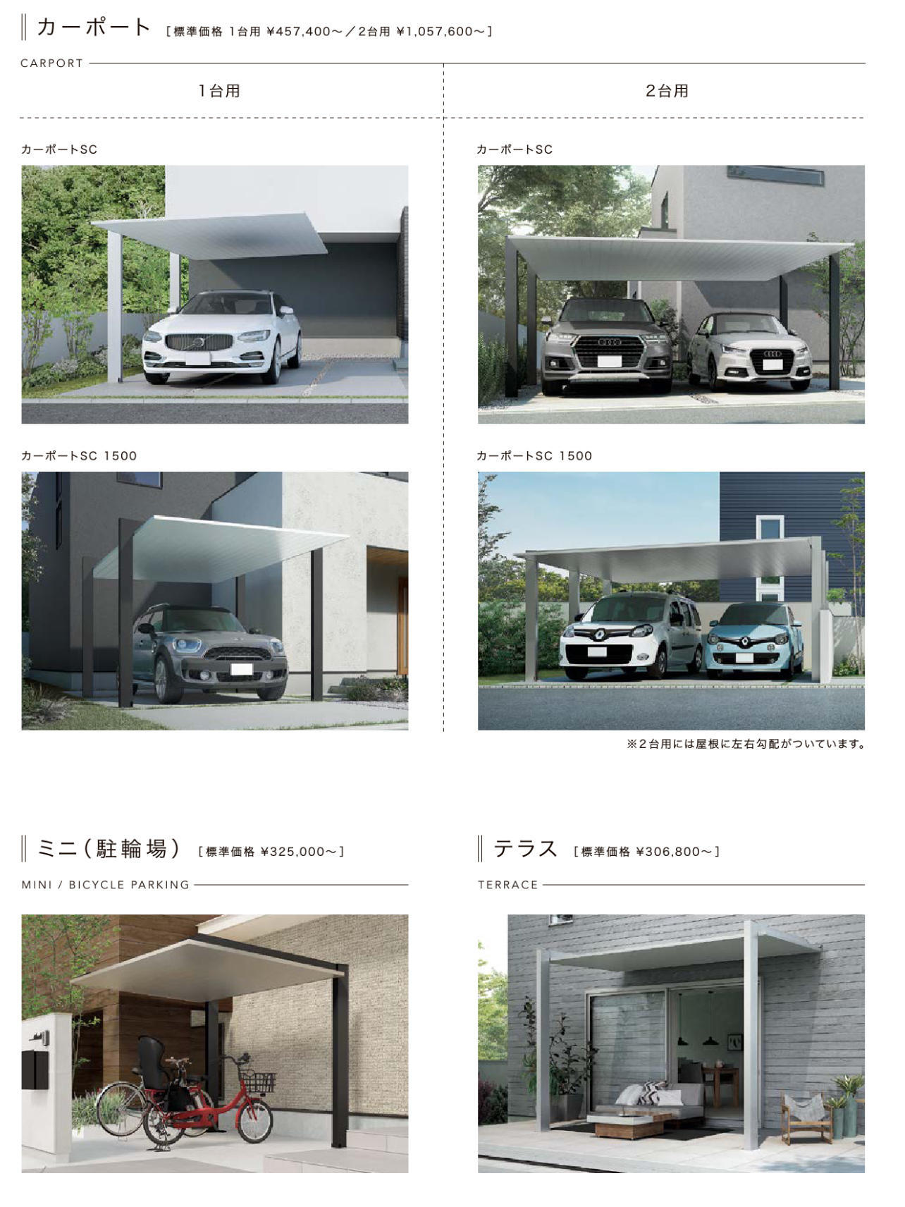 カーポートSCには強度に合わせて選べる2タイプがあり、更に1台用、2台用と選択できます。関連商品をして駐輪場用のミニやテラス用も!