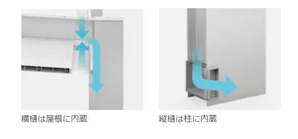 屋根の片側に勾配(傾斜角度は40°)を設けることで雨水の流れを誘導。雨樋(横樋・縦樋)は屋根と柱と一体になっています。(写真:雨樋の構造 参照)そのため、美しくスッキリとしたノイズレスなフォルムが実現しました。