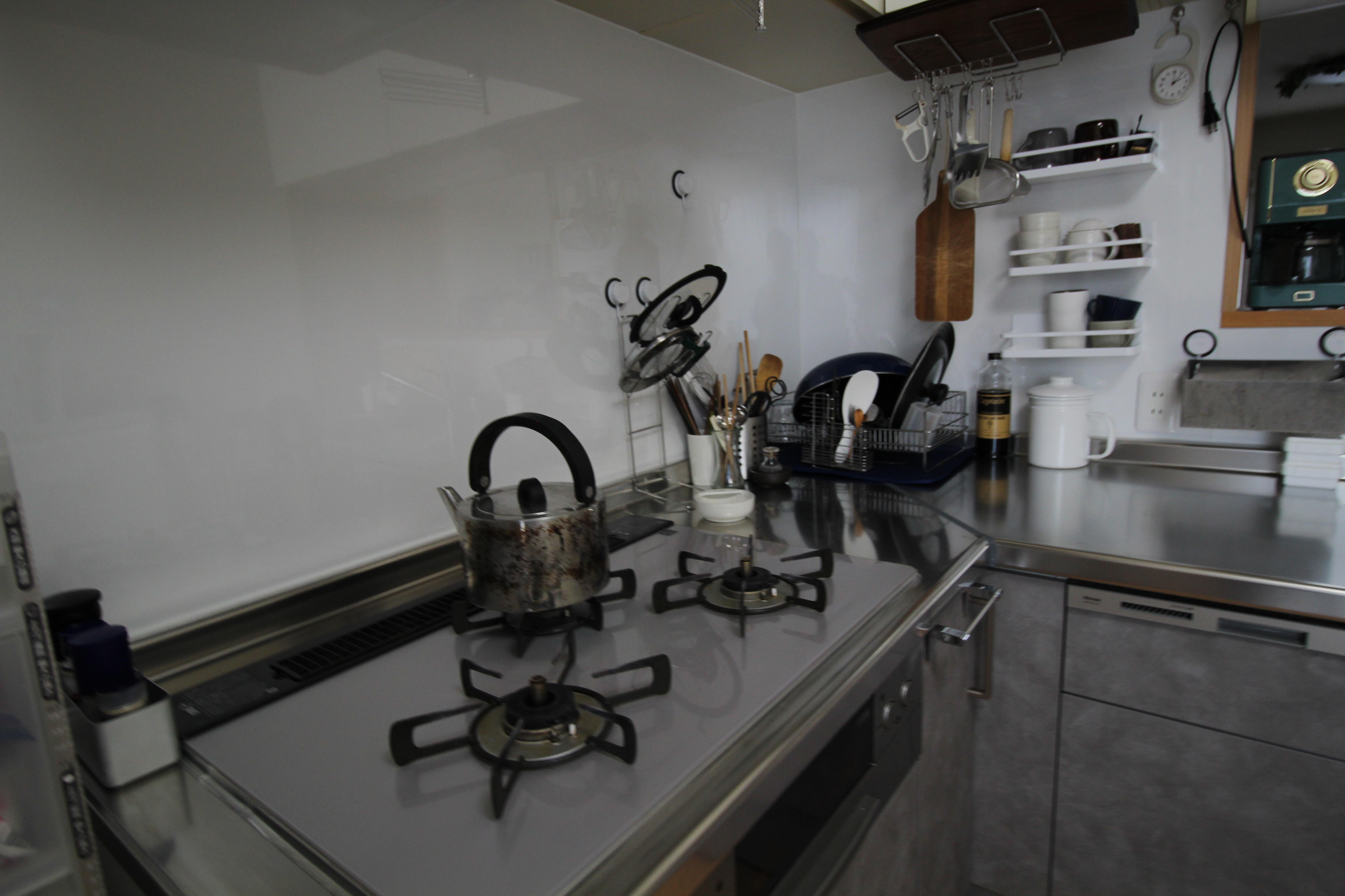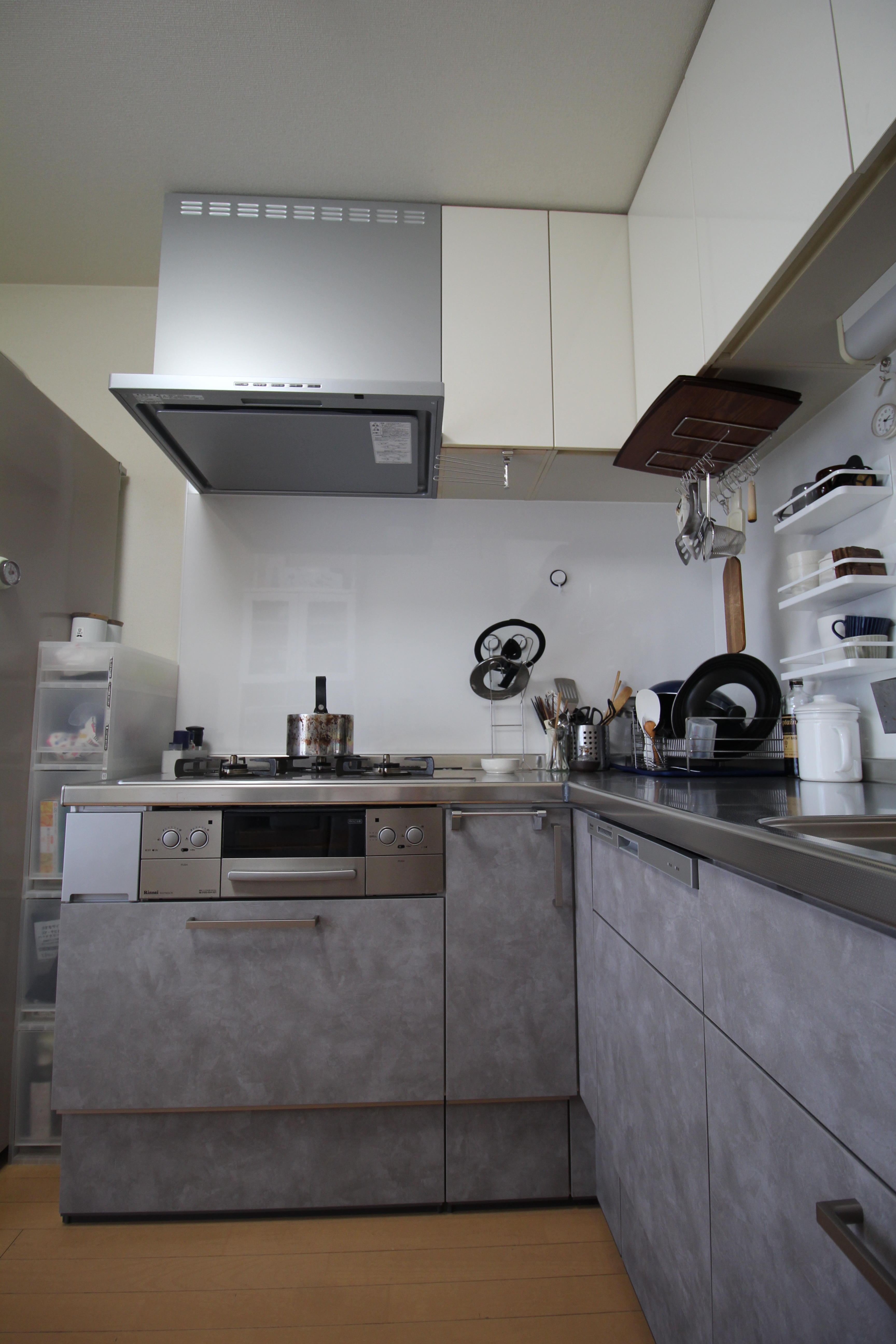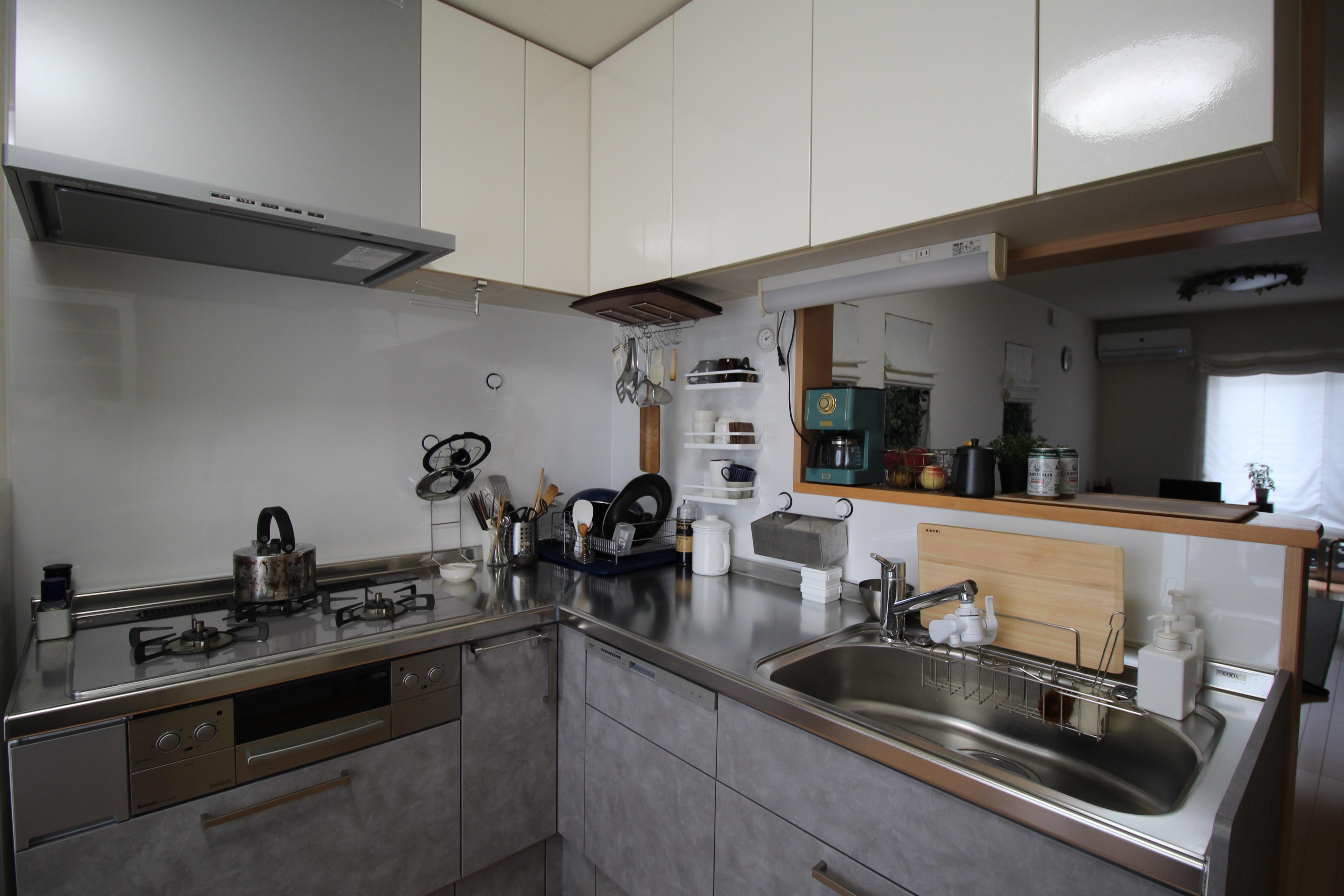 休日はご主人がお料理するとのこと。こだわりカレーを調理する厨房風に、トップはステンレスで!グレーのキッチンでステンレス。それだけでは武骨な印象を受けますが、雑貨との組み合わせでカフェのようなお洒落さも感じられる温もりあるキッチンになっています。