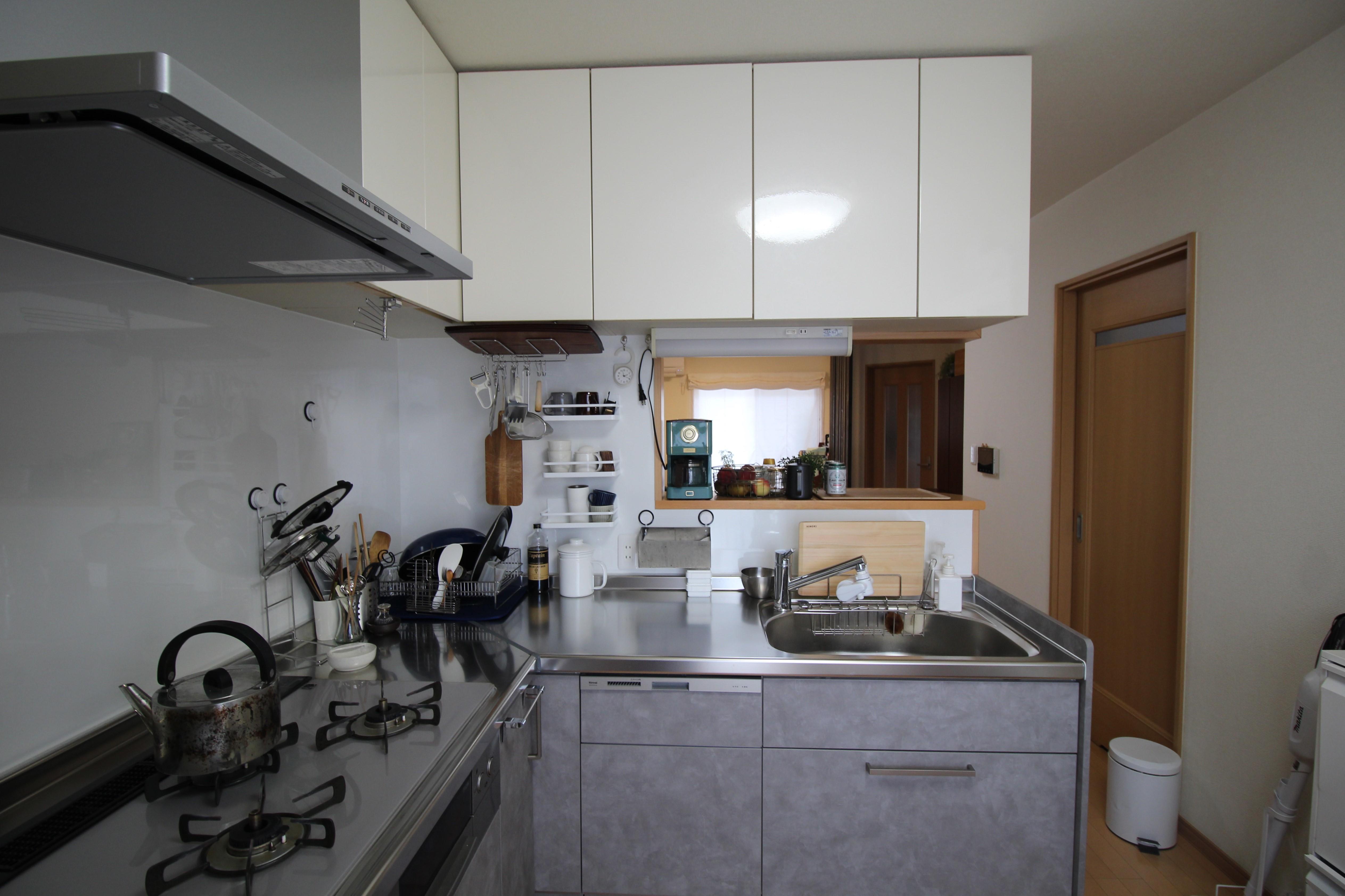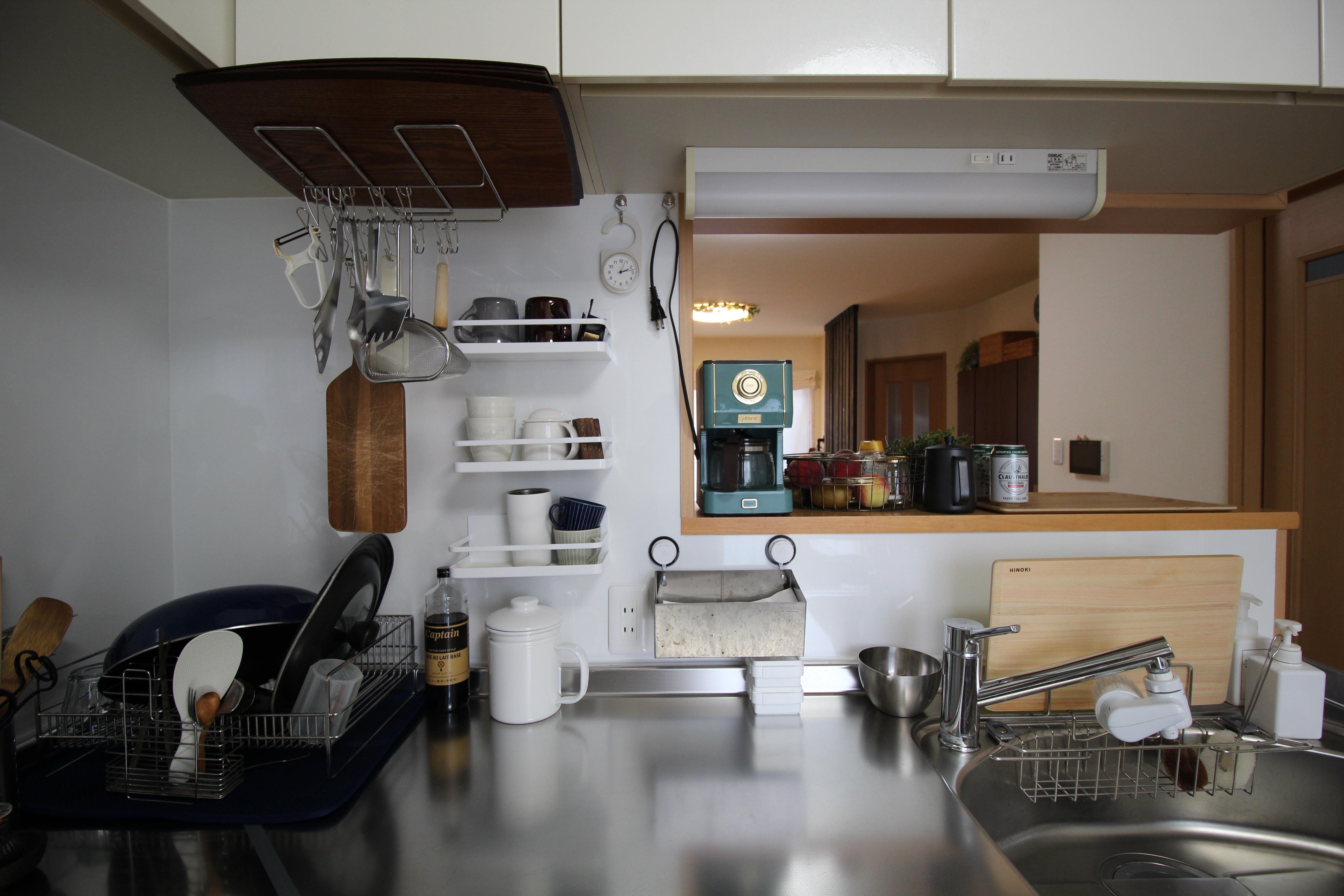 LIXILのシステムキッチンの収納力に加え、壁をマグネットパネルにしたことで磁石でモノを取り付け可能に。吊下げ収納とマグネット式の収納を上手に組み合わせてご使用されています。この写真では見えていませんがコンロ側の壁には鍋蓋を壁掛で収納(他写真参照)。料理の手順も考えられた収納になっています。