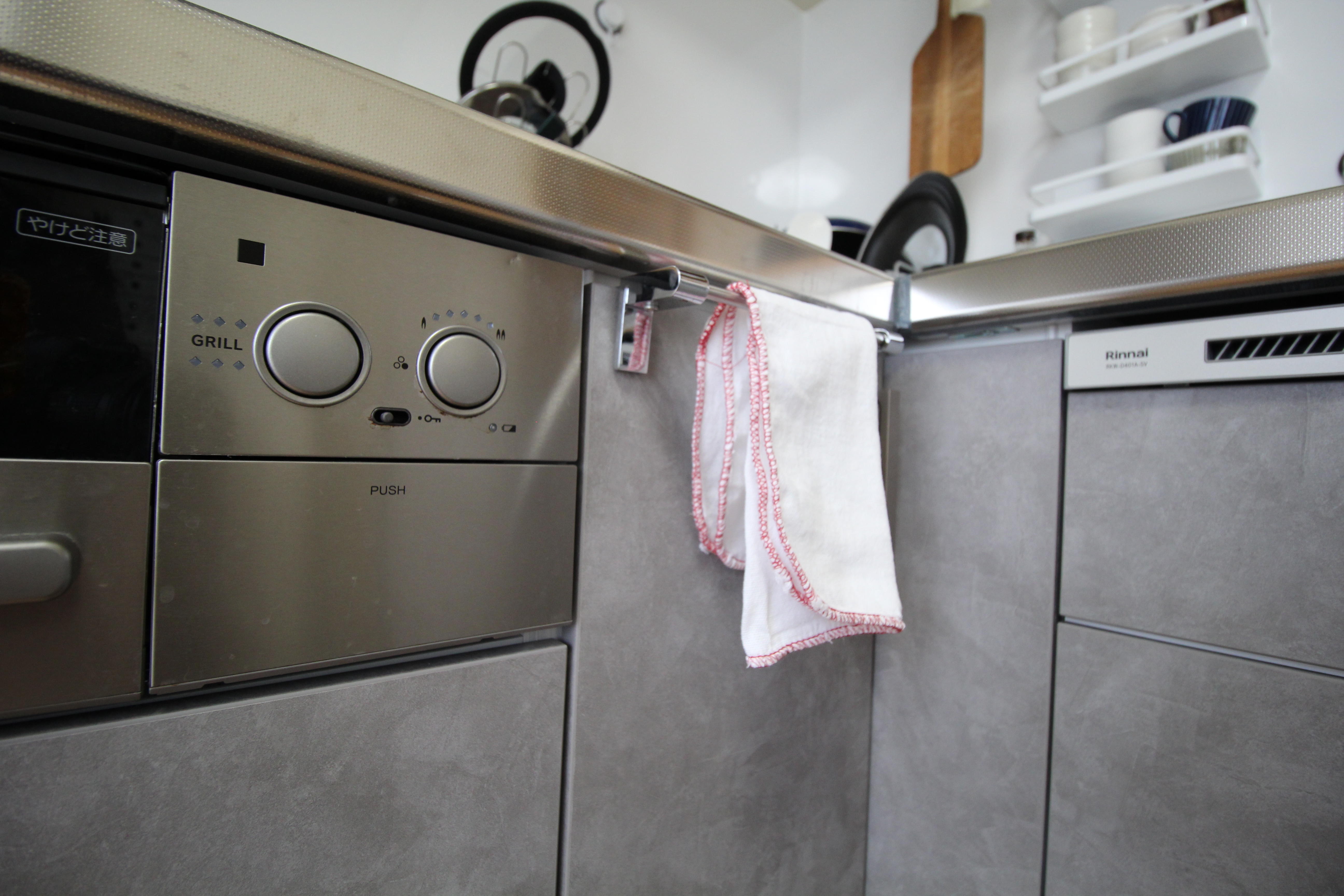 お客様があとから購入して設置したタオル掛け。扉に引掛けるタイプで、ネジ等を使用しないので扉を傷つけることもありません。便利ですよね!わたしも自宅で類似品ではありますが使用しています。