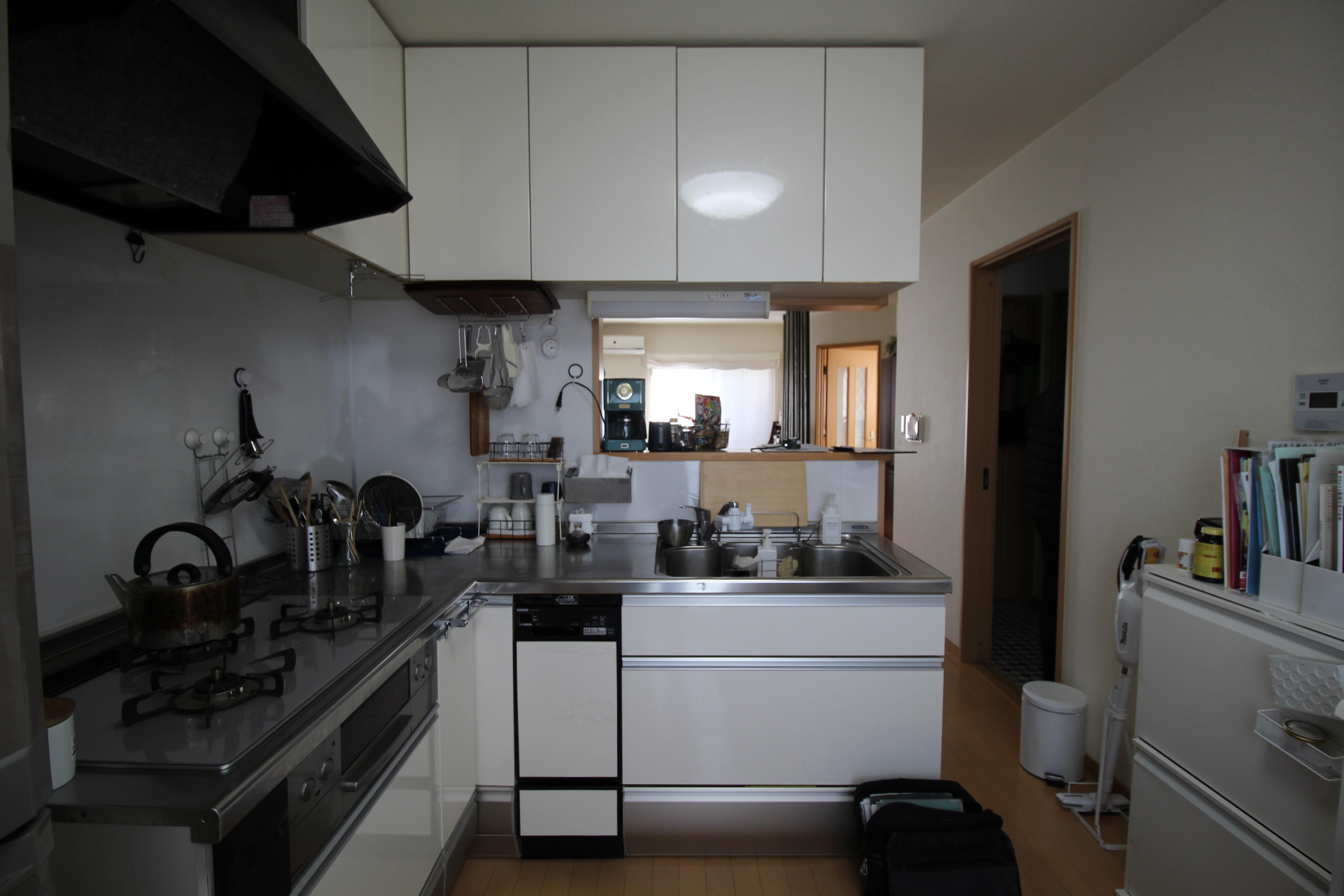 レンジフードは加熱調理機との連動式。収納はスライド式。コーナーのキャビネットだけ開き戸仕様になっています。ビルトイン食洗機は深型。浅型では入らない大きな食器も入ります。浅型のものより値段は高くなりますが、個人的にはお金をかけることをお勧めしたい箇所!