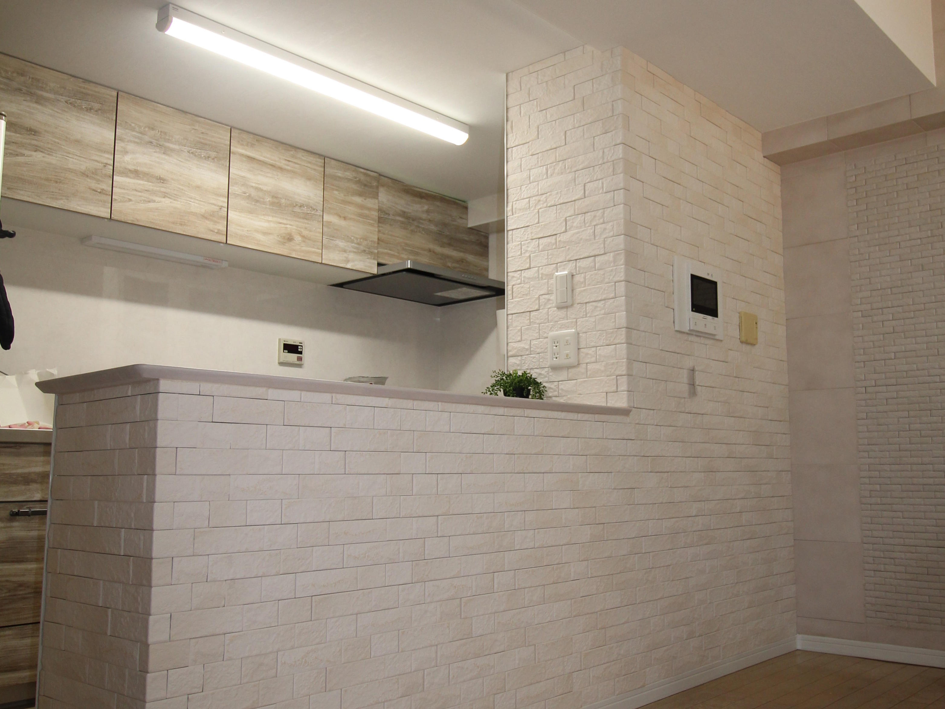 カウンター棚のサイドや壁にもエコカラットプラスを取り付けました。ここでのこだわりはコーナー角。平らな板状のものを貼り合わせると角に繋ぎ目がきてしまいますが、L字状のものを用いることで見た目を美しく!L字のモノは少しお値段が張りますが、人が集まる憩いの場、ダイニングキッチンですので、贅沢に仕上げました。エコカラットプラス:グラナスヴィスト (色)ホワイト