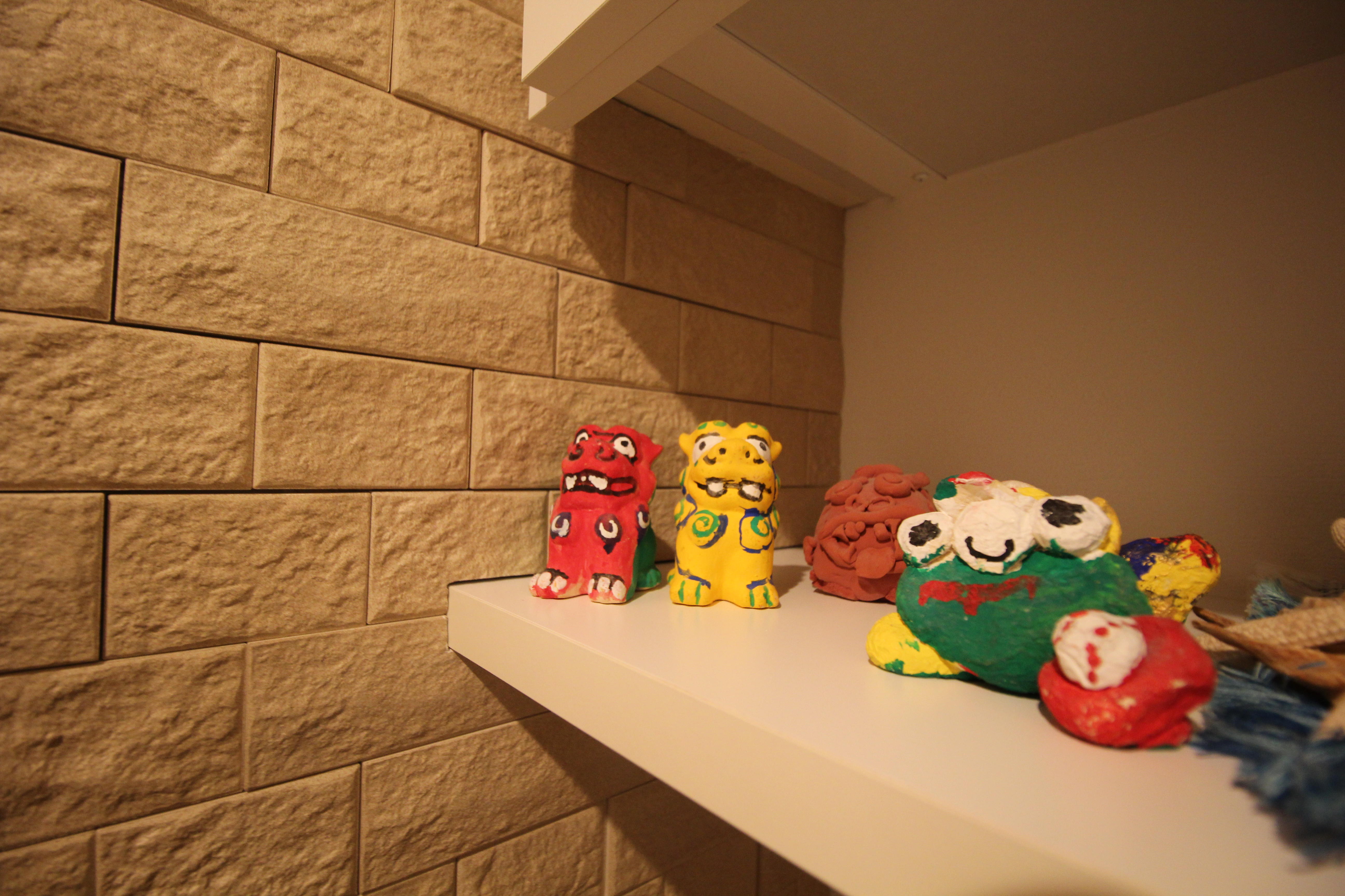 もう片面は凹凸のある立体感あるデザインを採用。凹凸の有り無しや色合いによって部屋の印象がかわります。置物のシーサーはお子様の手作りだそう。上手すぎませんか!エコカラットプラス:グラナスヴィスト (色)ベージュ
