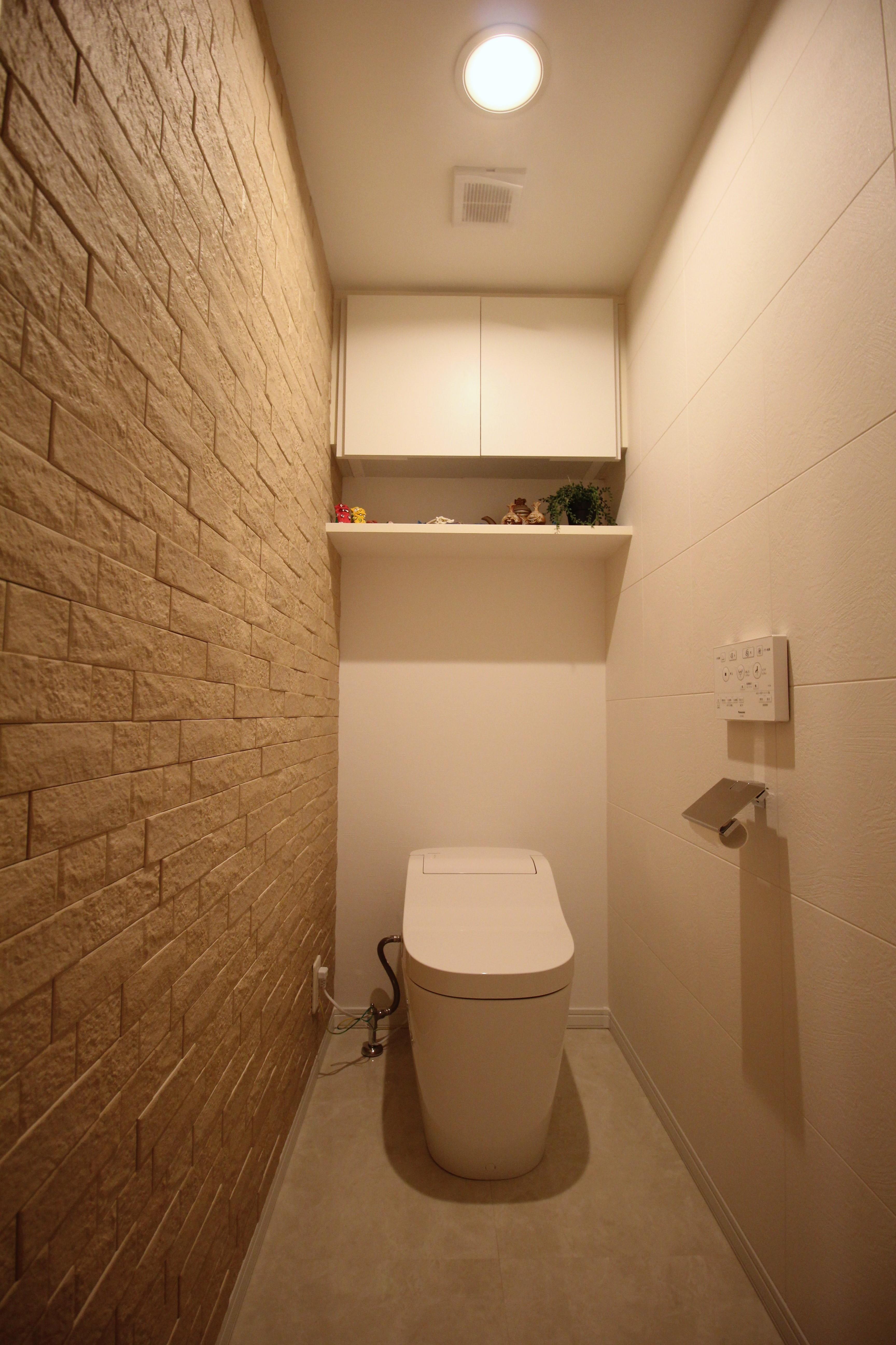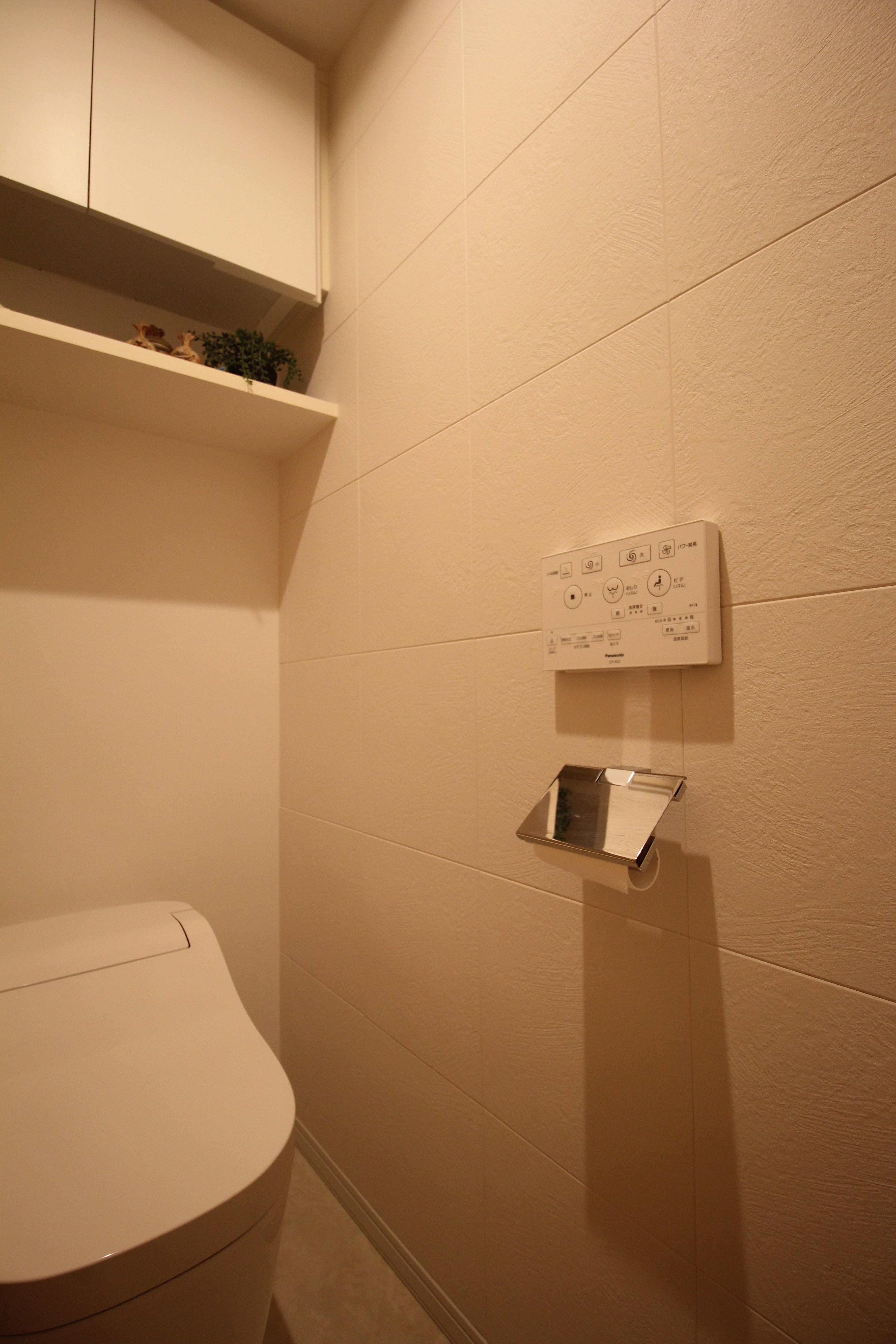 リモコンやペーパーホルダーを取り付ける面には、機具の取り付けを考慮し凹凸の少ない滑らかな表面のエコカラットプラスを採用。ちなみに吊戸棚とカウンターも新しいものに付け替えています。エコカラットプラス:フェミーナ (色)ホワイト吊戸棚:LIXIL アッパーキャビネット TSF-415 間口調整型 (色)ホワイトカウンター:Panasonic インテリアカウンター VERITIS シートタイプ (色)しっくいホワイト